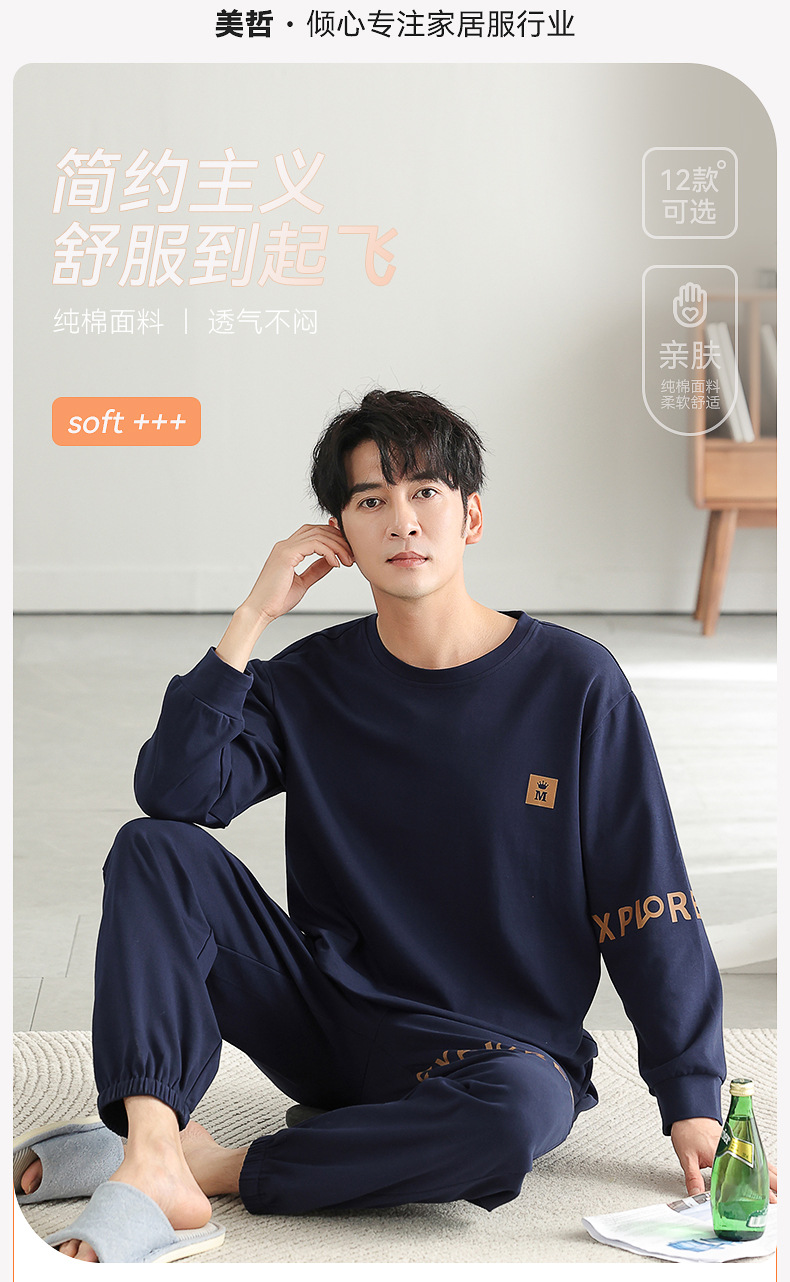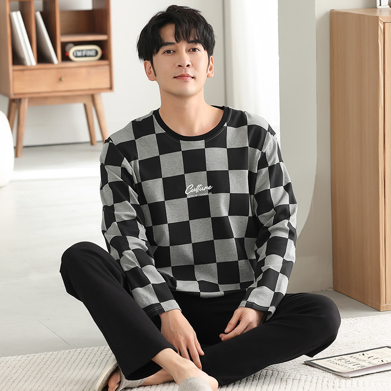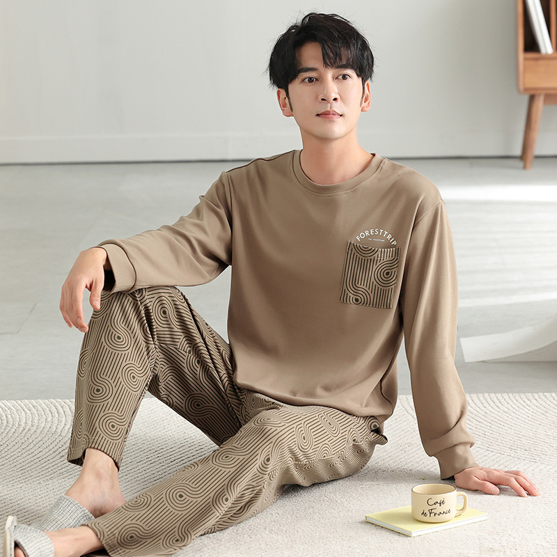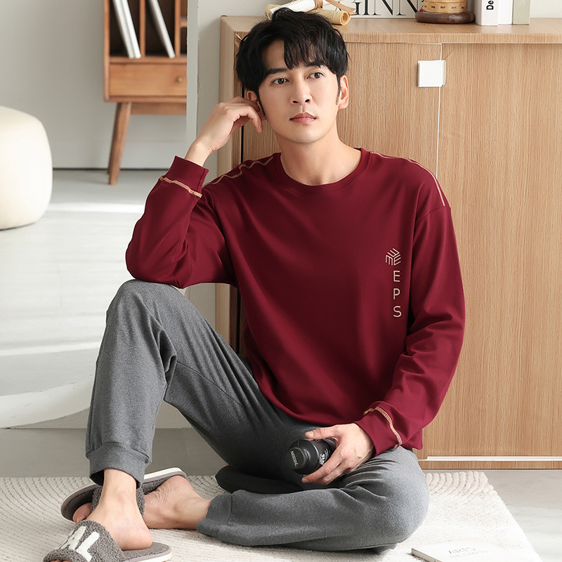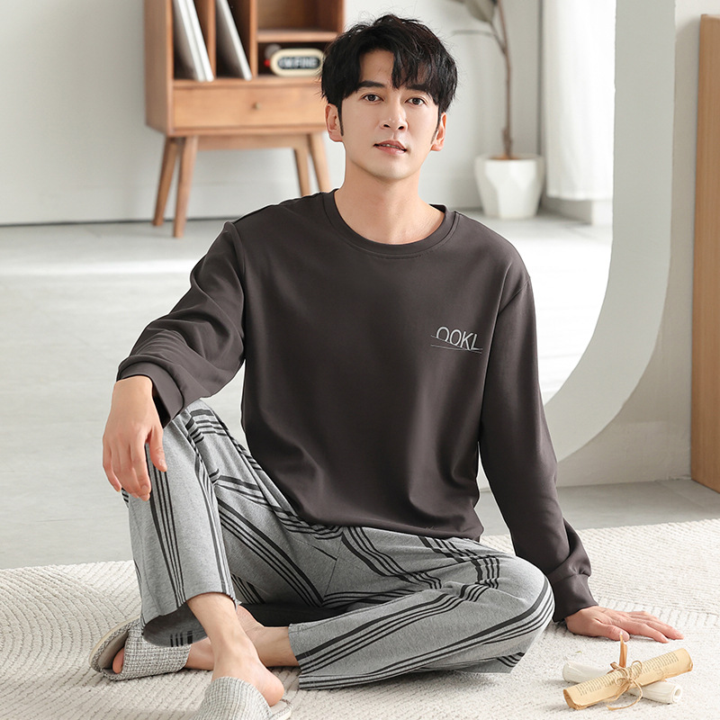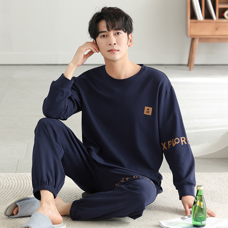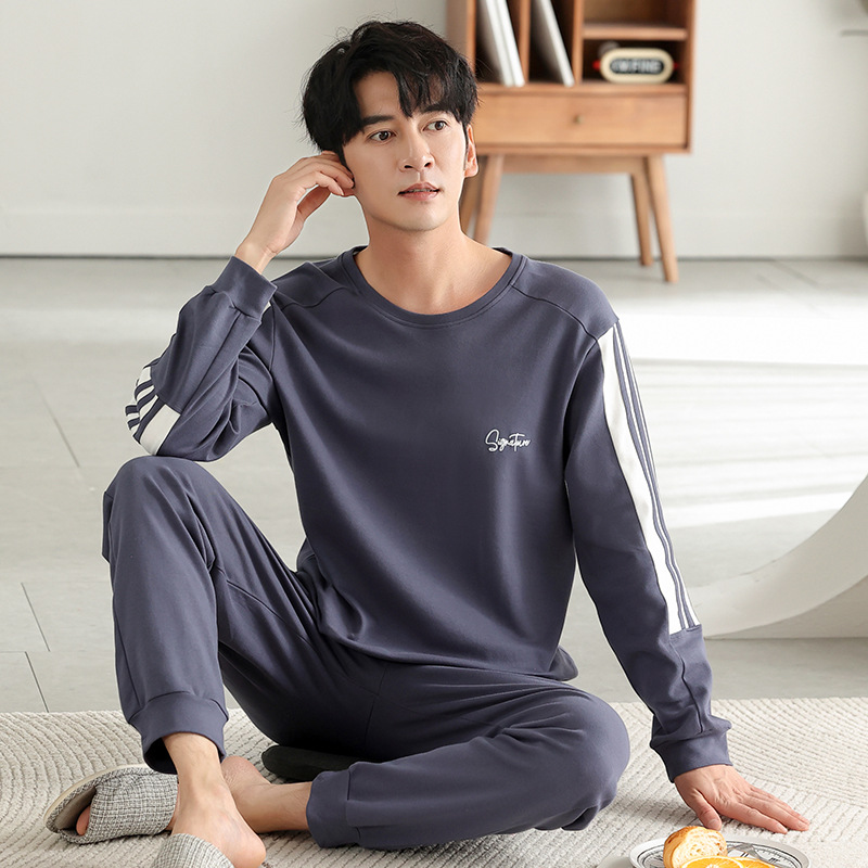 가을과 겨울 세트 순면 남성 잠옷 간단한 라운드 넥 홈 편안한 캐주얼 겉옷 긴 소매 플러스 사이즈 가정 옷스토어 가기