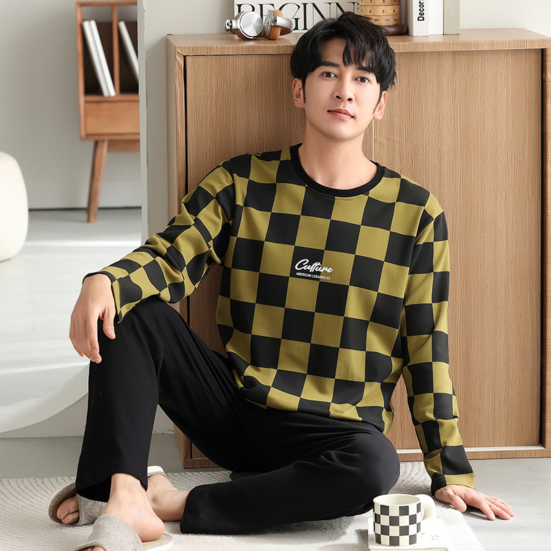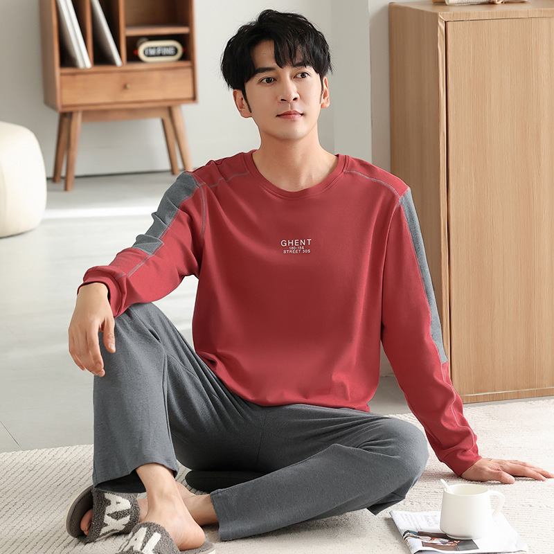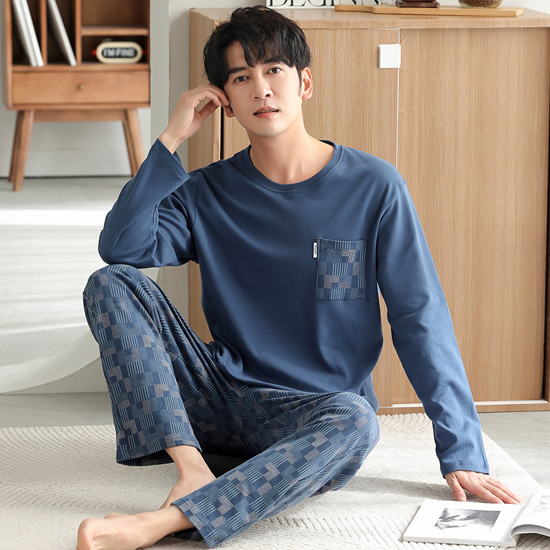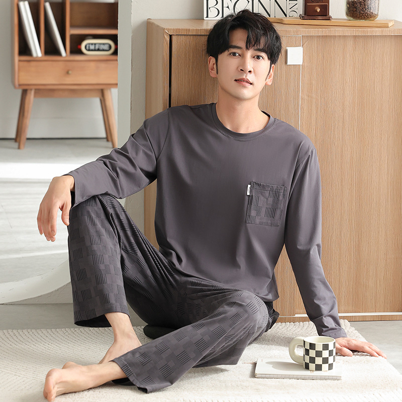 가을과 겨울 세트 순면 남성 잠옷 간단한 라운드 넥 홈 편안한 캐주얼 겉옷 긴 소매 플러스 사이즈 가정 옷