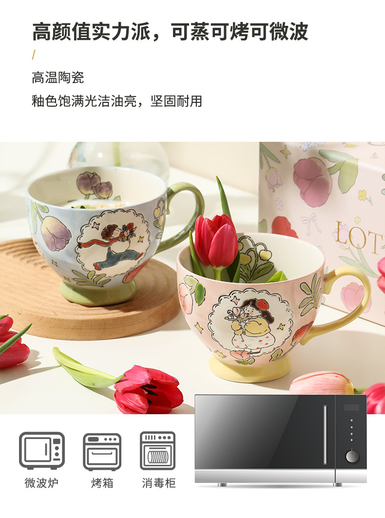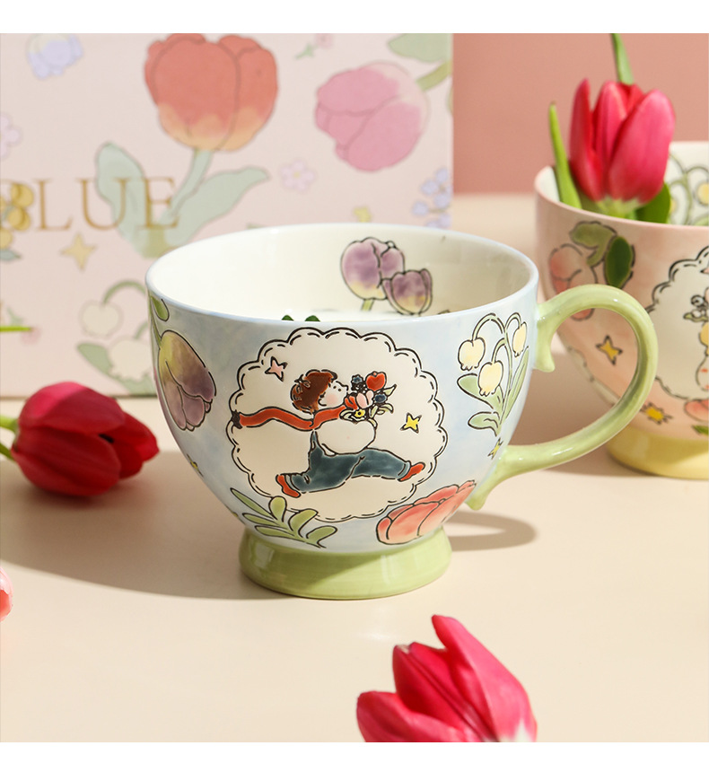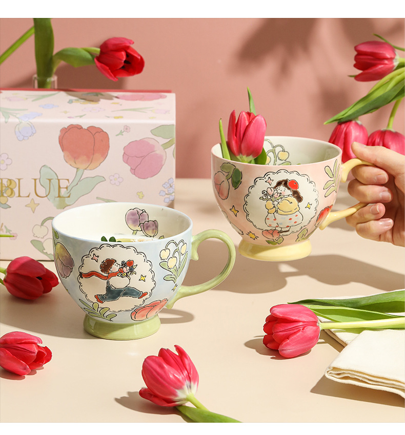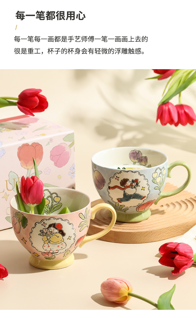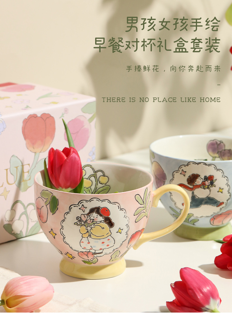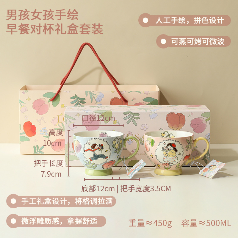 손으로 그린 아침 식사 컵 선물 상자 세트 세라믹 머그잔 연인 컵 창조적 인 연인