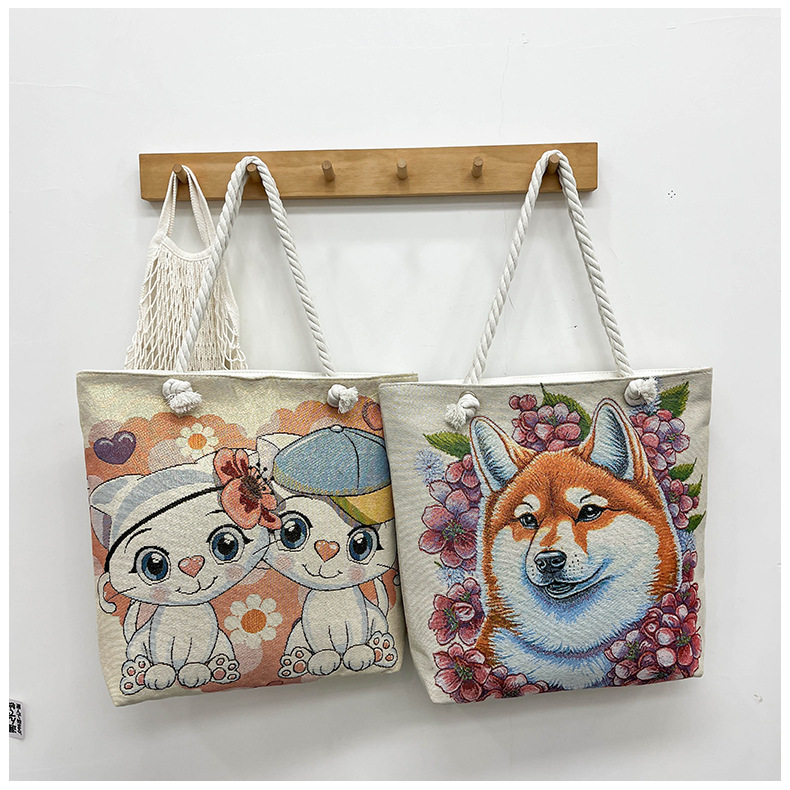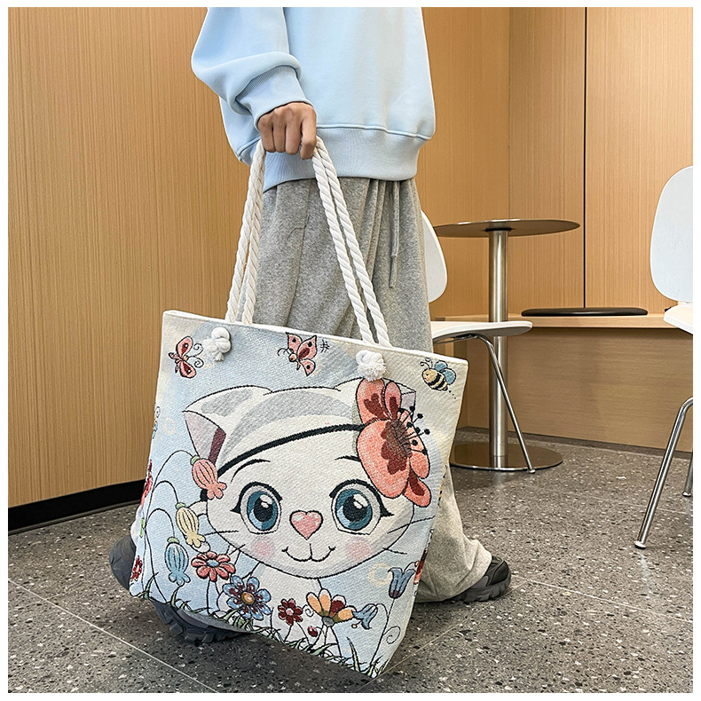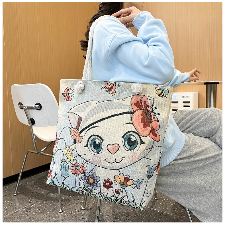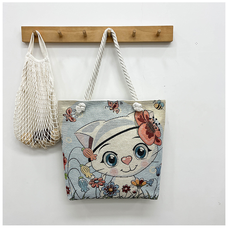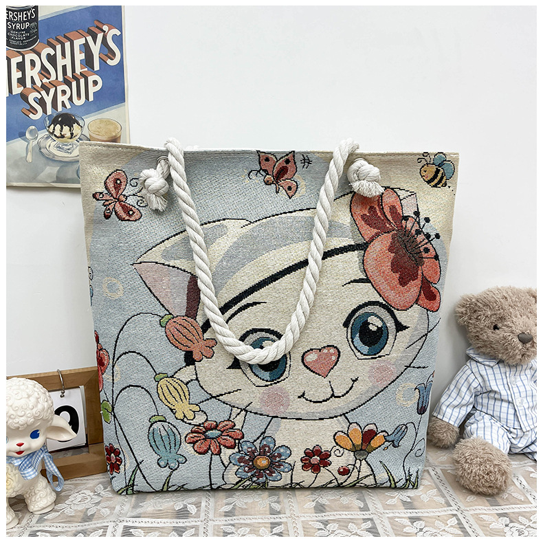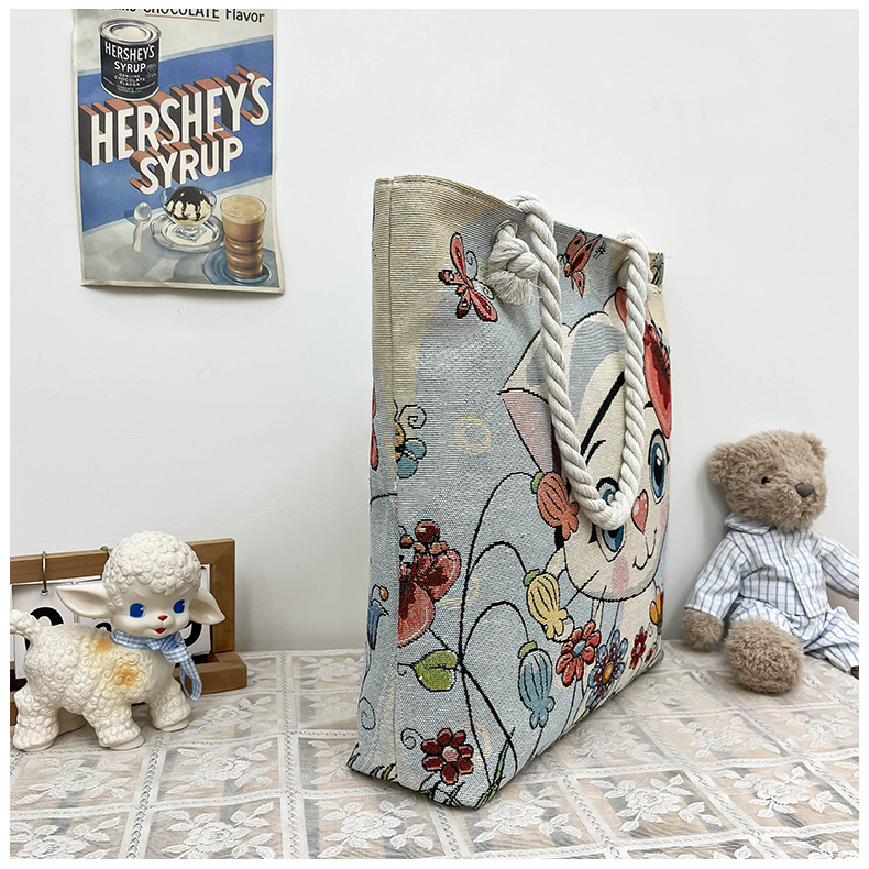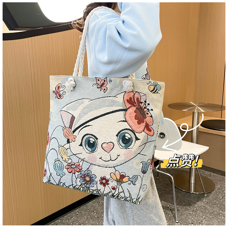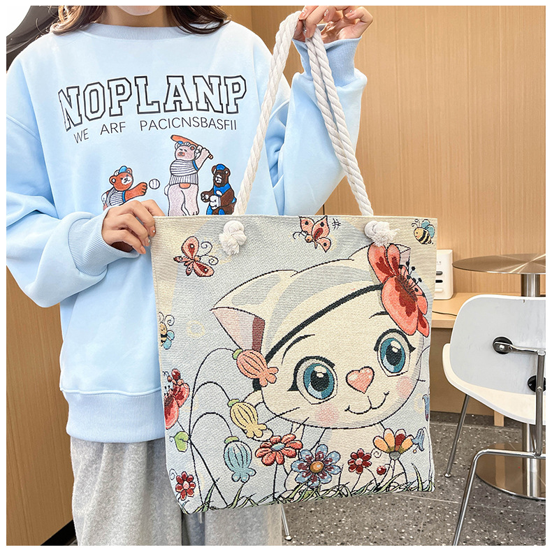 귀여운 신상품 만능 캔버스 가방 대용량 싱글 숄더 휴대용 만화 대용량 골드 실크 자수 대마 로프 빅 토트