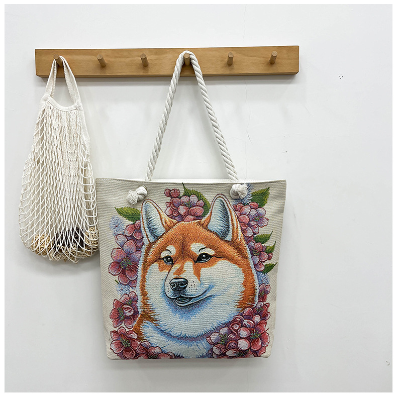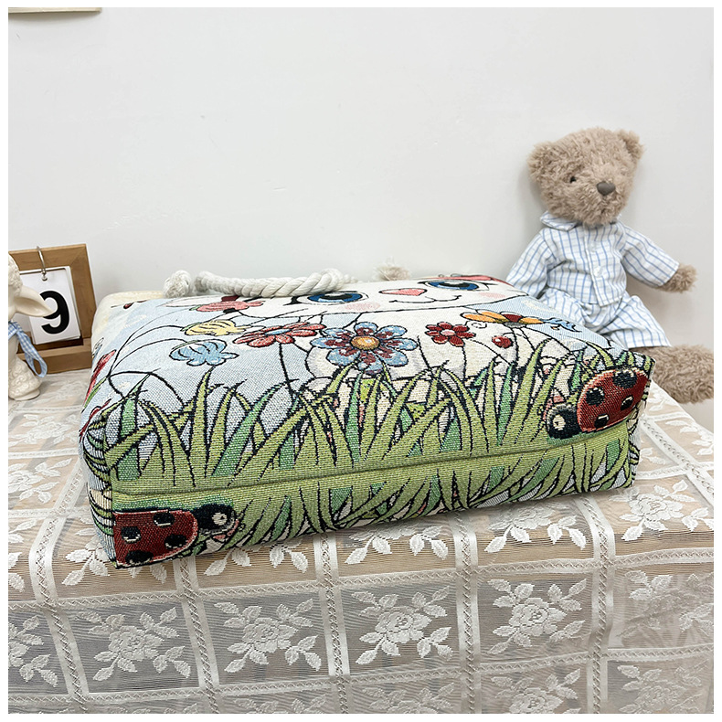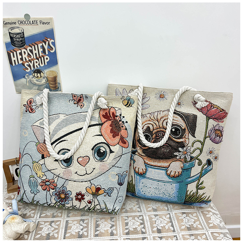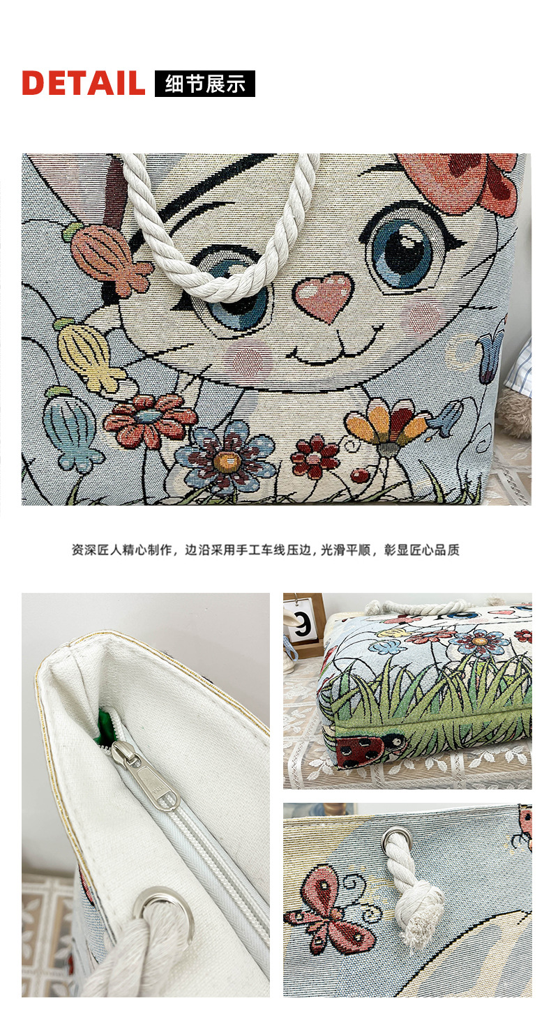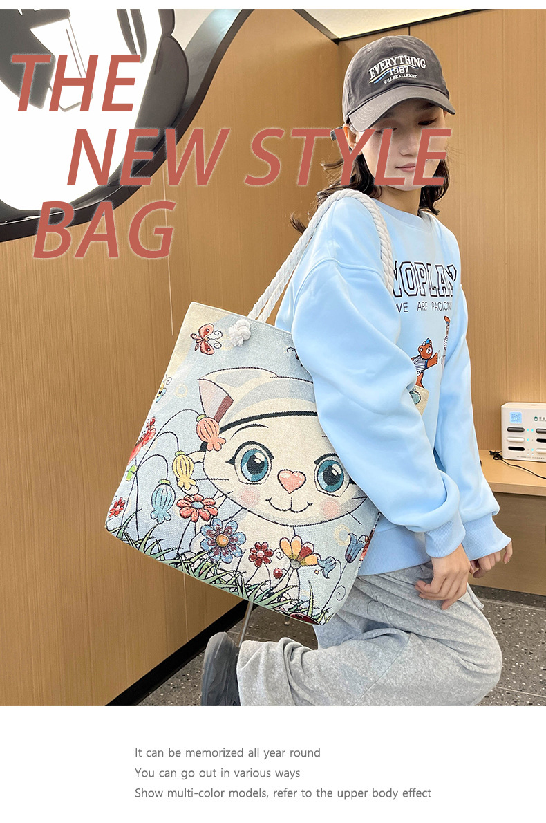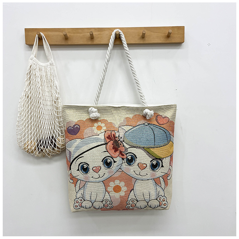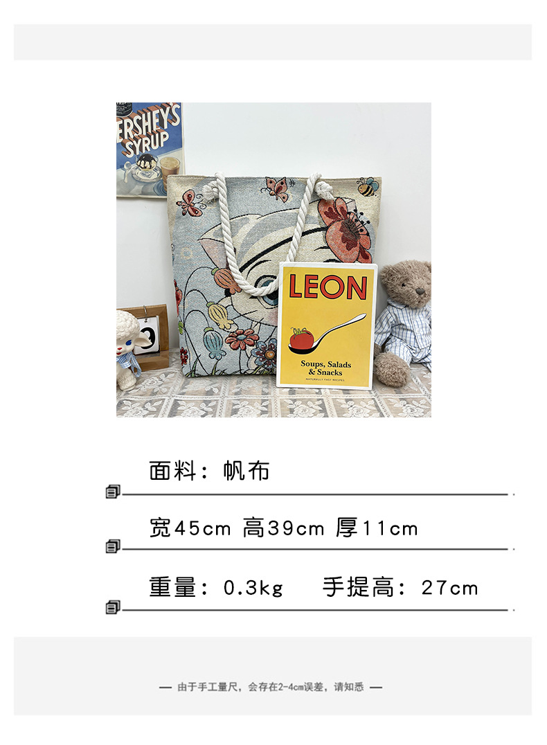 귀여운 신상품 만능 캔버스 가방 대용량 싱글 숄더 휴대용 만화 대용량 골드 실크 자수 대마 로프 빅 토트