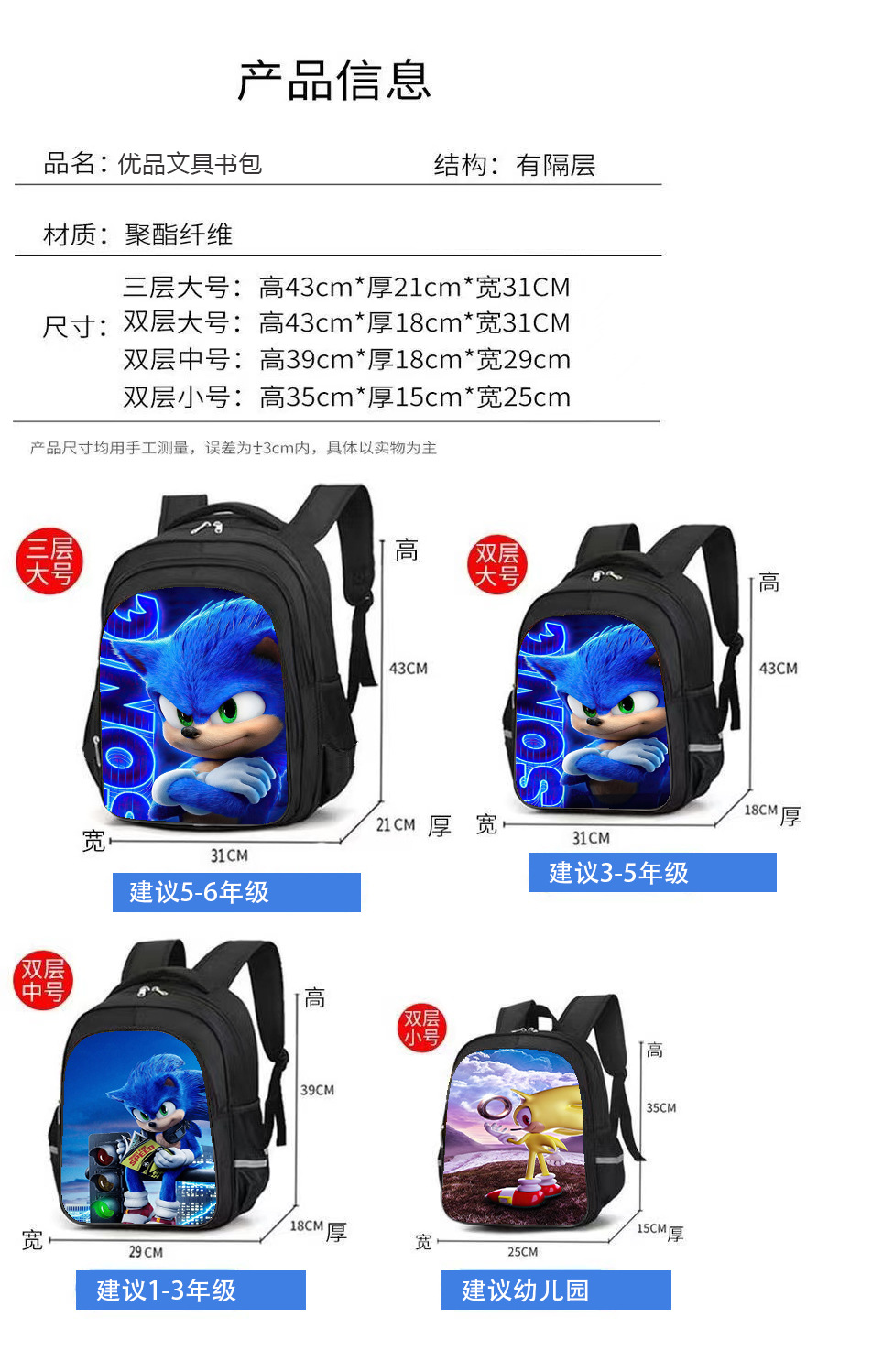 소닉 더 헤지혹 어린이 유치원 감압 및 부담 완화 책가방 초등학생 1-6 세 대용량 배낭