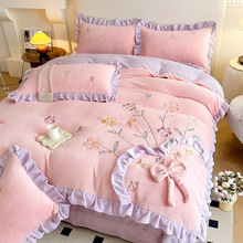 2023新款韩版全消光牛奶绒四件套加厚保暖荷叶边套件花边刺绣被套