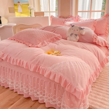 2023新款保暖加厚韩式双层蕾丝花边牛奶绒夹棉床盖四件套纯色被套