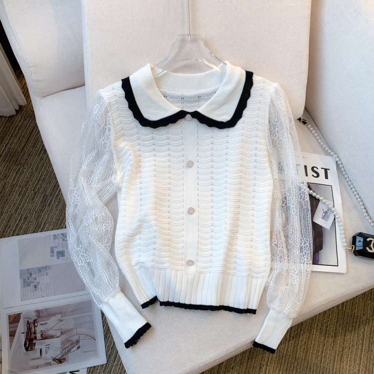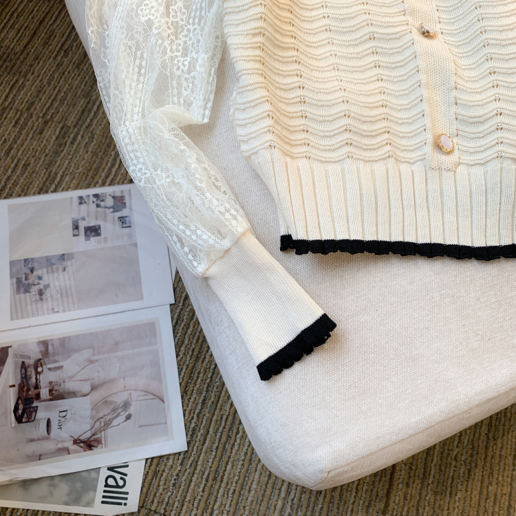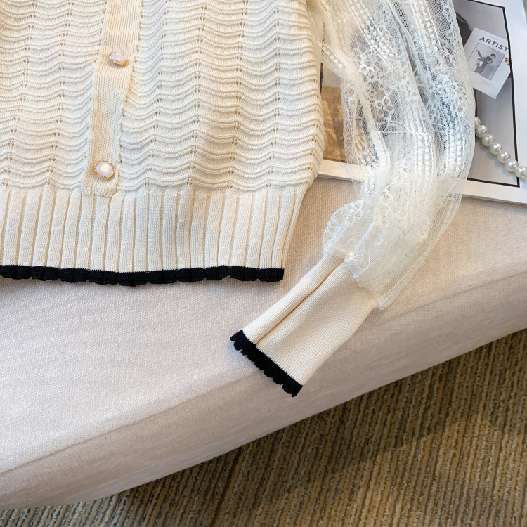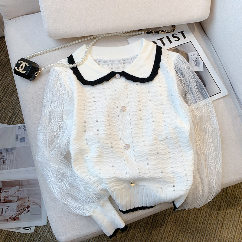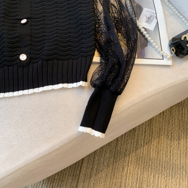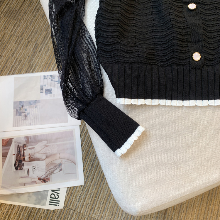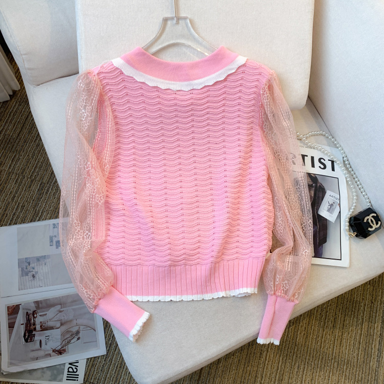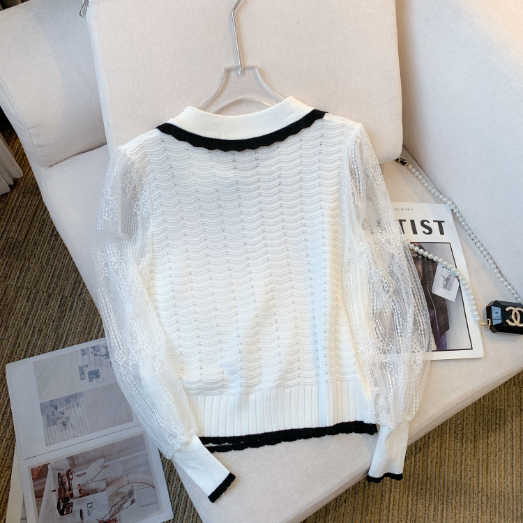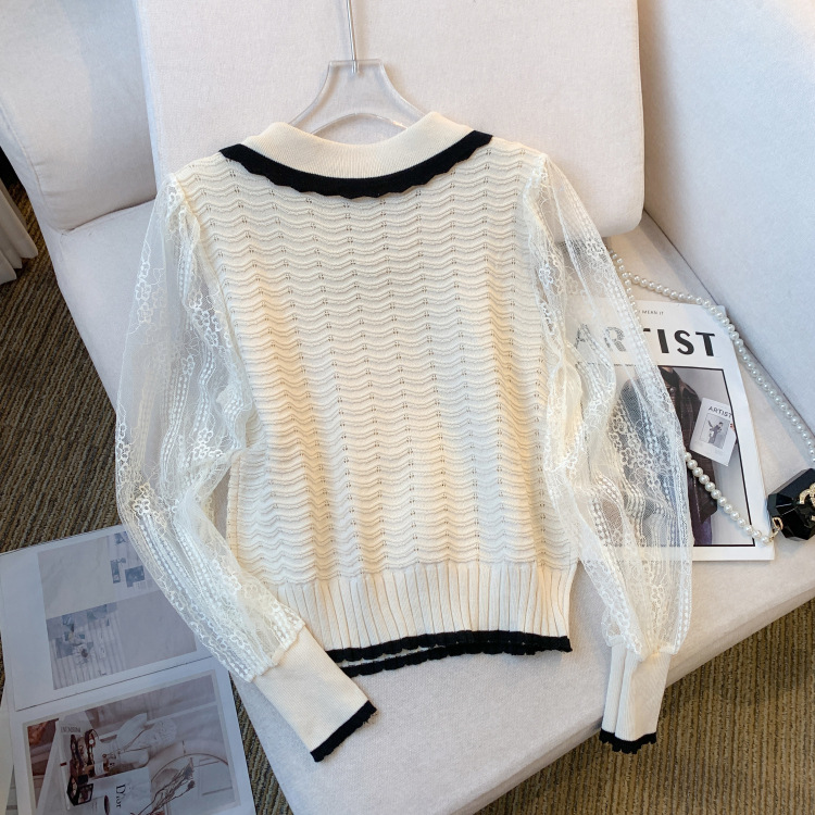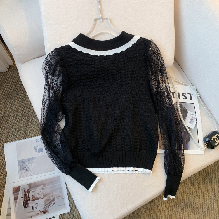 진짜 샷 재고 가을 새로운 한국 스타일 달콤한 우아한 쉬폰 스티칭 탑 세련된 스웨터