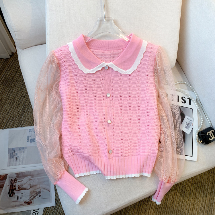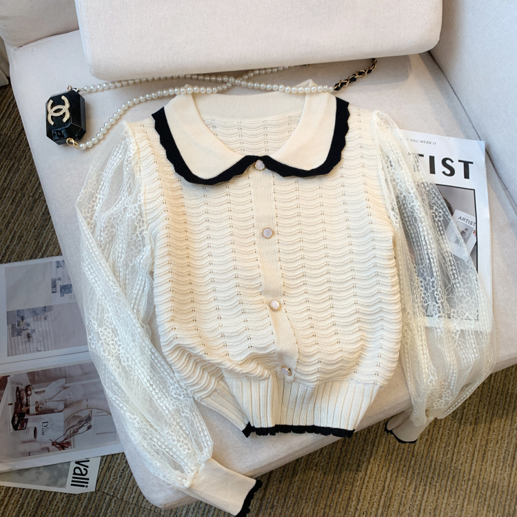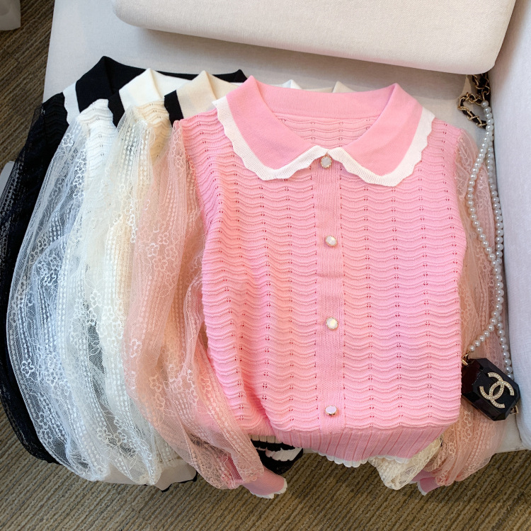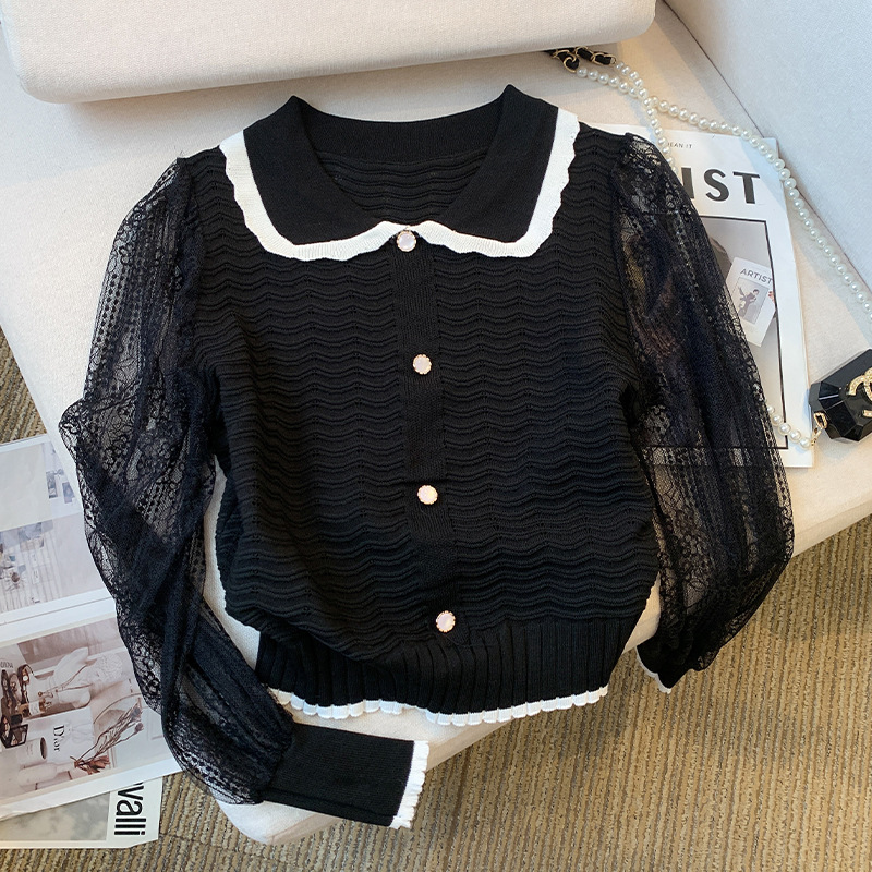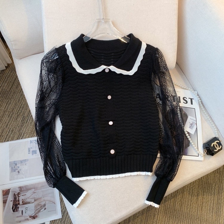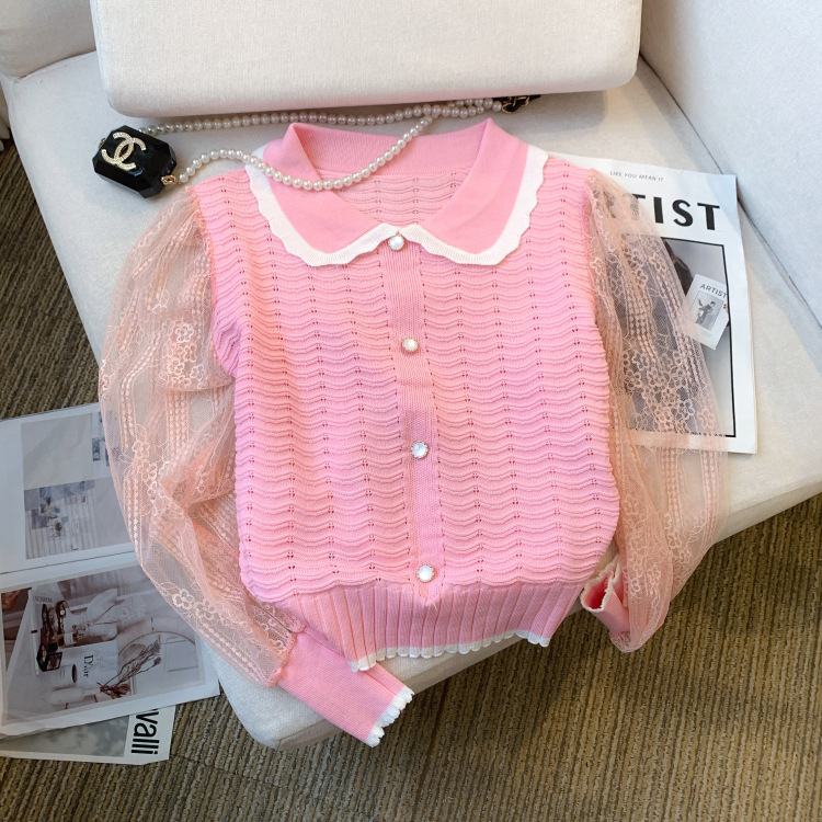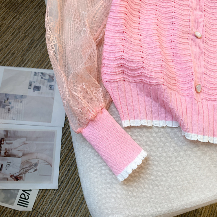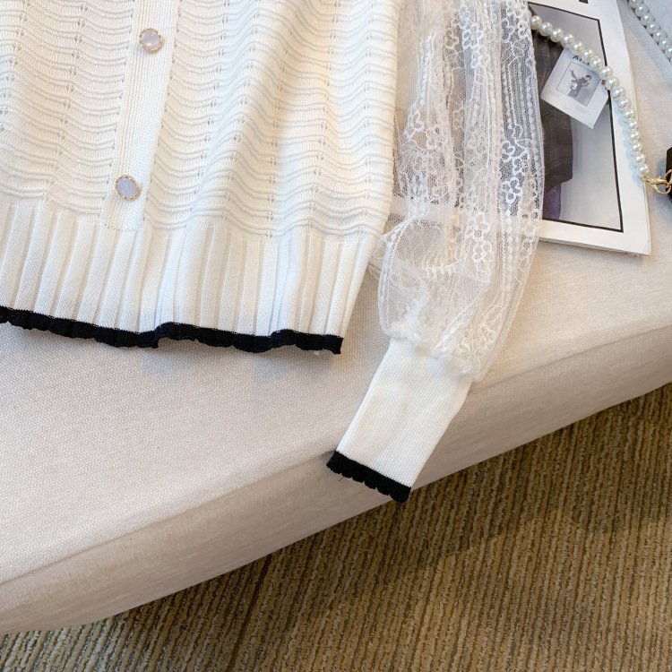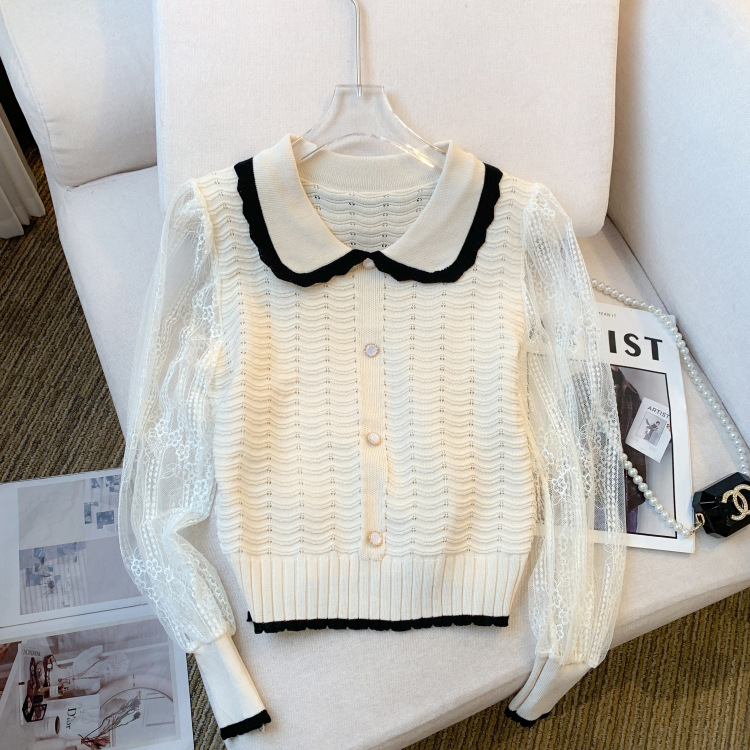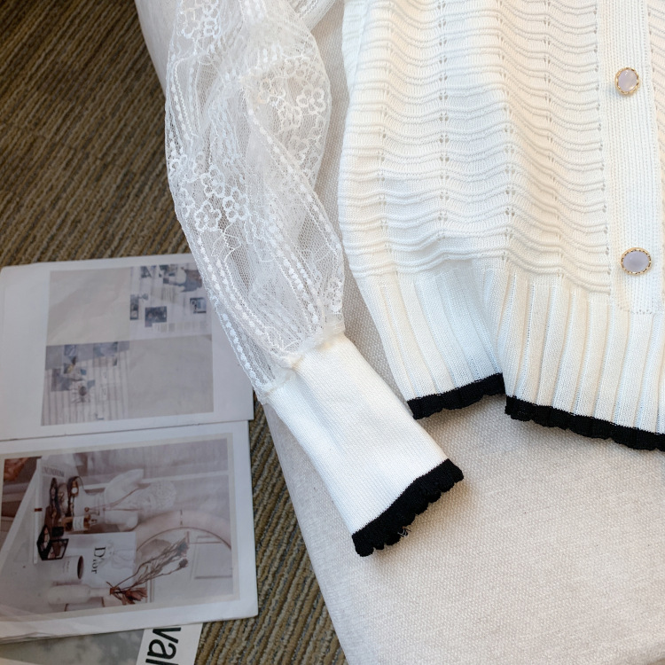 진짜 샷 재고 가을 새로운 한국 스타일 달콤한 우아한 쉬폰 스티칭 탑 세련된 스웨터