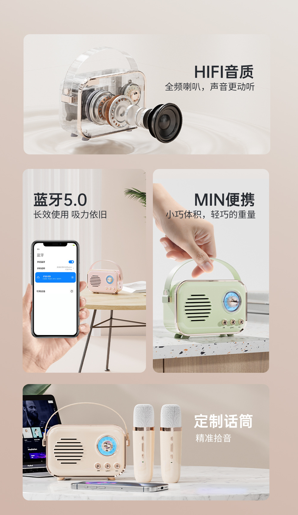 새로운 무선 마이크 블루투스 스피커 레트로 야외 노래방 오디오 올인원 휴대용 어린이 오디오 도매
