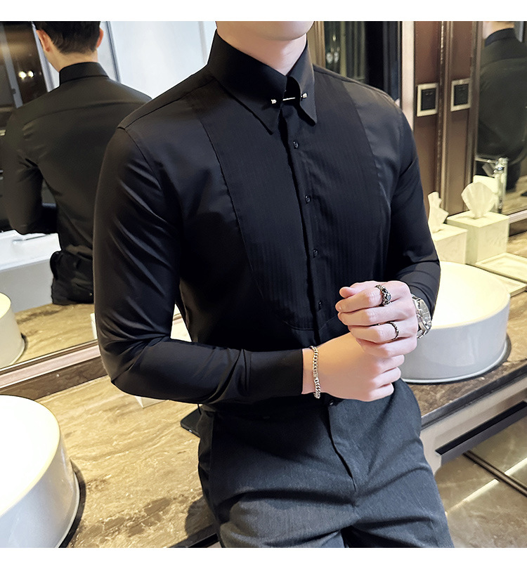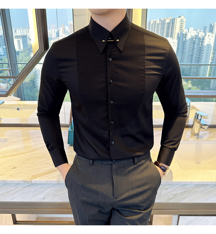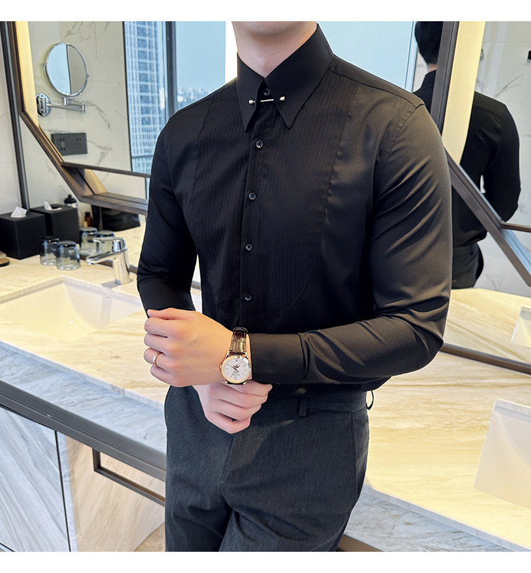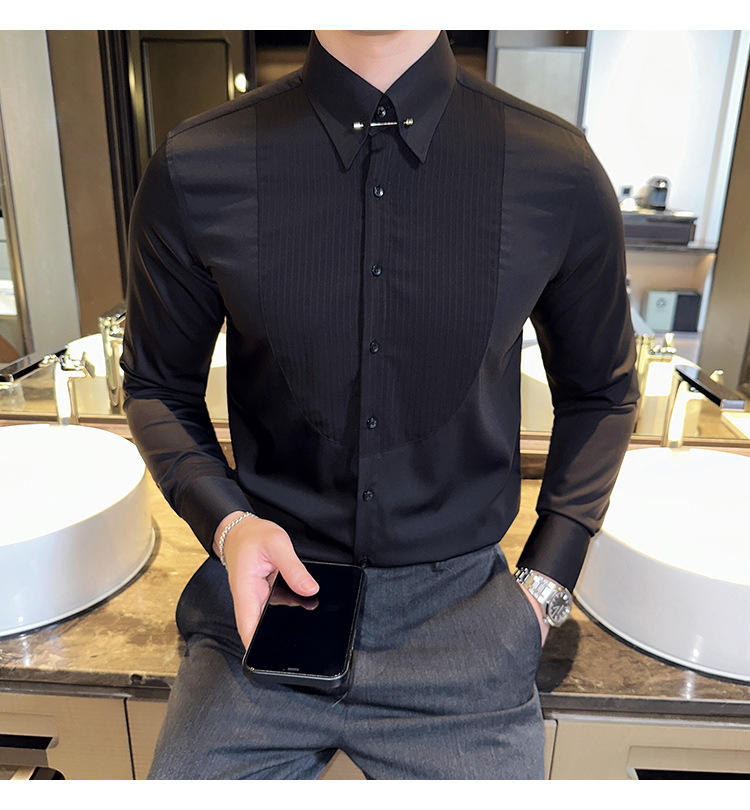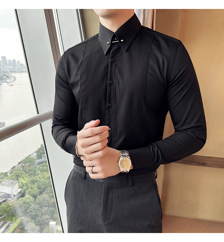 플리츠 스트라이프 프렌치 셔츠 네크라인 금속 장식 디자인 남성용 가운 가벼운 럭셔리 높은 질감 긴 소매 셔츠