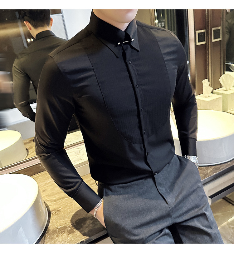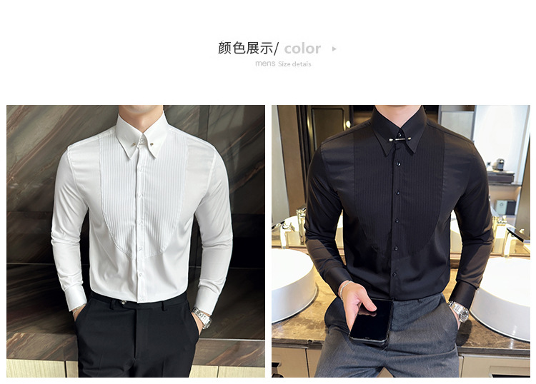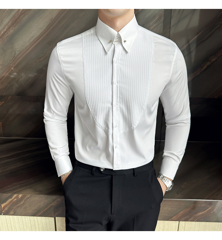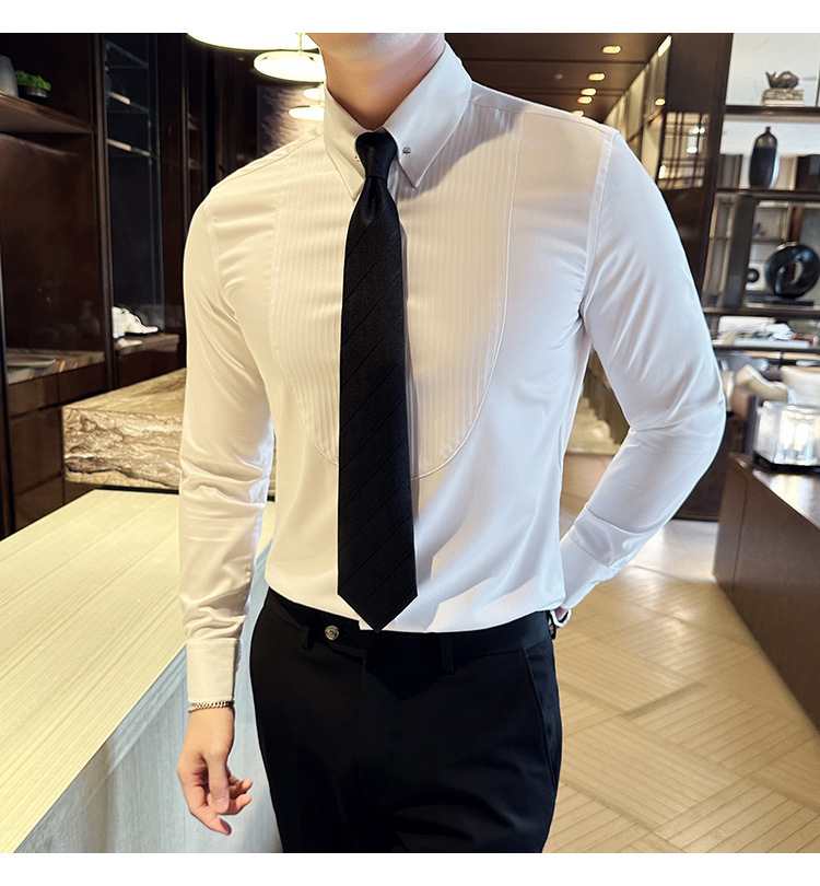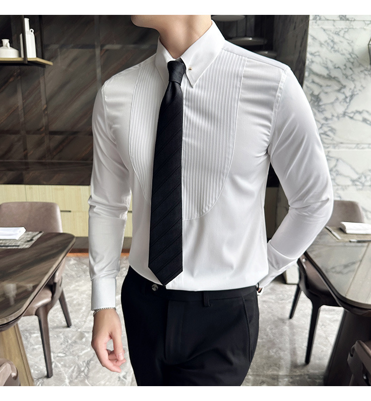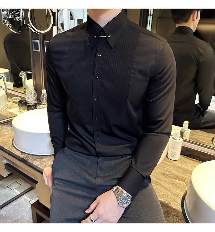 플리츠 스트라이프 프렌치 셔츠 네크라인 금속 장식 디자인 남성용 가운 가벼운 럭셔리 높은 질감 긴 소매 셔츠