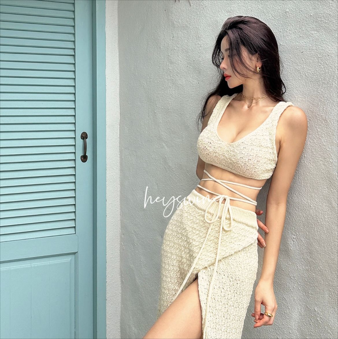 2024 새로운 니트 스플릿 수영복 여성 한국어 스타일 ins 스타일 심플 솔리드 컬러 비키니 3 피스 세트 + 비치 스커트스토어 가기