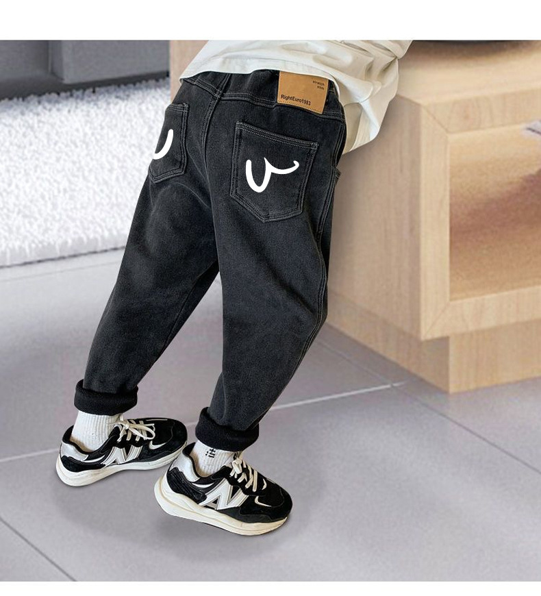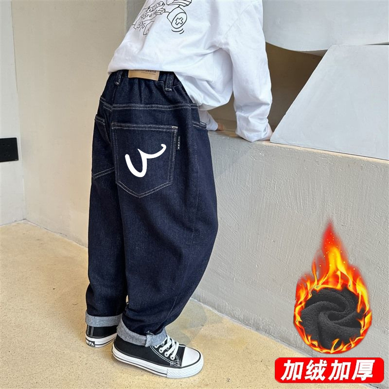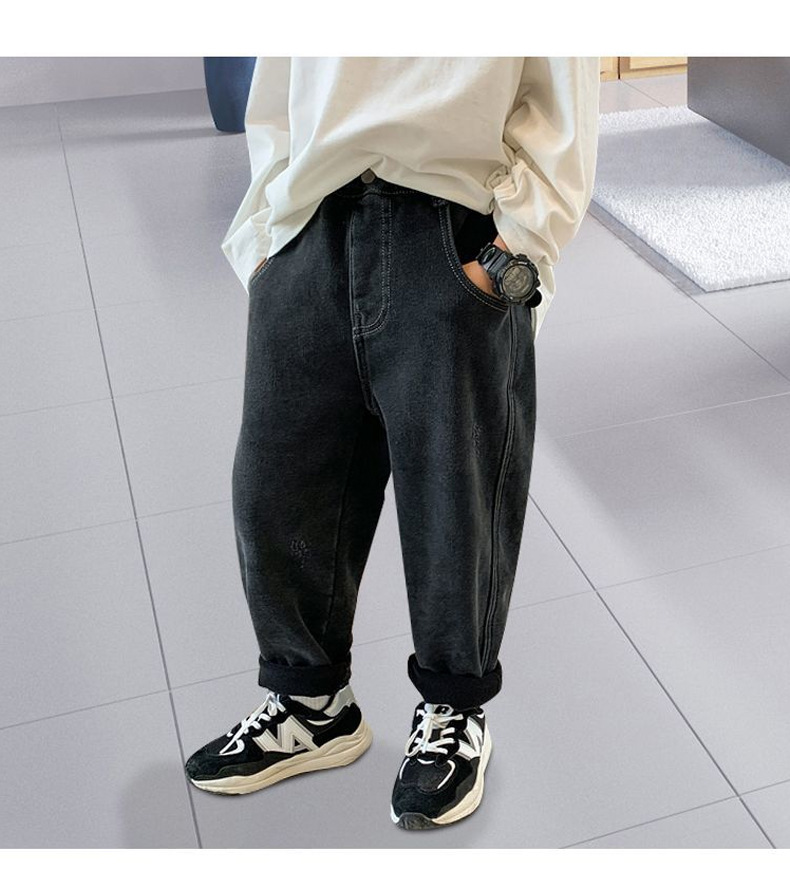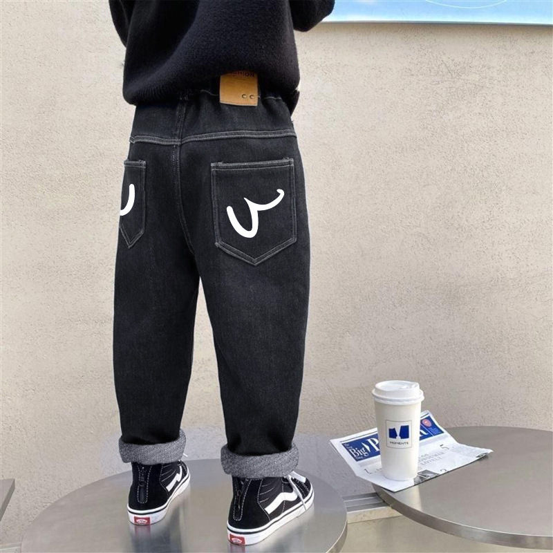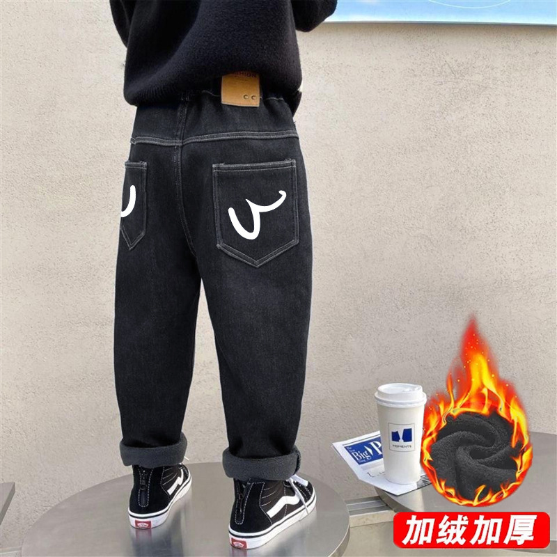 남아 기모 바지 2023 새로운 겨울 착용 소년 두꺼운 원피스 양털 청바지 어린이 따뜻한 바지 어린이 겨울 착용