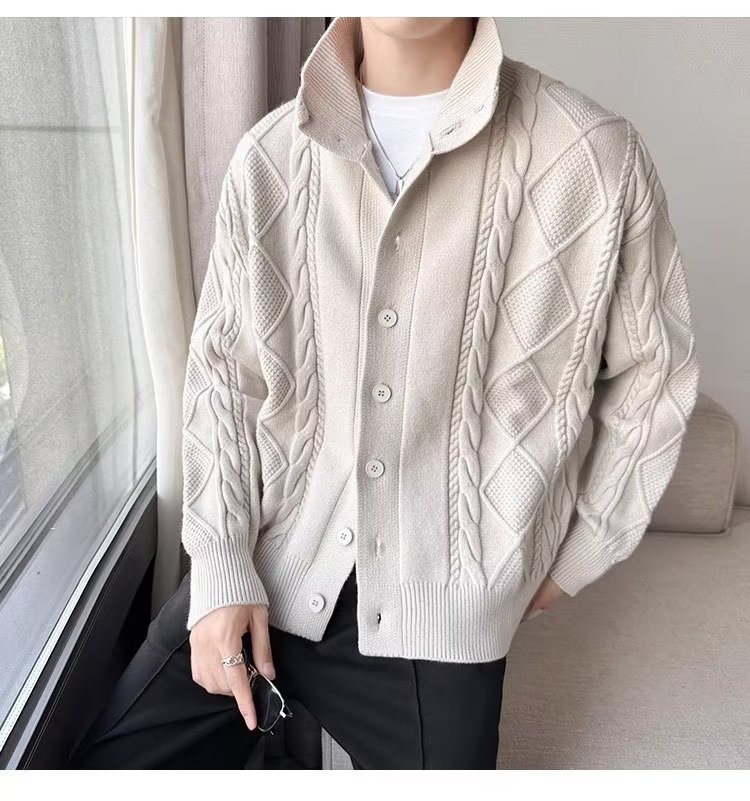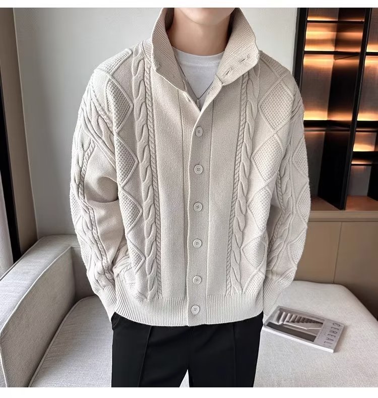 2023 가을과 겨울 새로운 트위스트 니트 가디건 남성용 한국 스타일 느슨한 모든 매치 단색 스웨터 두꺼운 코트 탑