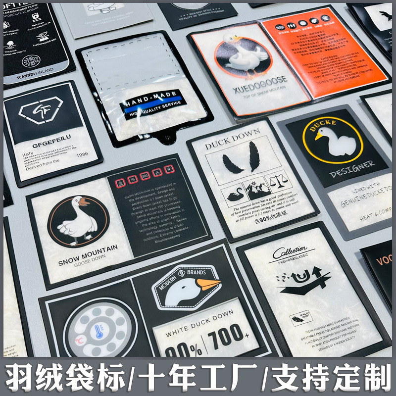 다운 백 10 년 공장 다운 재킷 인테리어 장식 라벨 tpu 소재 고주파 실크 스크린 인쇄 깃털 충전 라벨