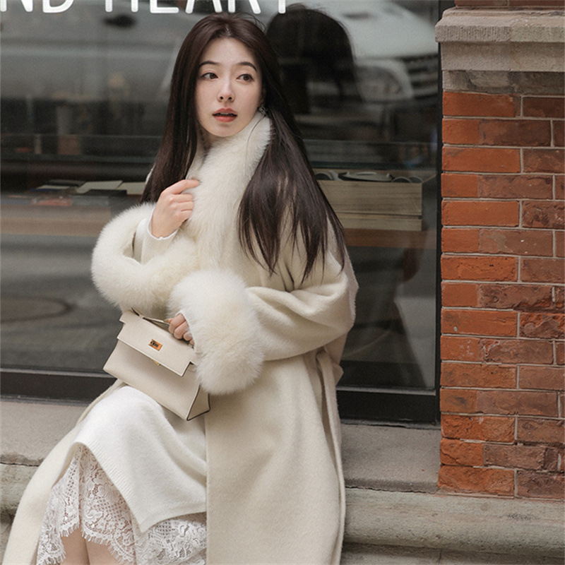 스노우 폭스 코트 25 가을 겨울 신상 여우 모피 V 넥 양면 캐시미어 모직 코트 여성 중간 길이 기질 코트스토어 가기