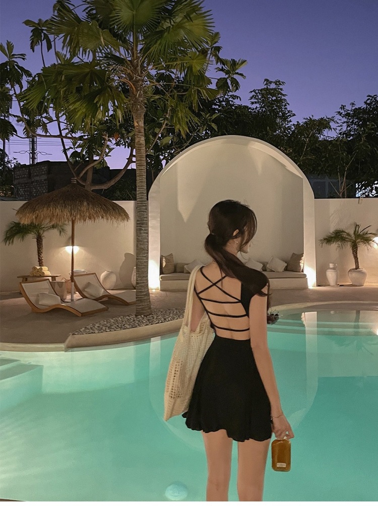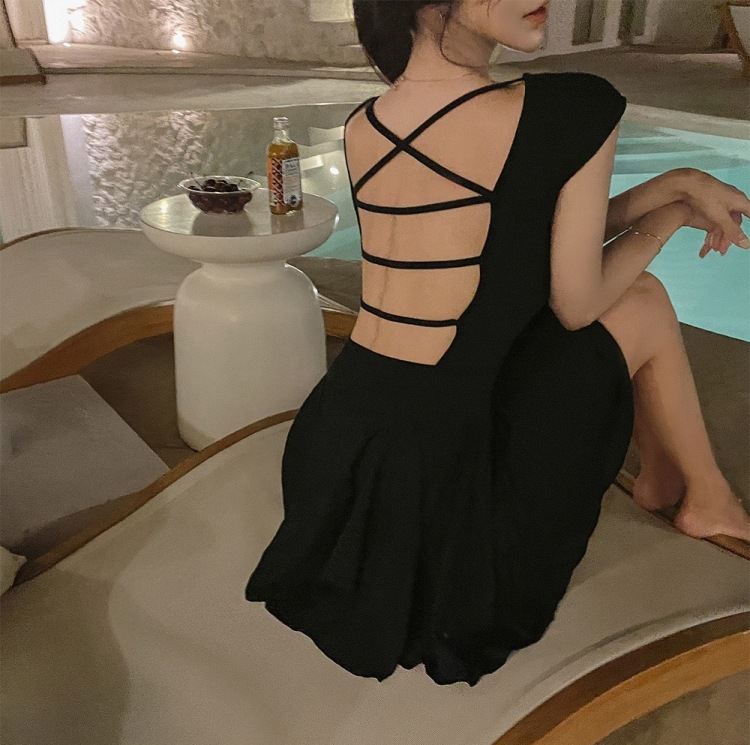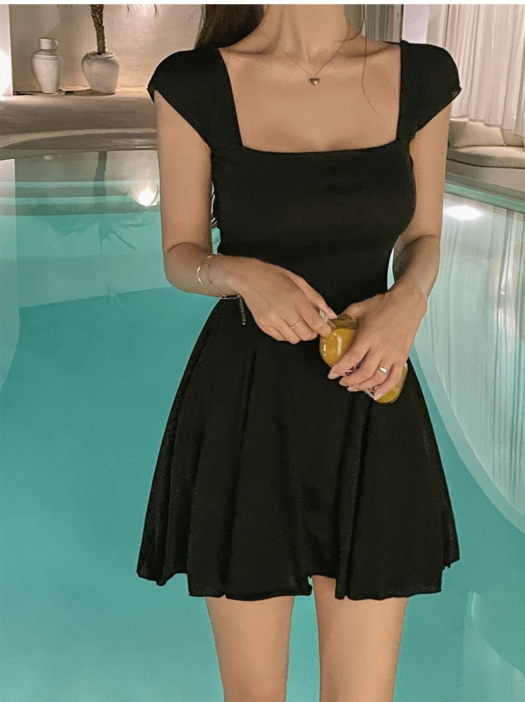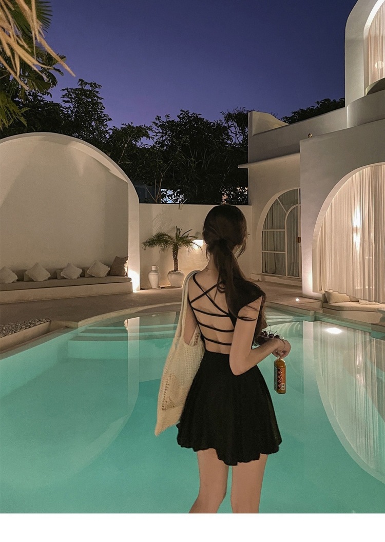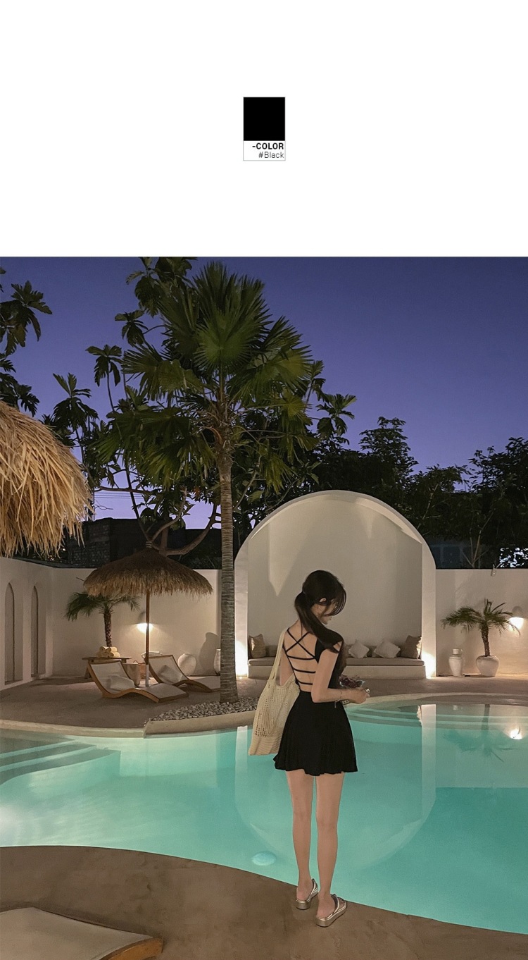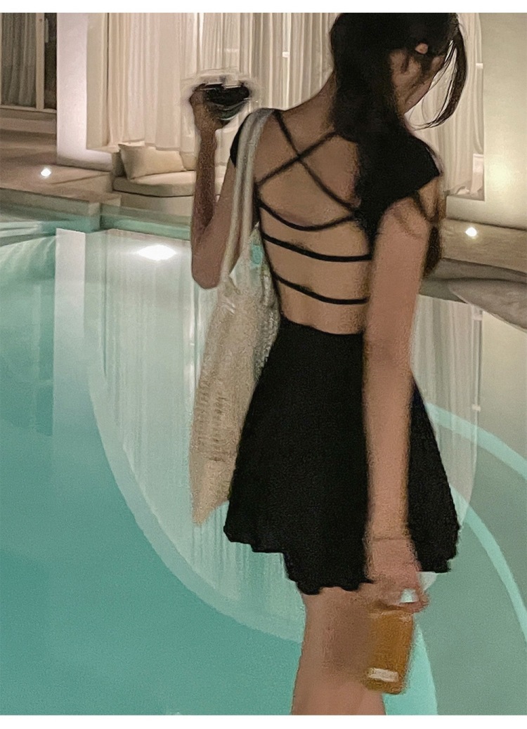 블랙 섹시 로우 컷 스퀘어 칼라 꽉 크로스 등이없는 원피스 여성의 중공 스티치 중간 길이 휴가 수영복