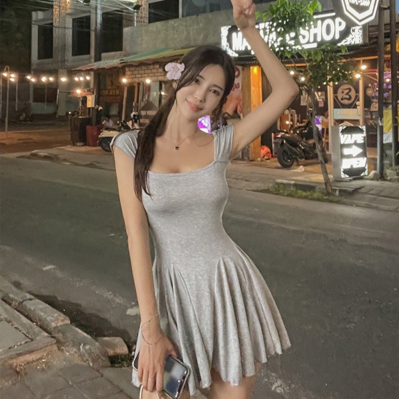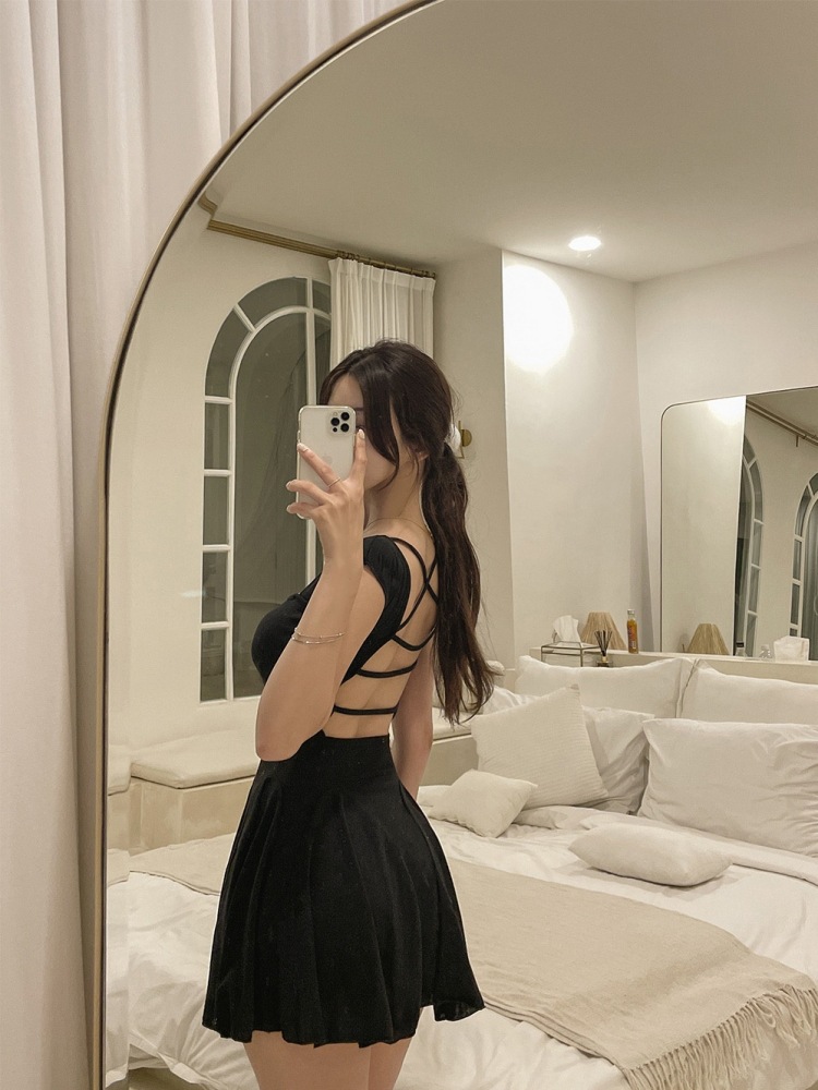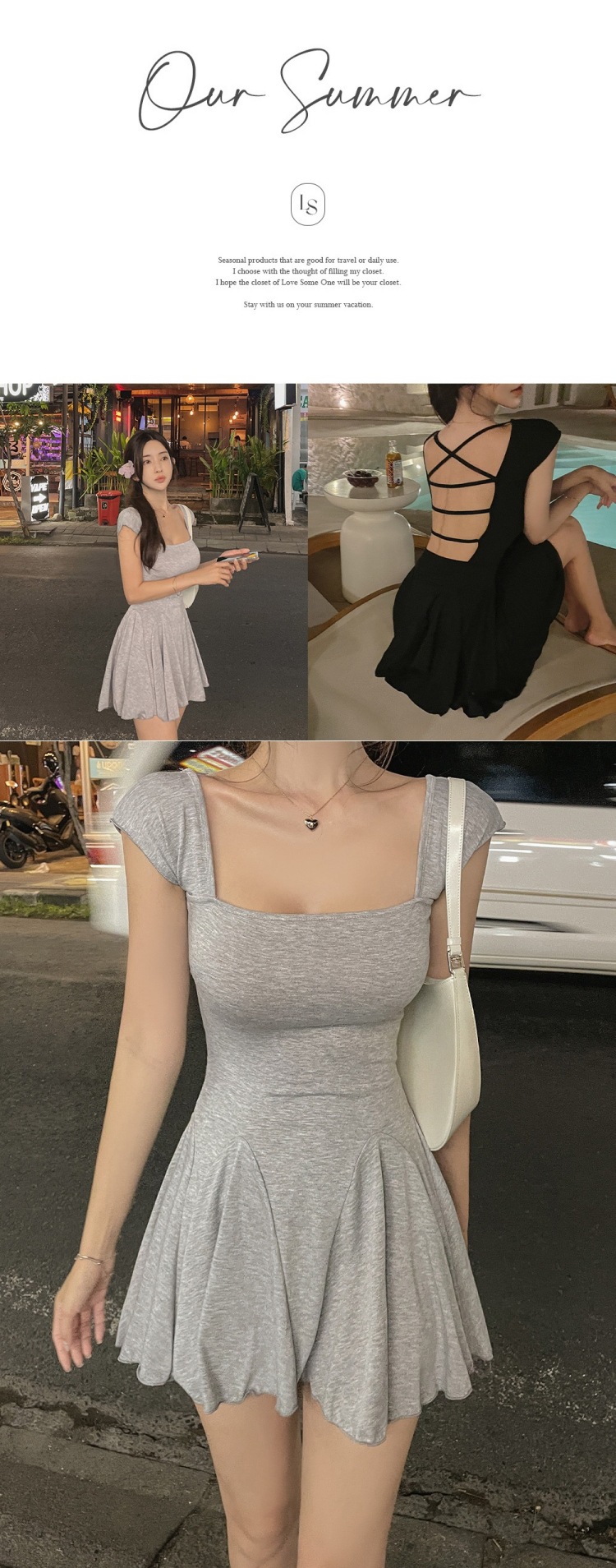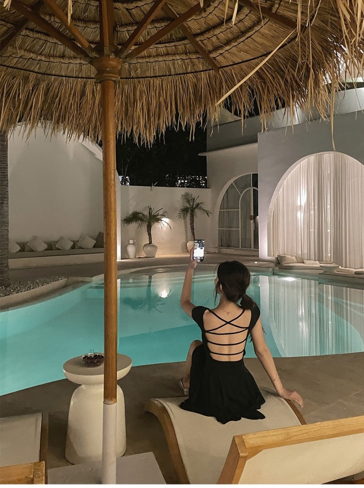 블랙 섹시 로우 컷 스퀘어 칼라 꽉 크로스 등이없는 원피스 여성의 중공 스티치 중간 길이 휴가 수영복스토어 가기