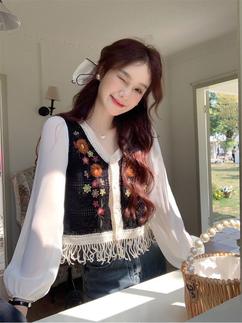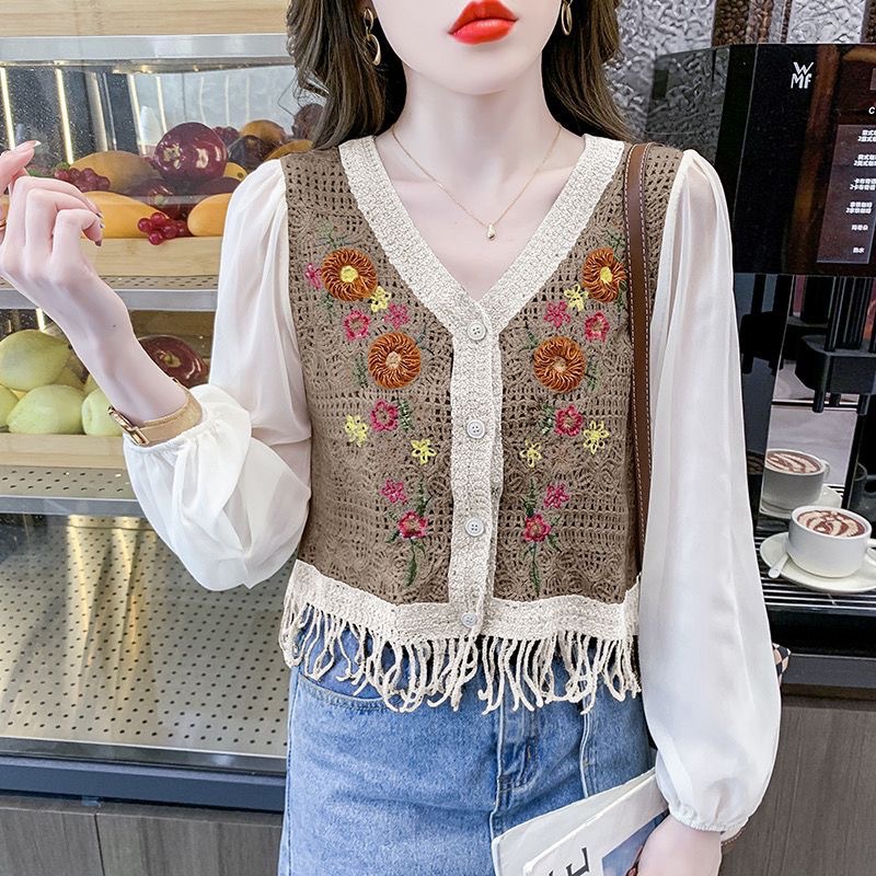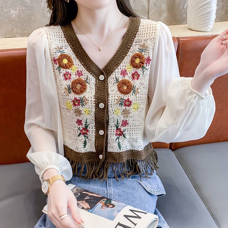 프랑스 V-넥 스티칭 중공 술 쉬폰 니트 스웨터 여성의 이른 가을 서양 스타일 아름다운 틈새 달콤한 나이 감소 탑
