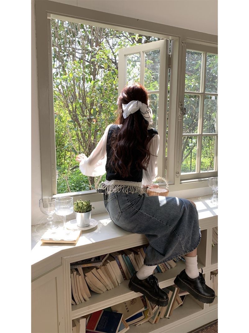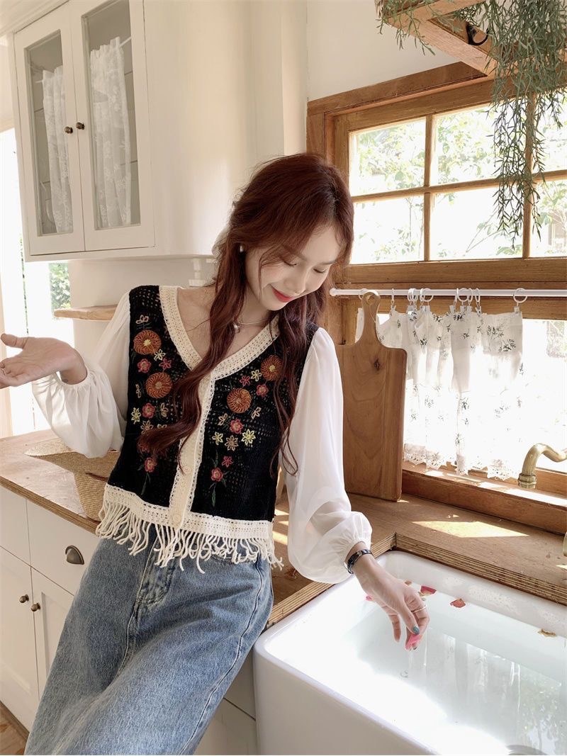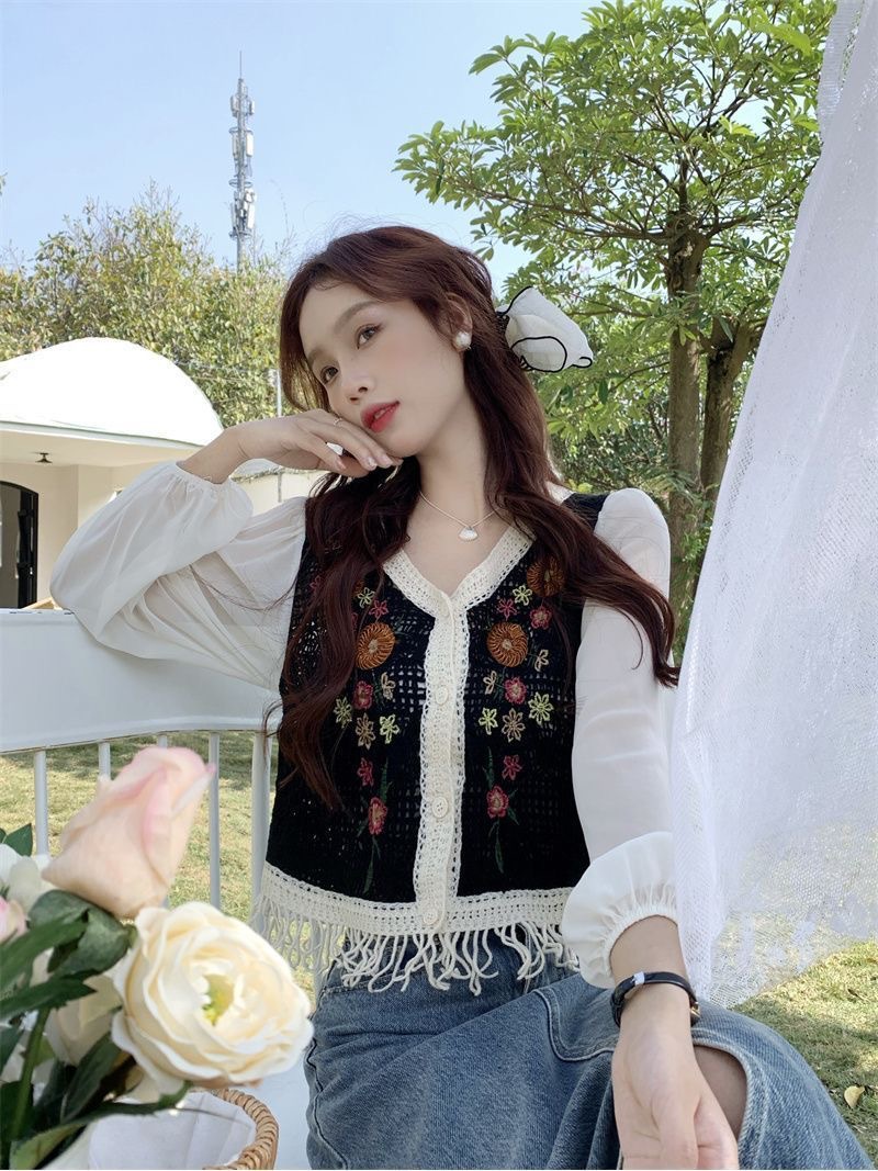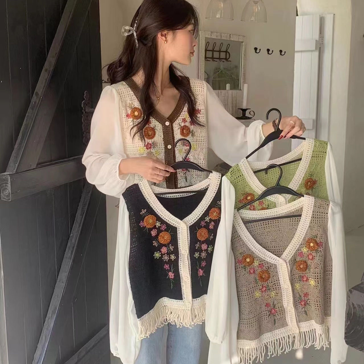 프랑스 V-넥 스티칭 중공 술 쉬폰 니트 스웨터 여성의 이른 가을 서양 스타일 아름다운 틈새 달콤한 나이 감소 탑스토어 가기