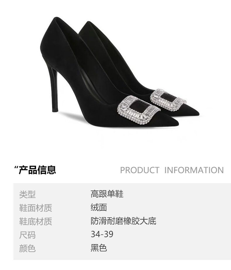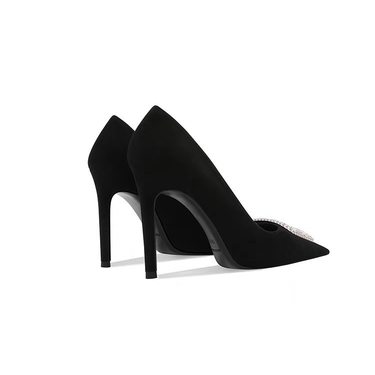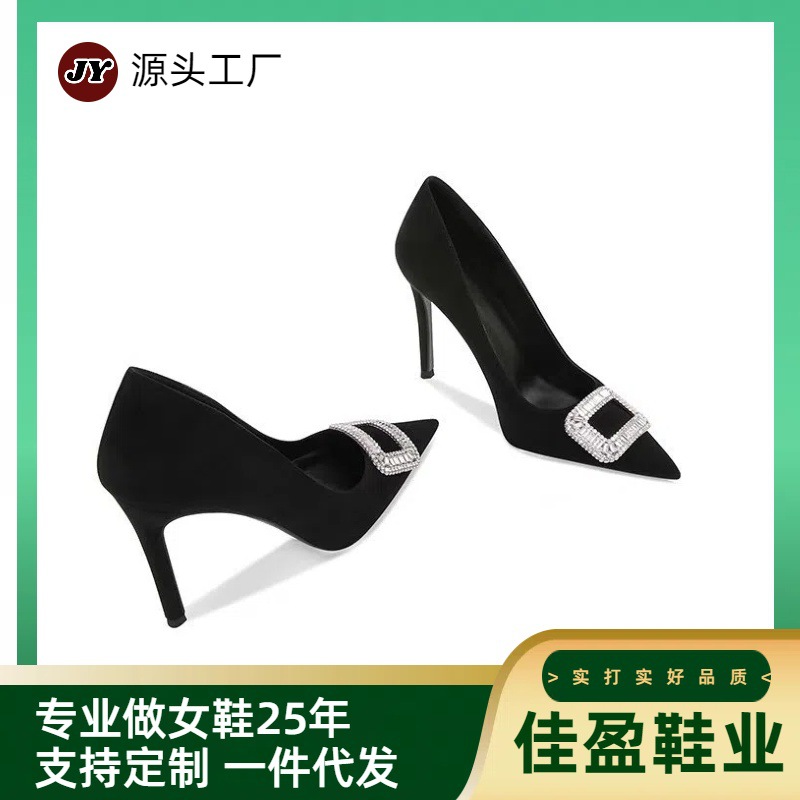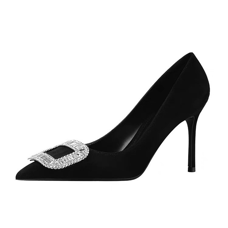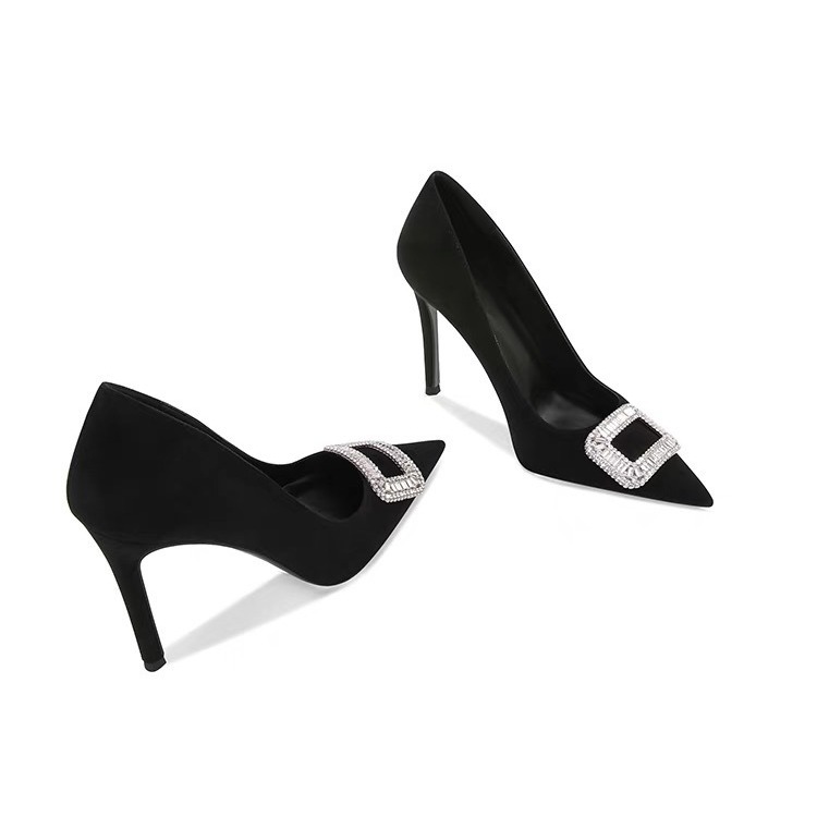 정품 양가죽 레이디 블랙 하이힐 프렌치 라인스톤 스퀘어 버클 전문 포인티드 토 스웨이드 스틸레토 힐 피곤하지 않은 신발스토어 가기