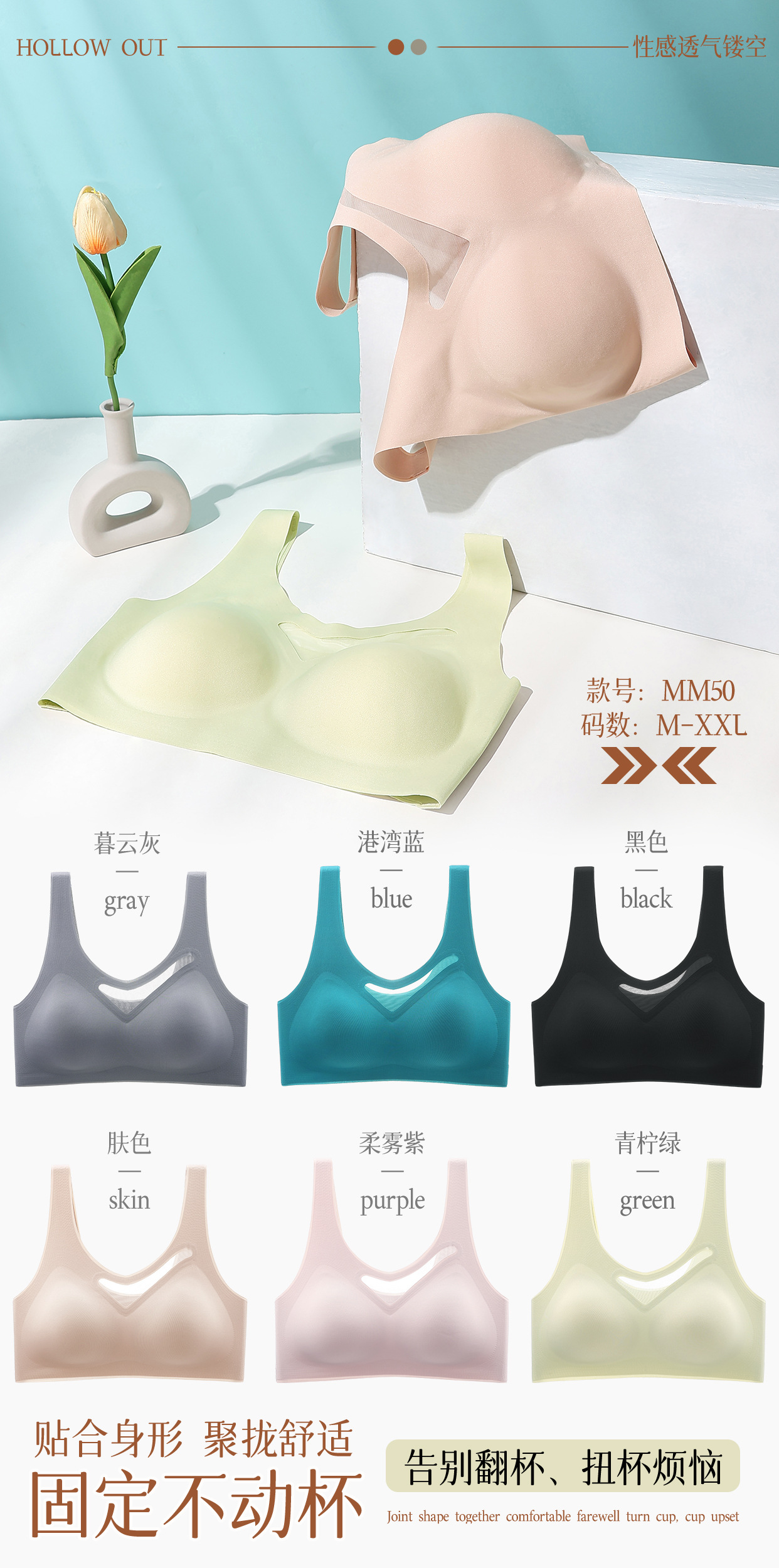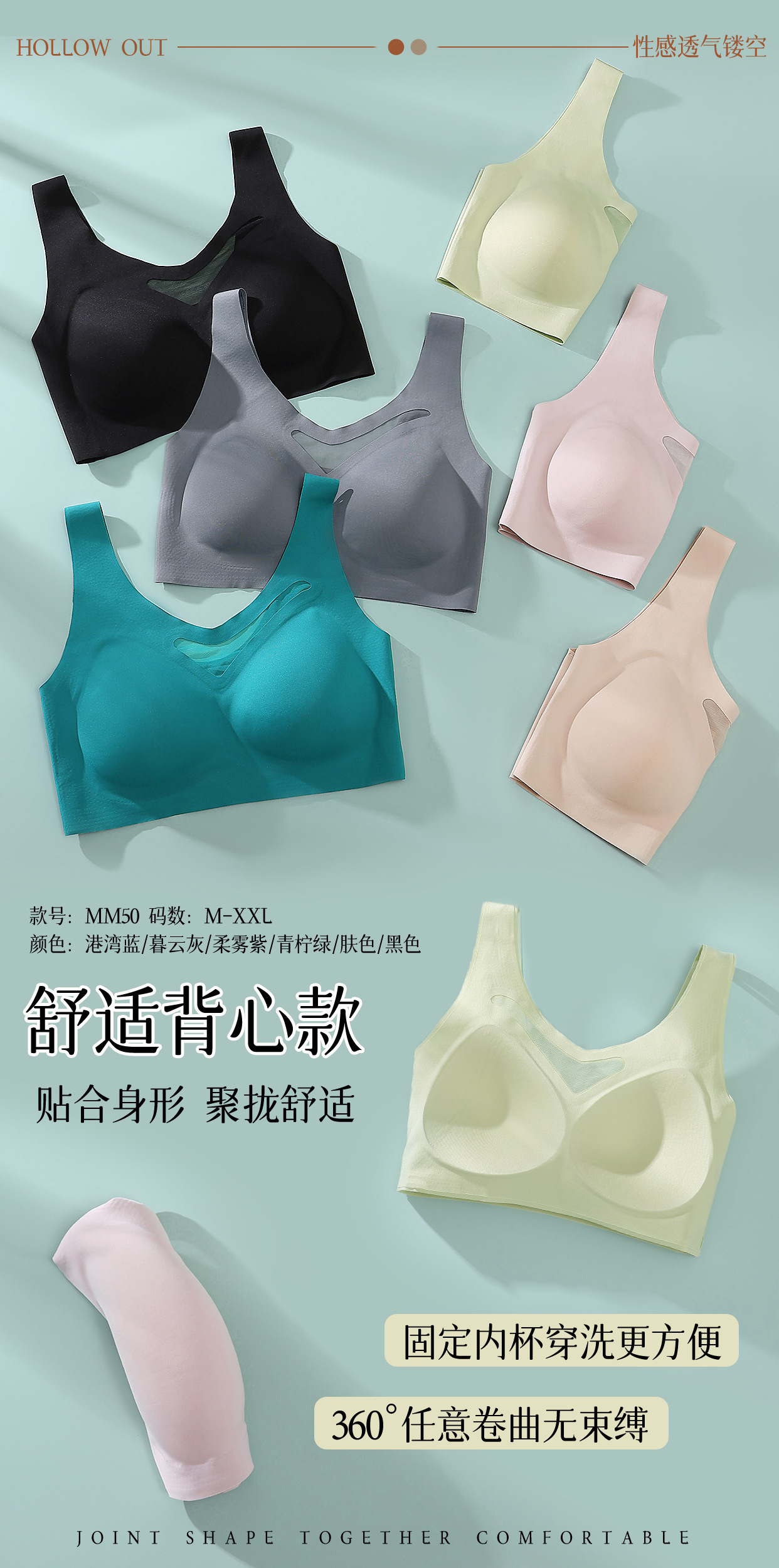 4、杯里采用热帖固定不动杯,贴合身形,聚拢舒适,不易跑杯,穿洗更方便,告别翻杯、扭杯烦恼