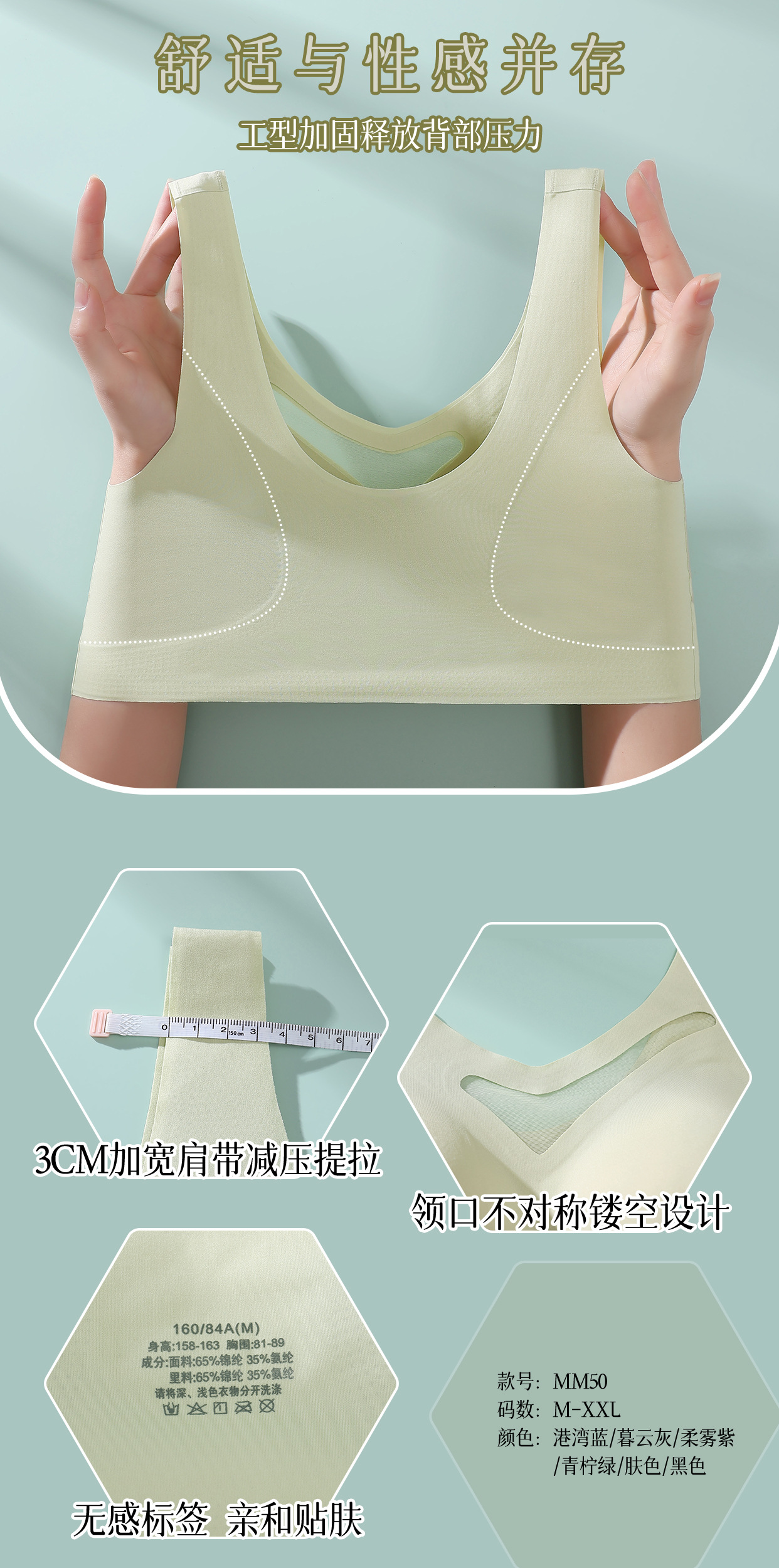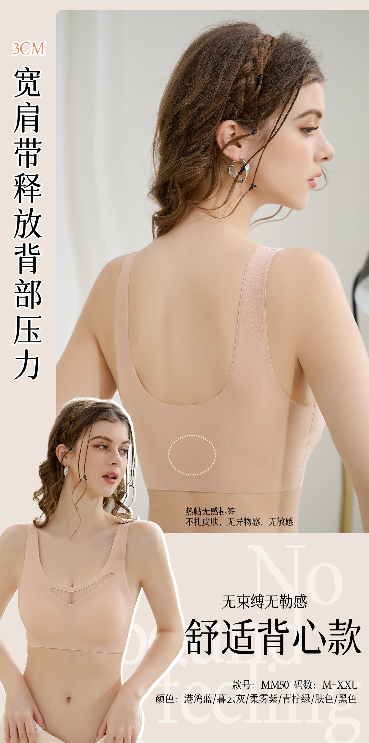 3、宽肩带、释放背部压力,整件上身无束缚,无勒感