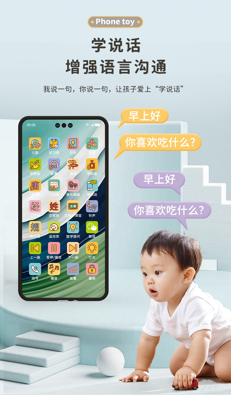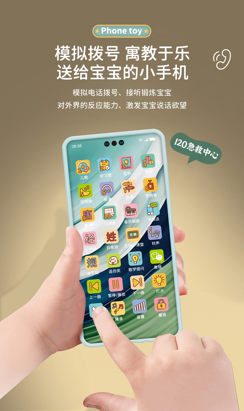 功能: 10000+以上功能,模拟拨号,4种魔音,8种铃声,音量调节,暂停/播放,25篇故事,弟子规,800学说话,百家姓,6篇好习惯,文明小课堂,2288音乐编曲,1080首安眠曲,逗你笑,20首唐诗,童锁,180口诀表,微信,134篇百科,炫彩灯光,330英语,40首儿歌,三字经,120个数学提问,上/下一曲