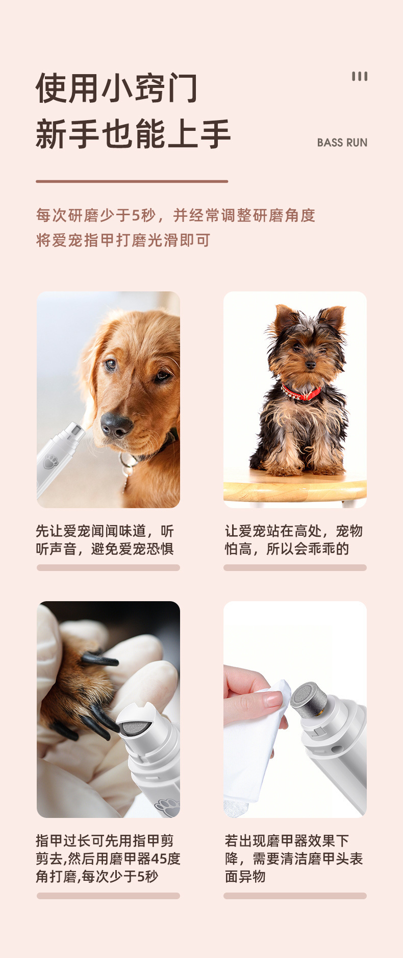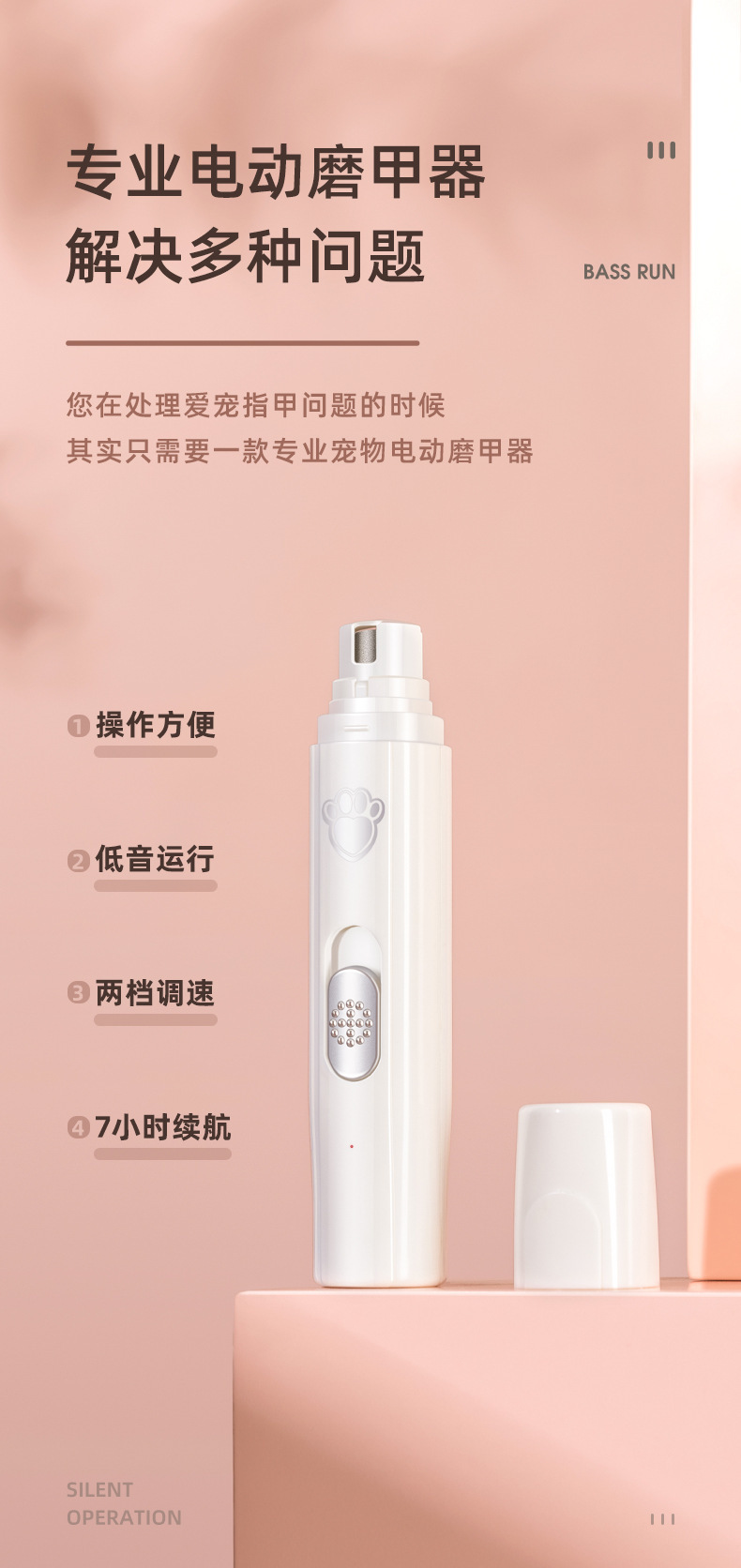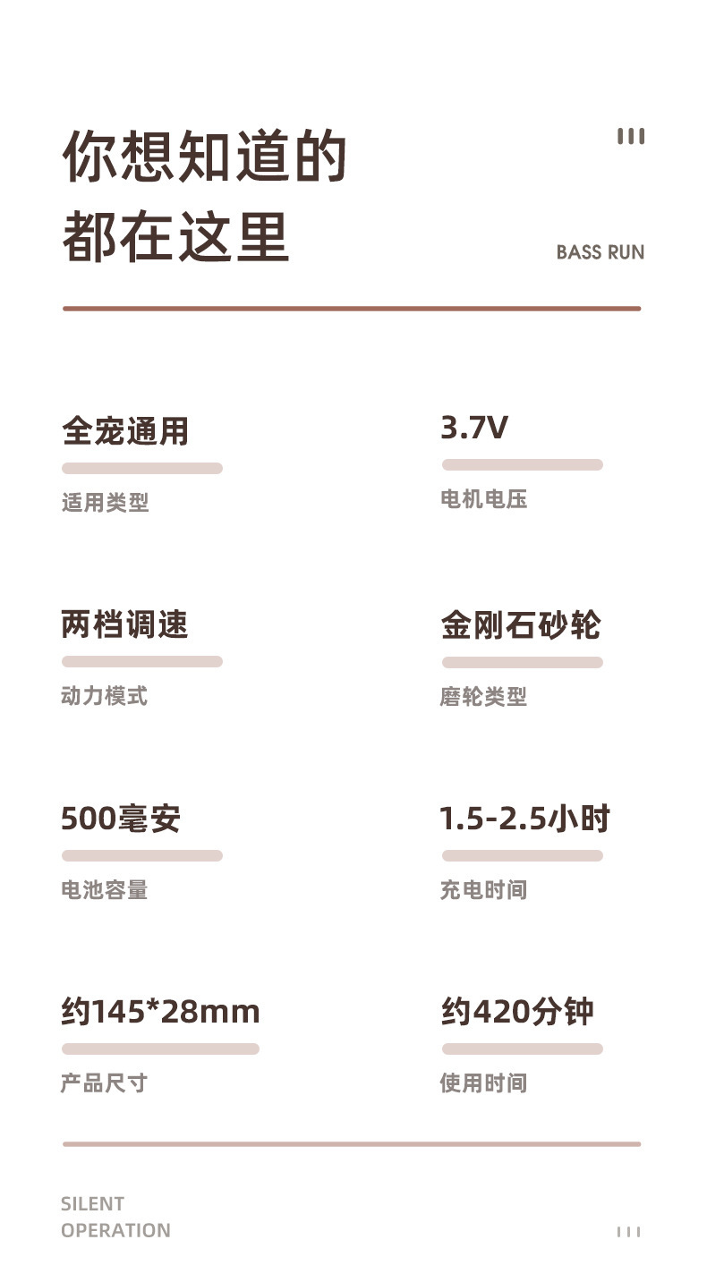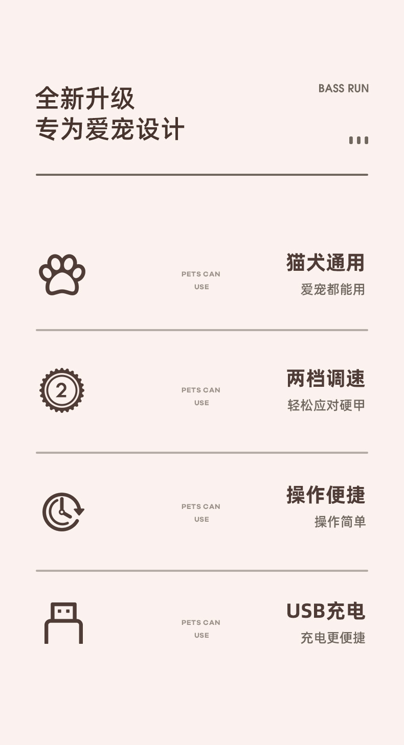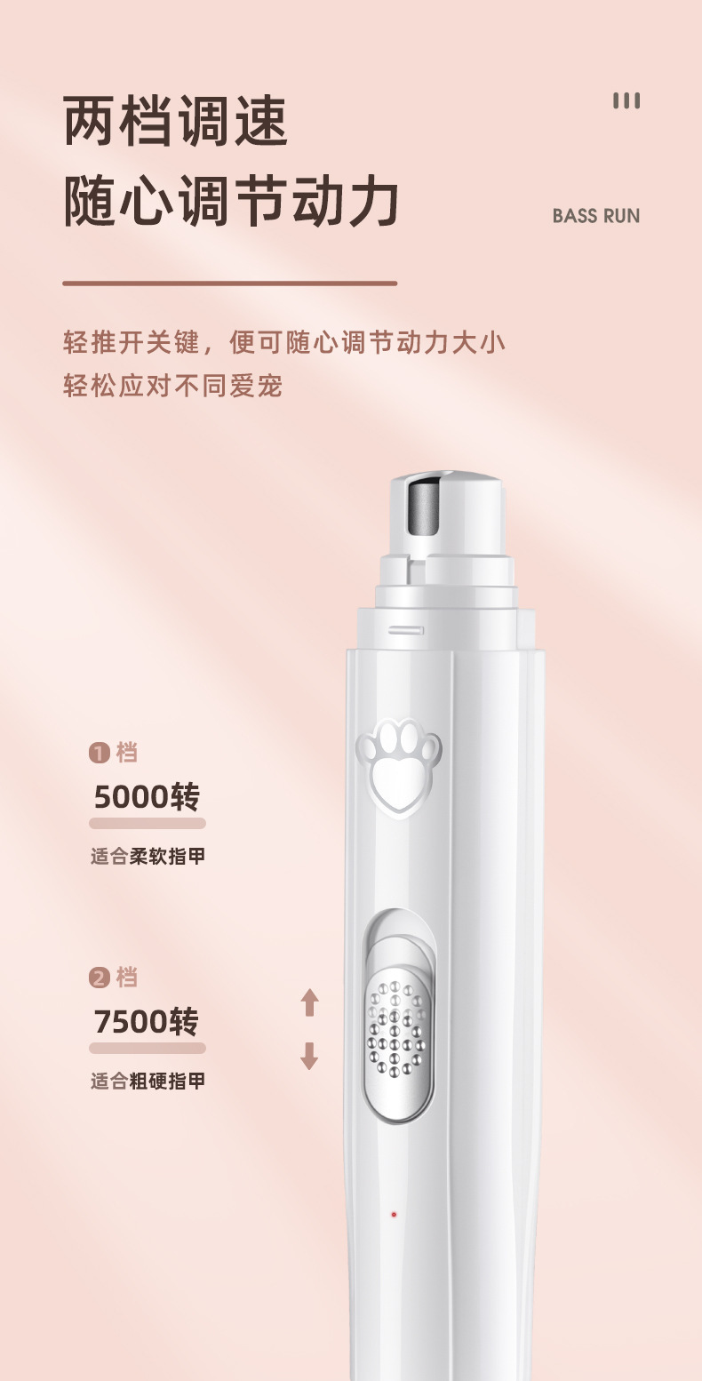 二档调速(5000转,7000转)可快速磨去多余指甲,不会伤害磨到血线而伤害宠物。