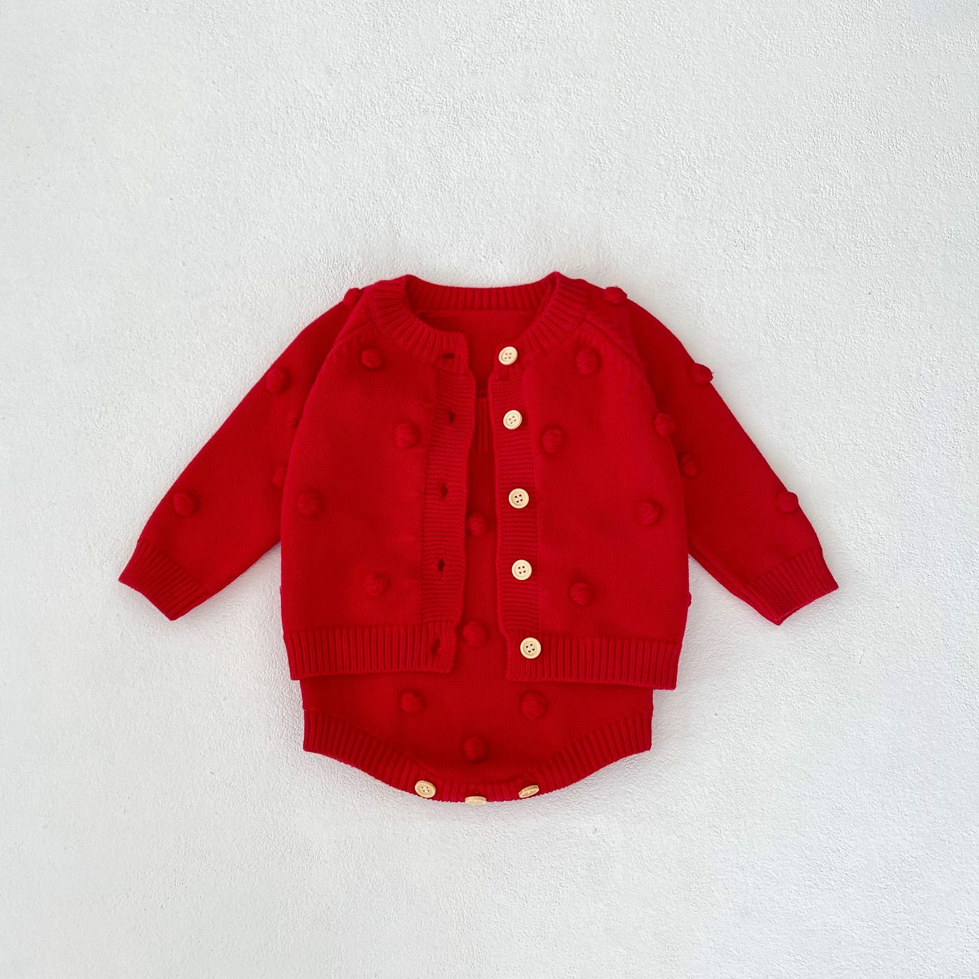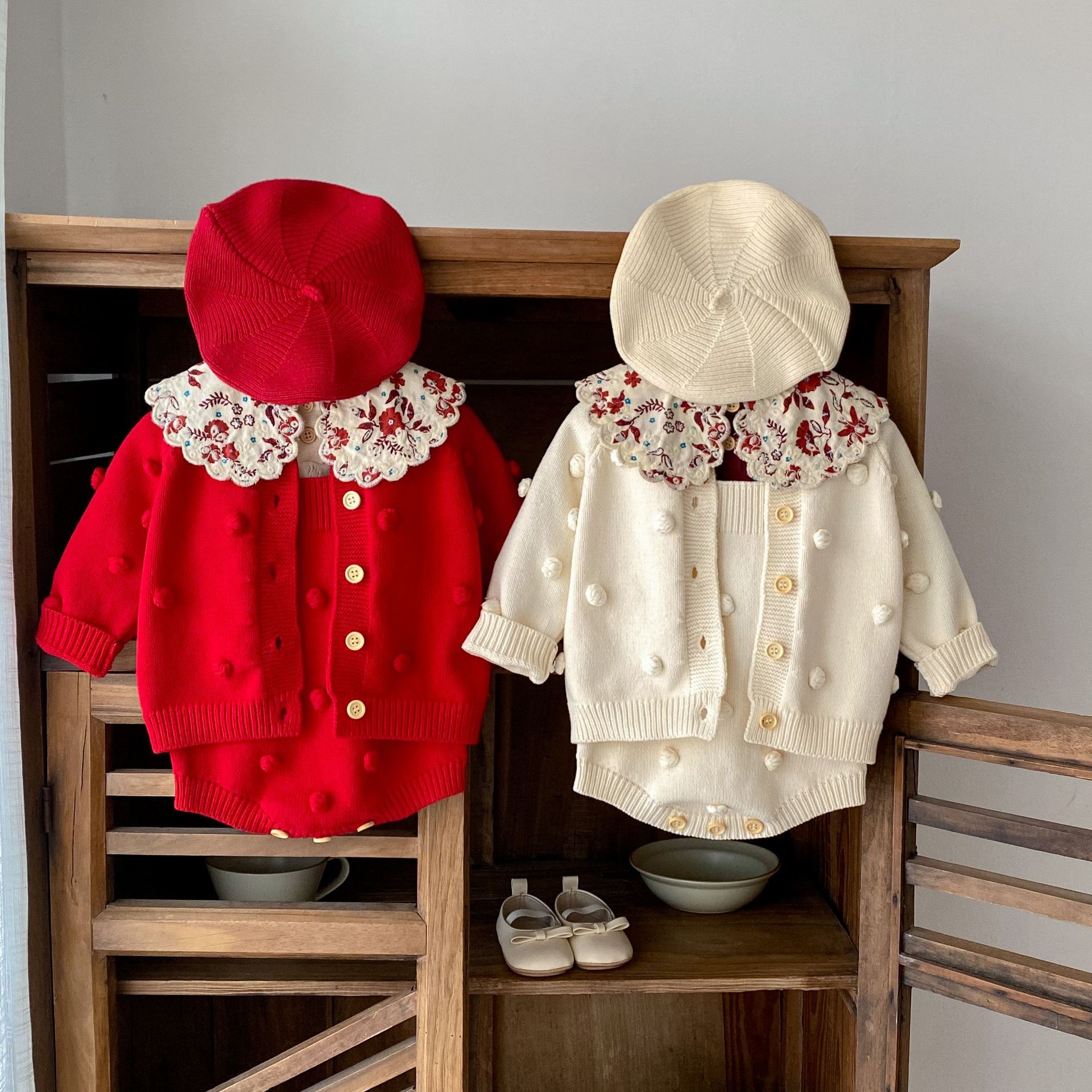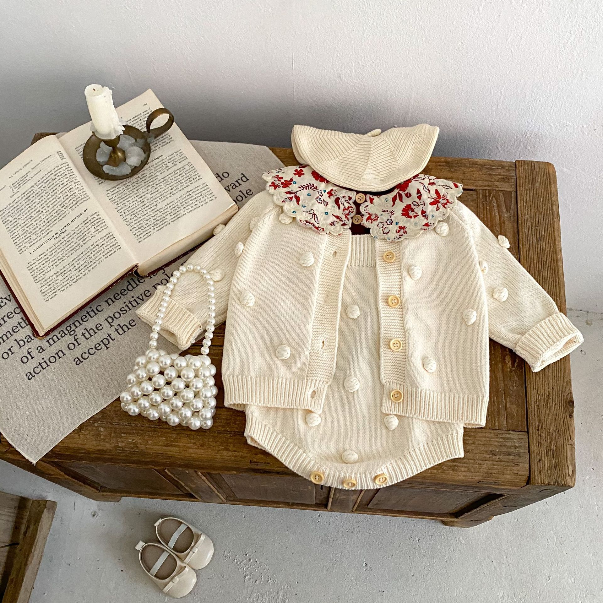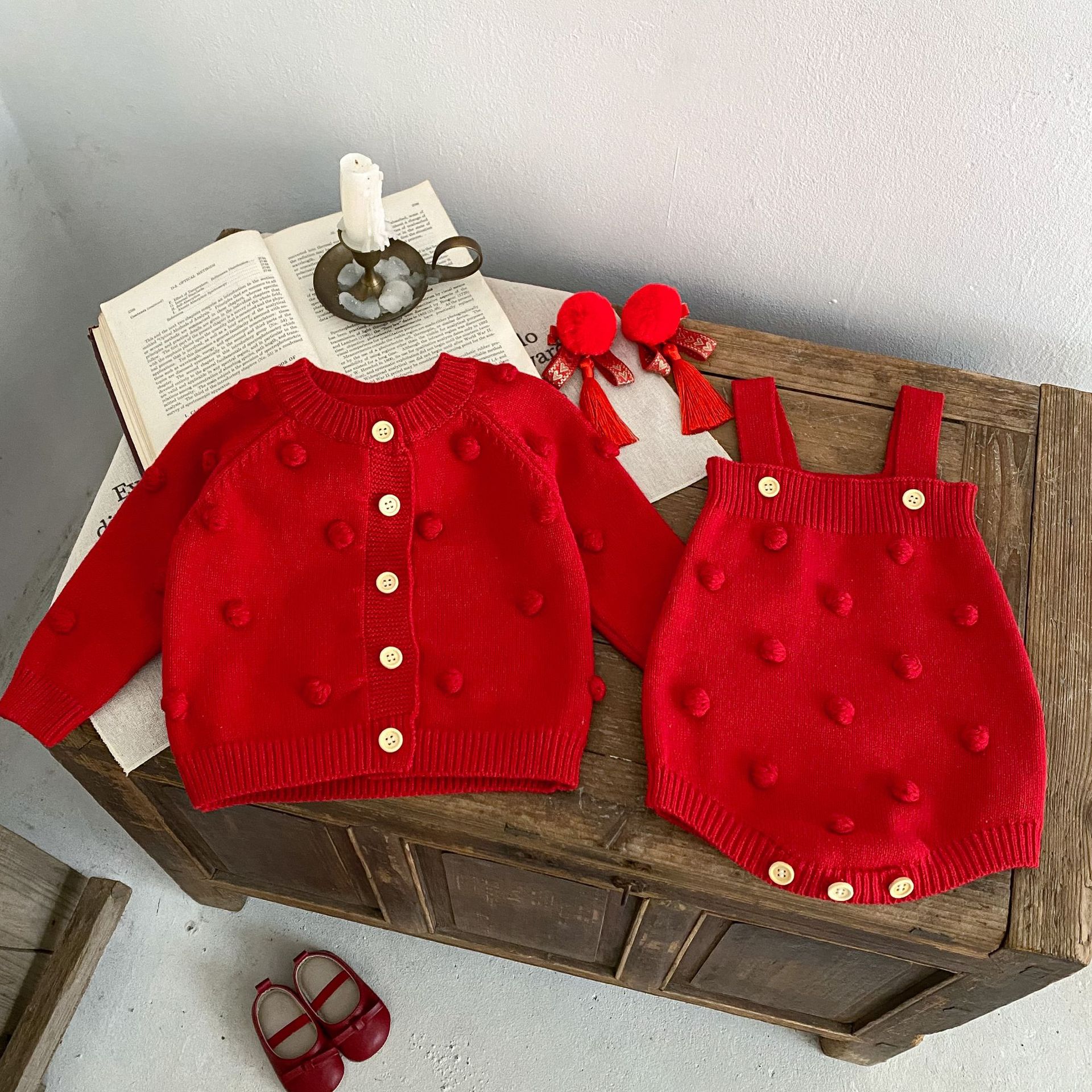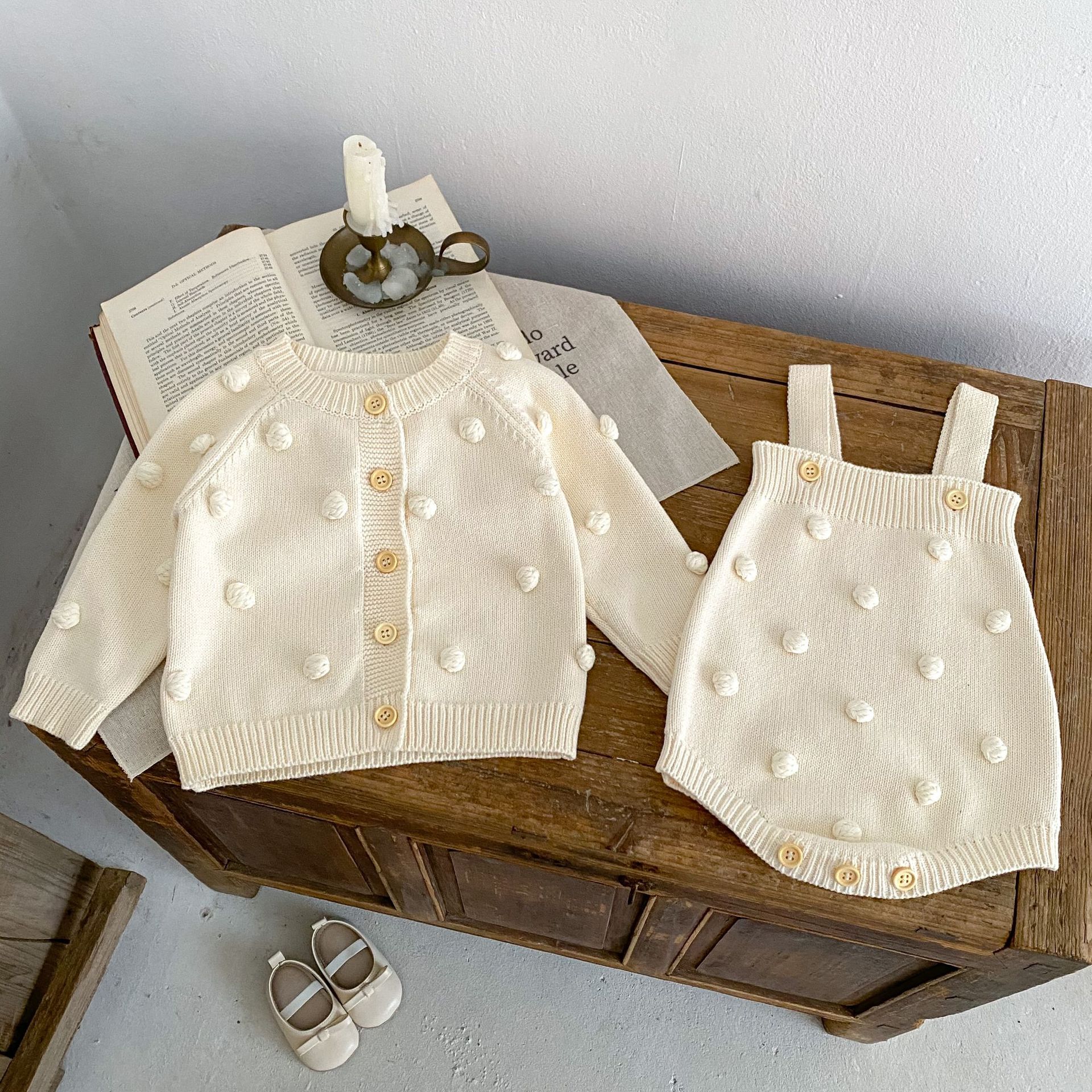 2026년 가을 겨울 신상 유아 여아용 핸드메이드 볼 니트 자켓+니트 멜빵 점프수트