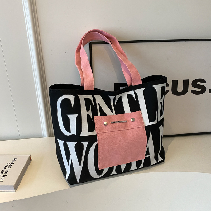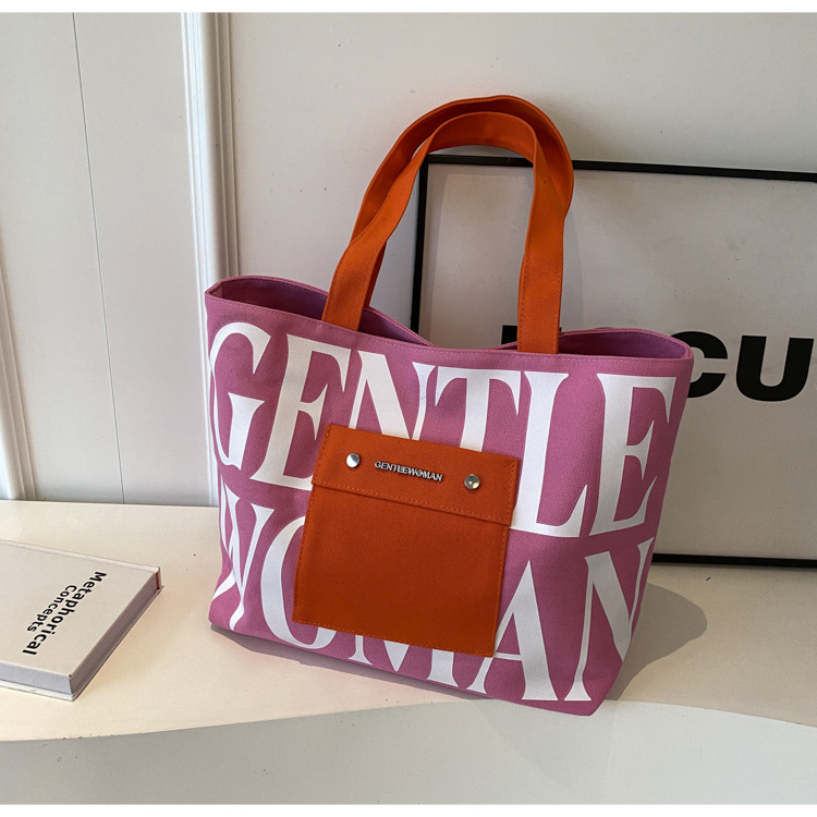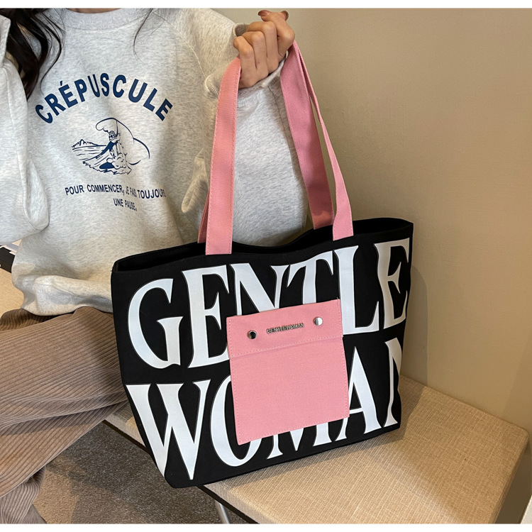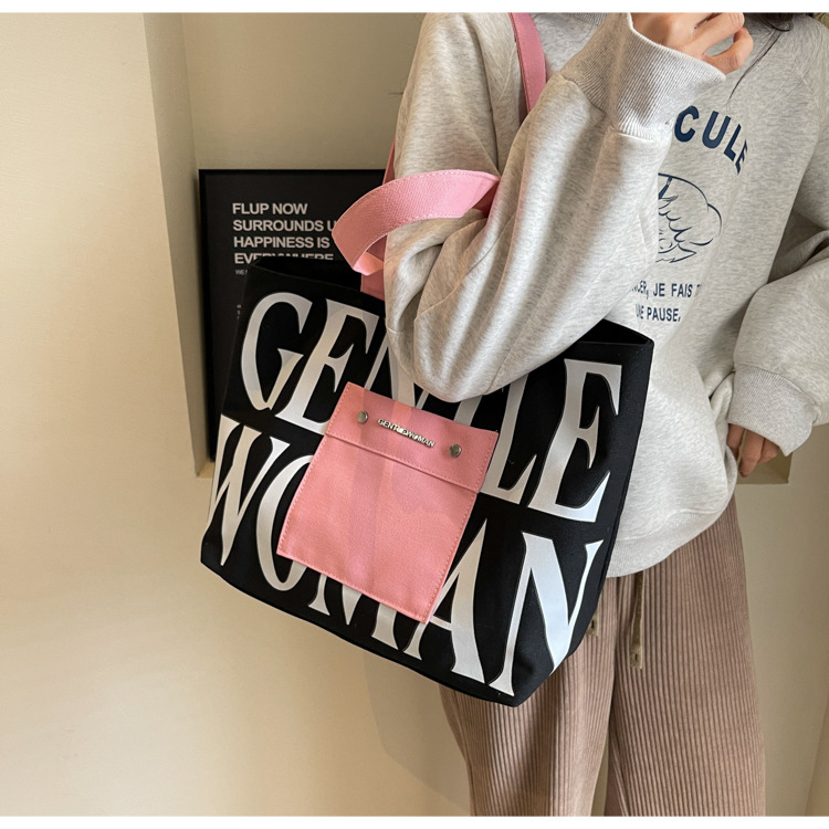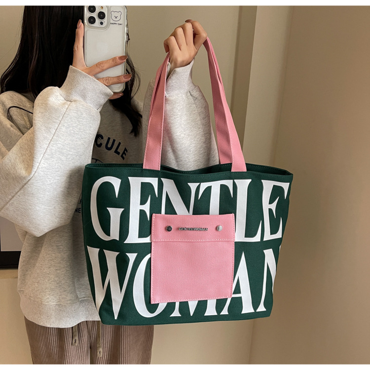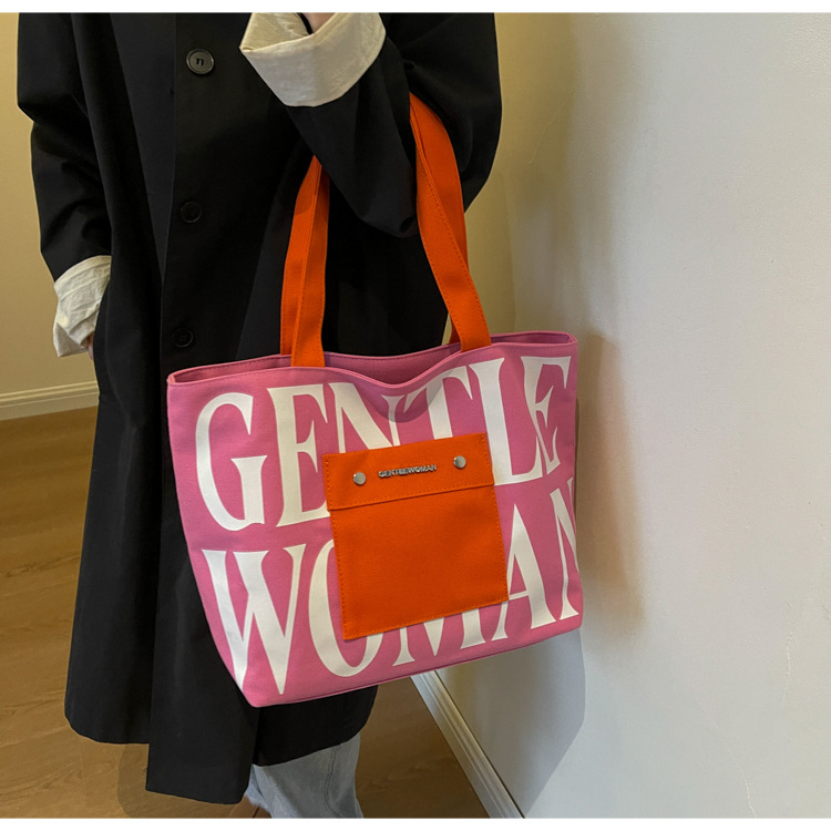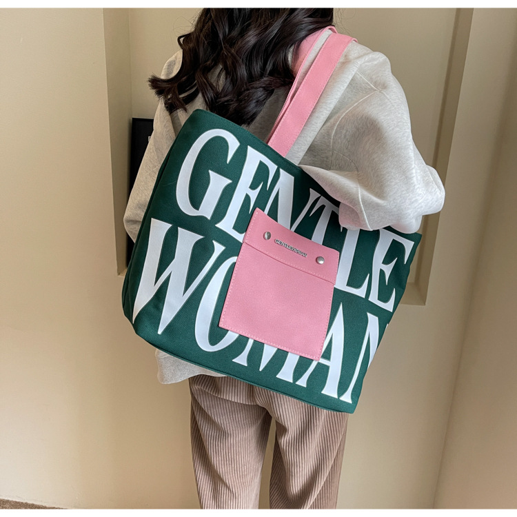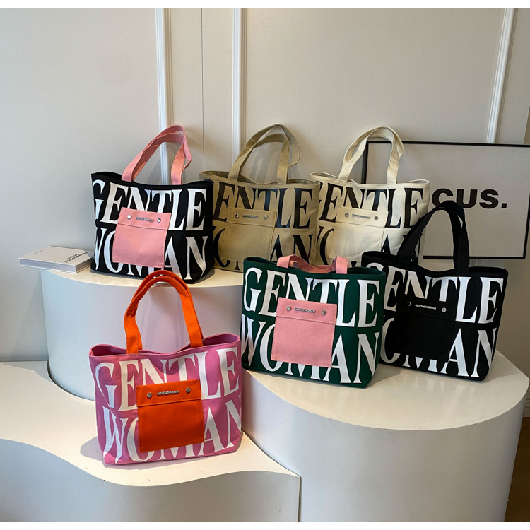부드러운 여자 대용량 편지 인쇄 손 토트 캔버스 가방 2023 새로운 컬러 블록 어깨 가방스토어 가기