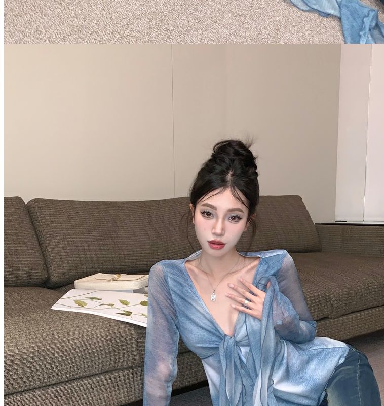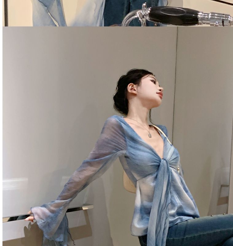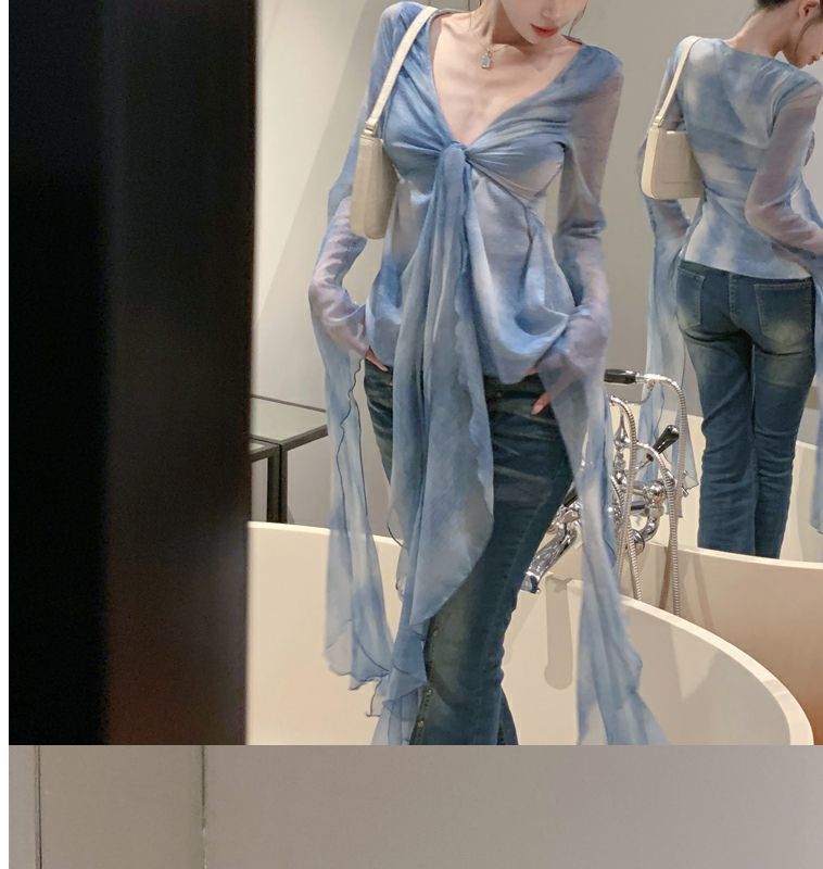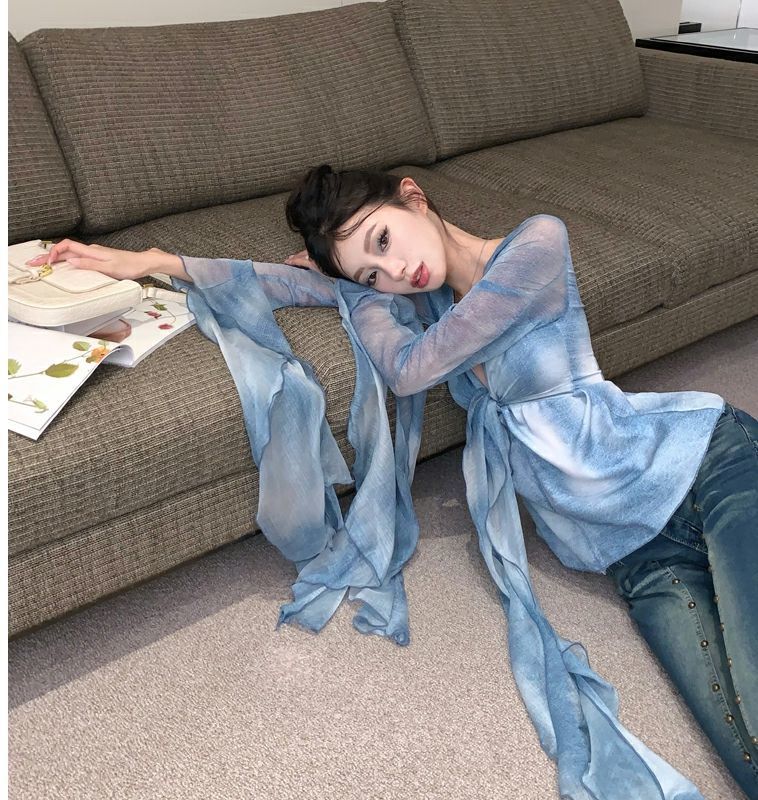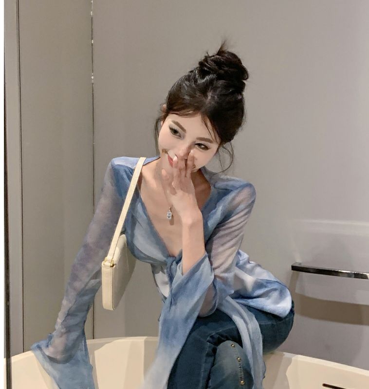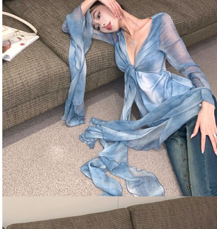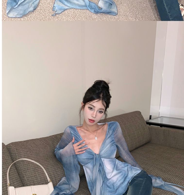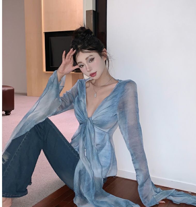 점진적 타이 다이 얇은 긴팔 셔츠 여성용 가을과 겨울 새로운 프랑스 자외선 차단제 셔츠 리본 디자인 틈새 탑스토어 가기