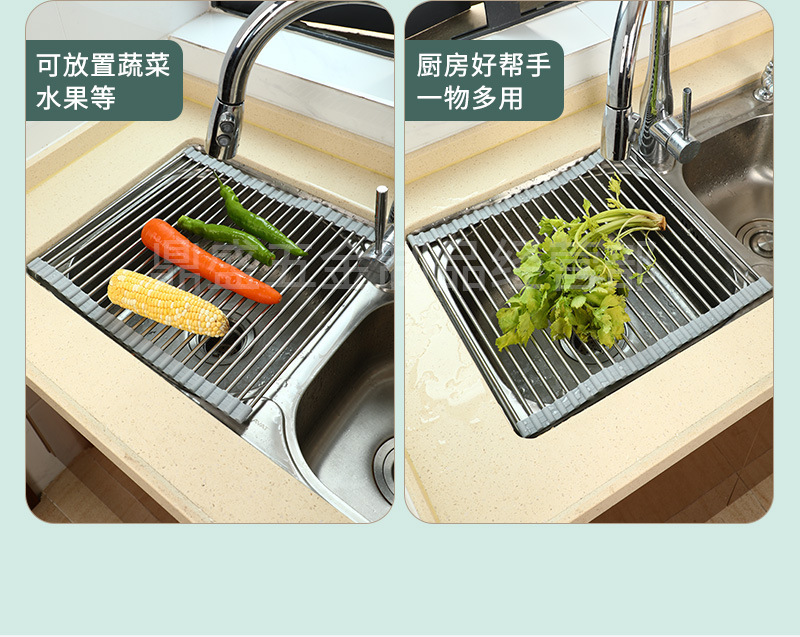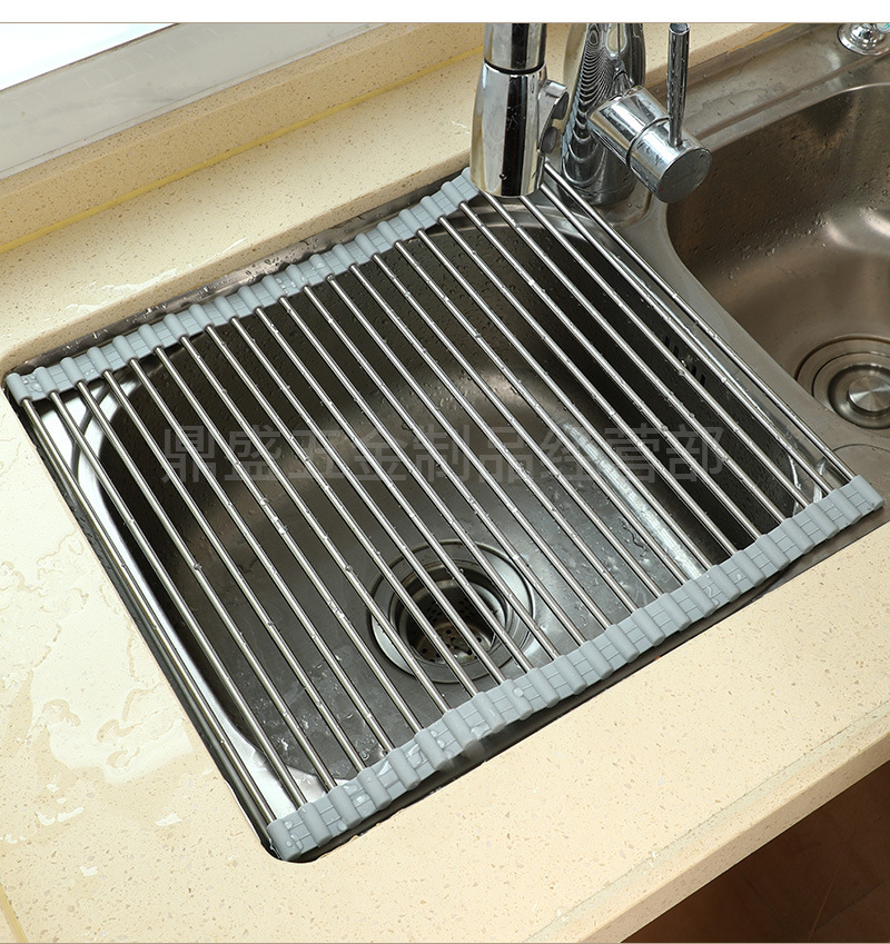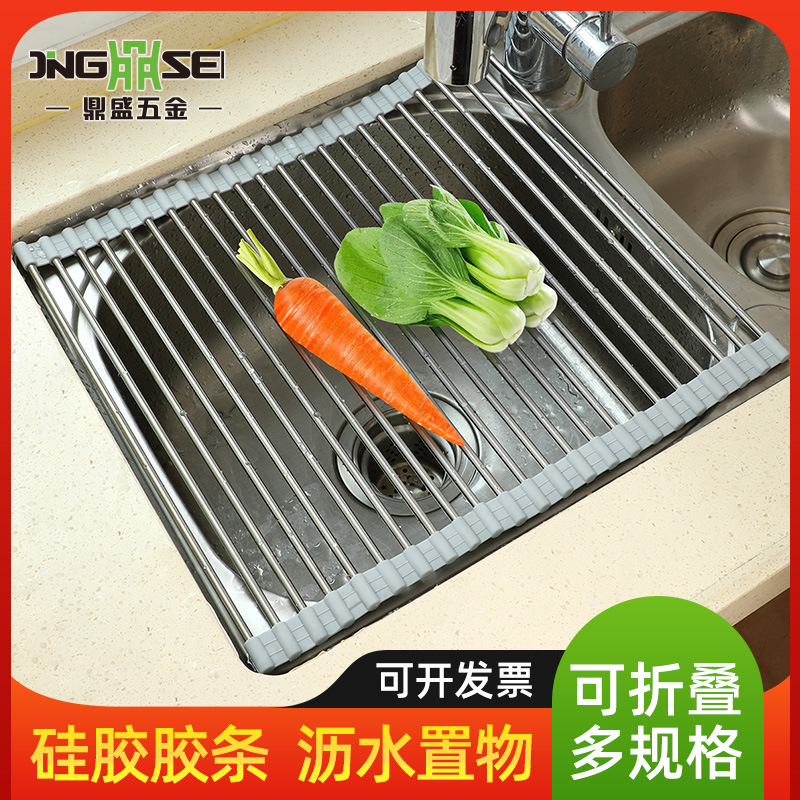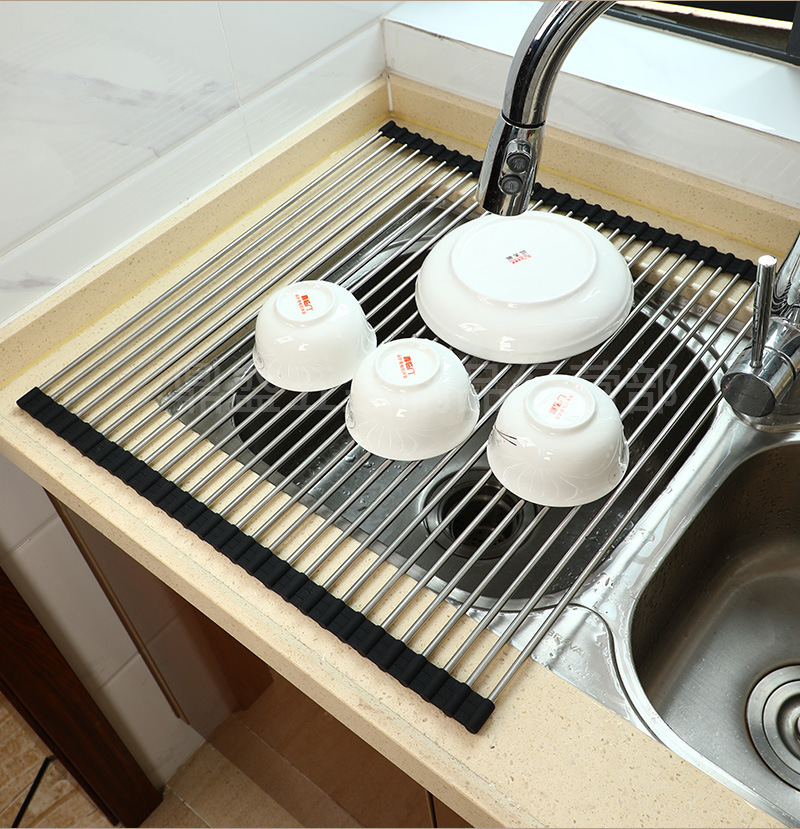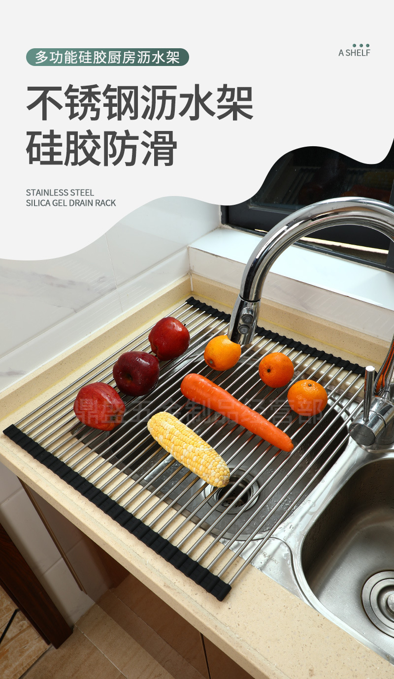 실리콘 접이식 식기 세척 및 배수 랙 스테인레스 스틸 싱크 접시 배수 제어 건조 랙 가정용 과일 및 야채 떨어지는 랙스토어 가기