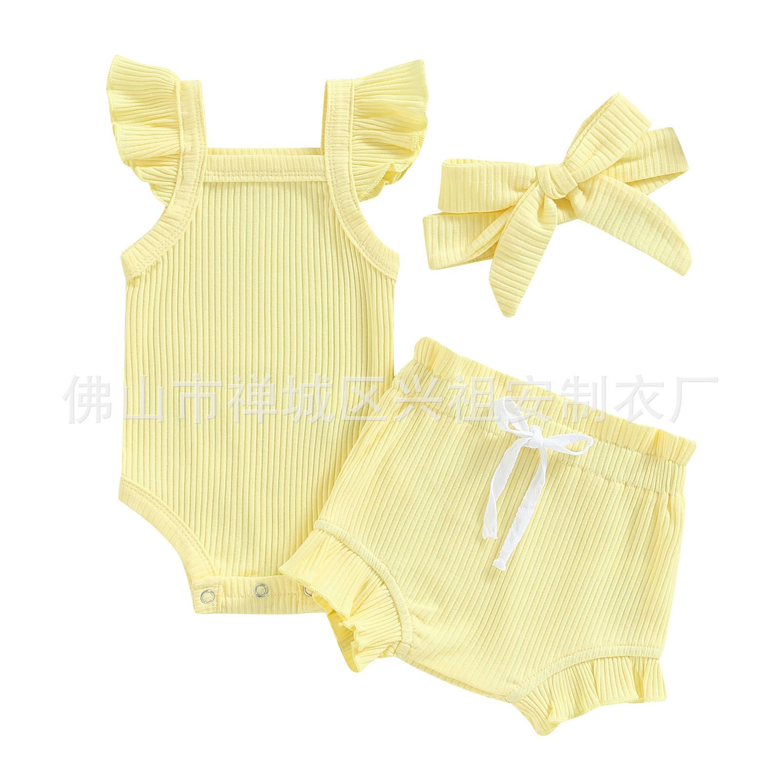 아기 여름 슬링 옷 + 반바지 쓰리피스 캐주얼 여성 아기 단색 구덩이 스트립 점프 슈트 세트