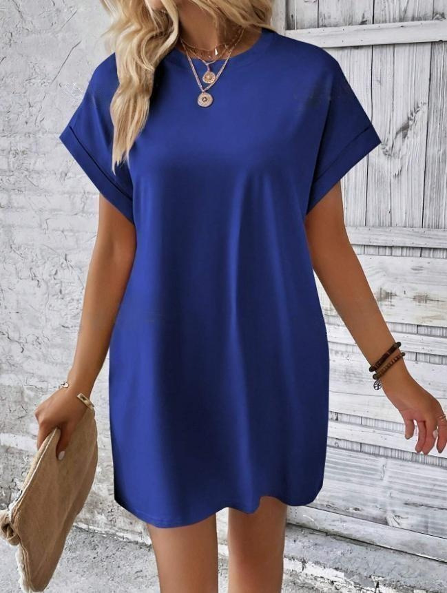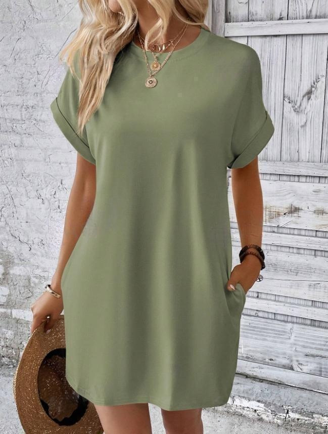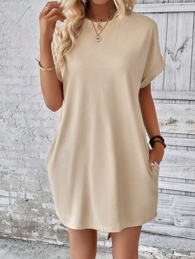 아마존 2024 유럽과 미국의 새로운 캐주얼 솔리드 컬러 라운드 넥 박쥐 소매 보이지 않는 포켓 원피스