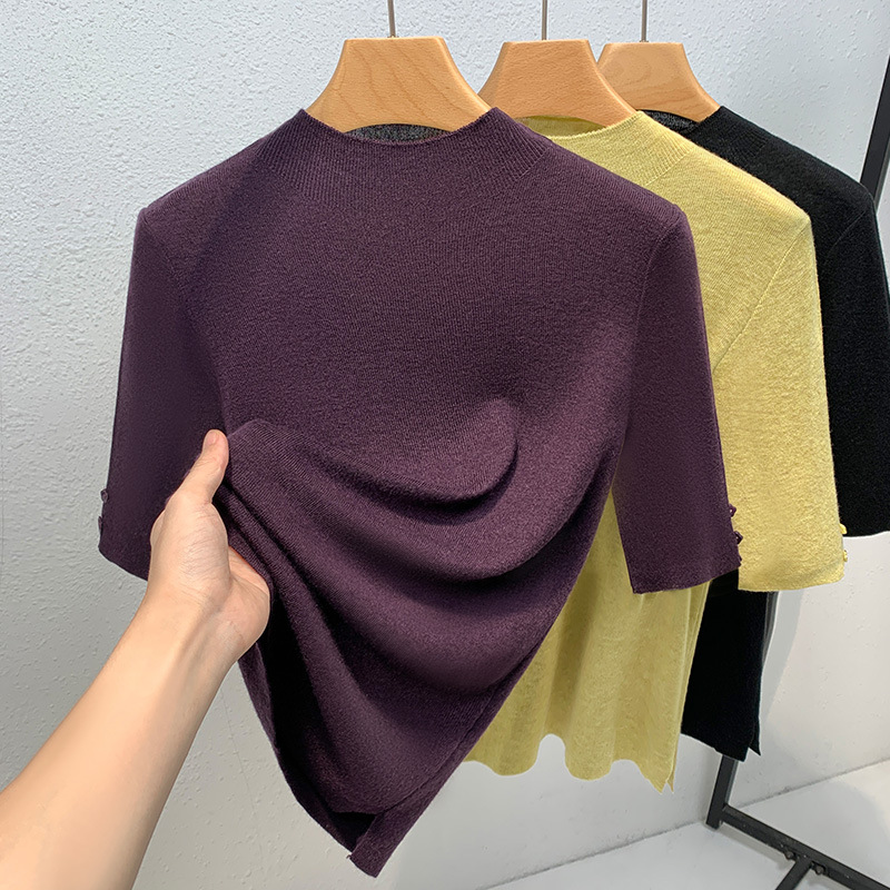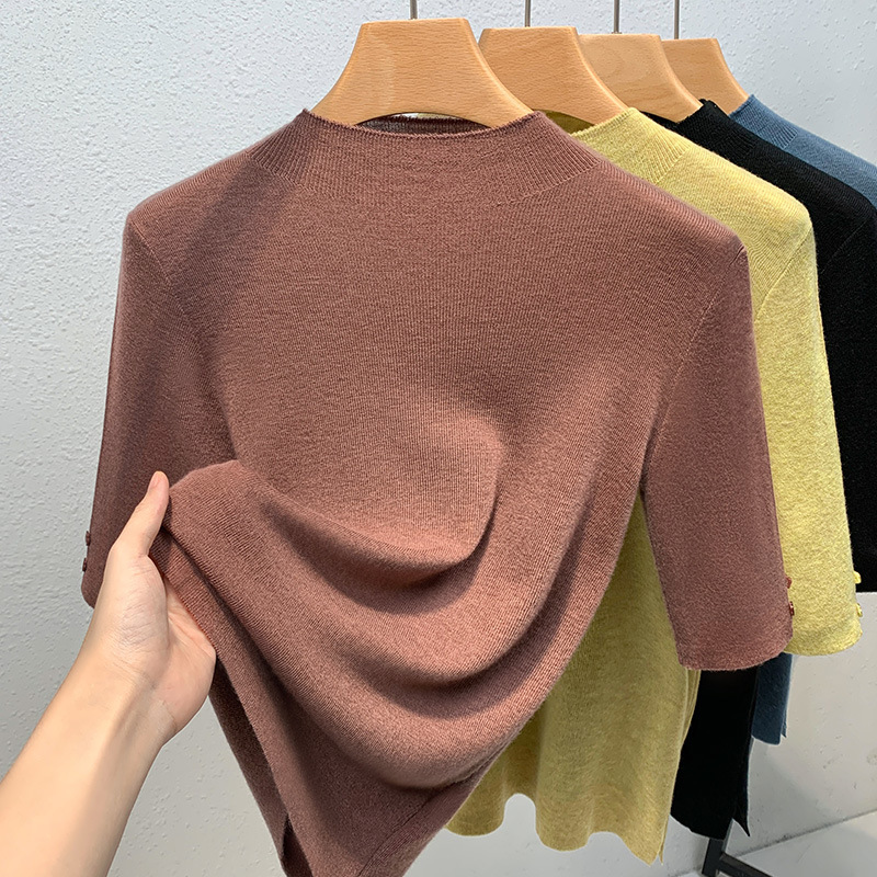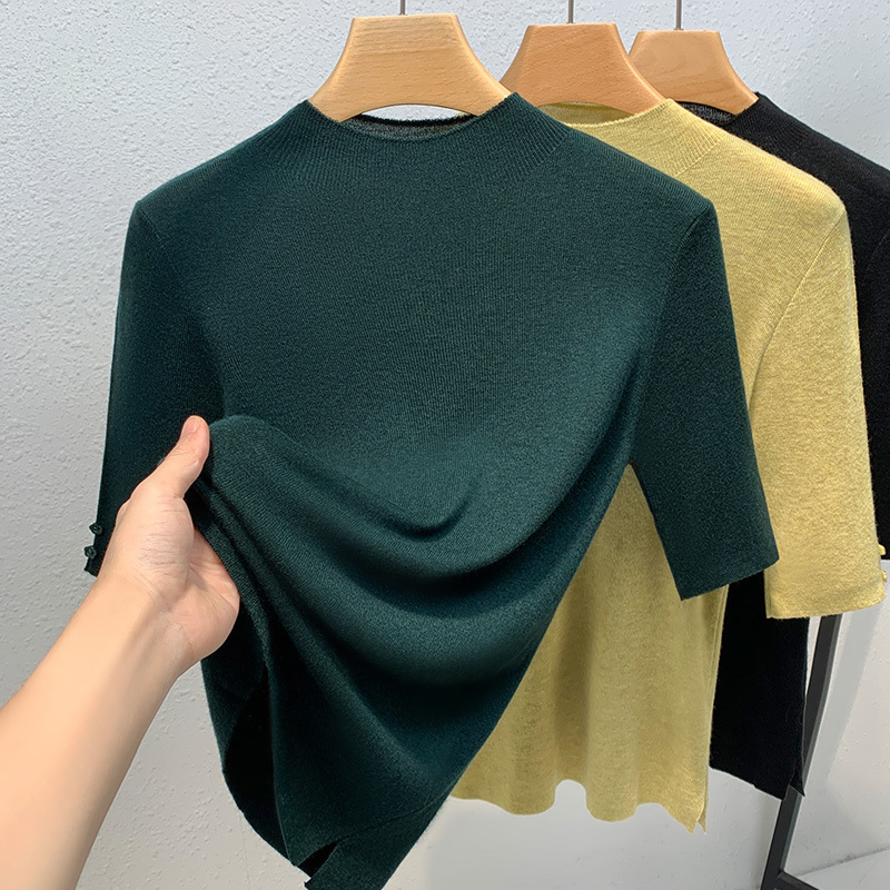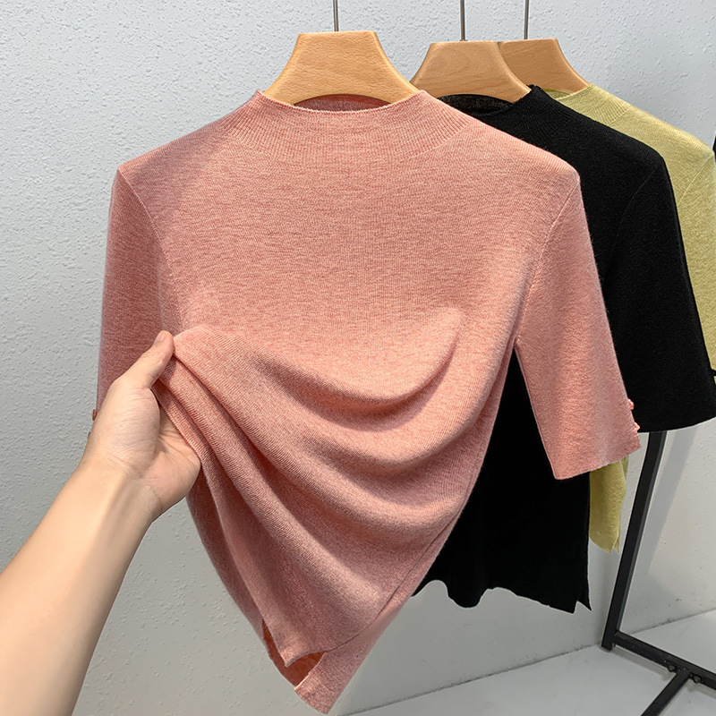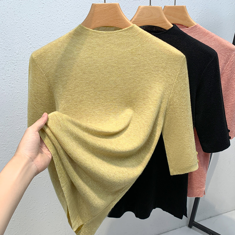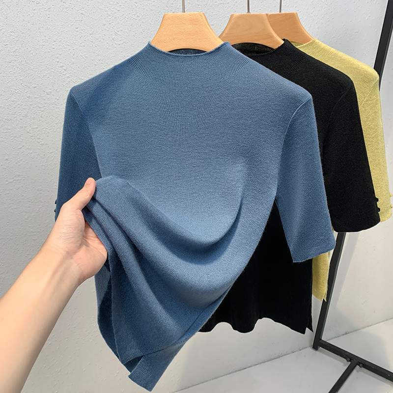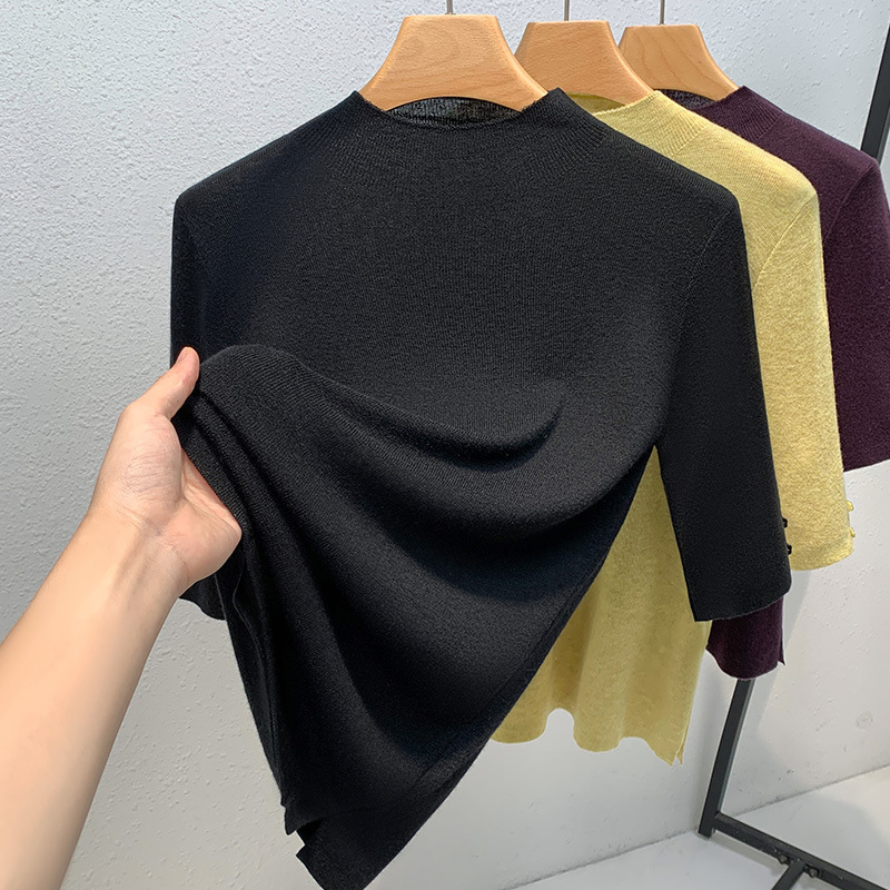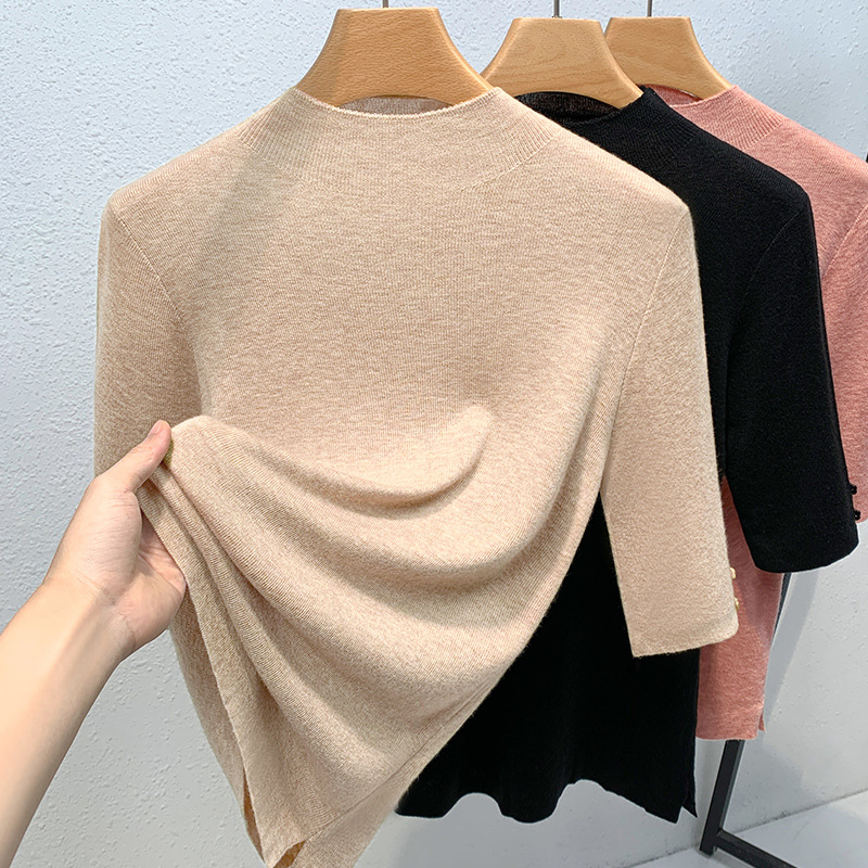 반하이넥 이너웨어 여성 2025 신상 여성복 단색 중간 소매 풀오버 양모 셔츠 얇은 스타일 허리 조임 상의