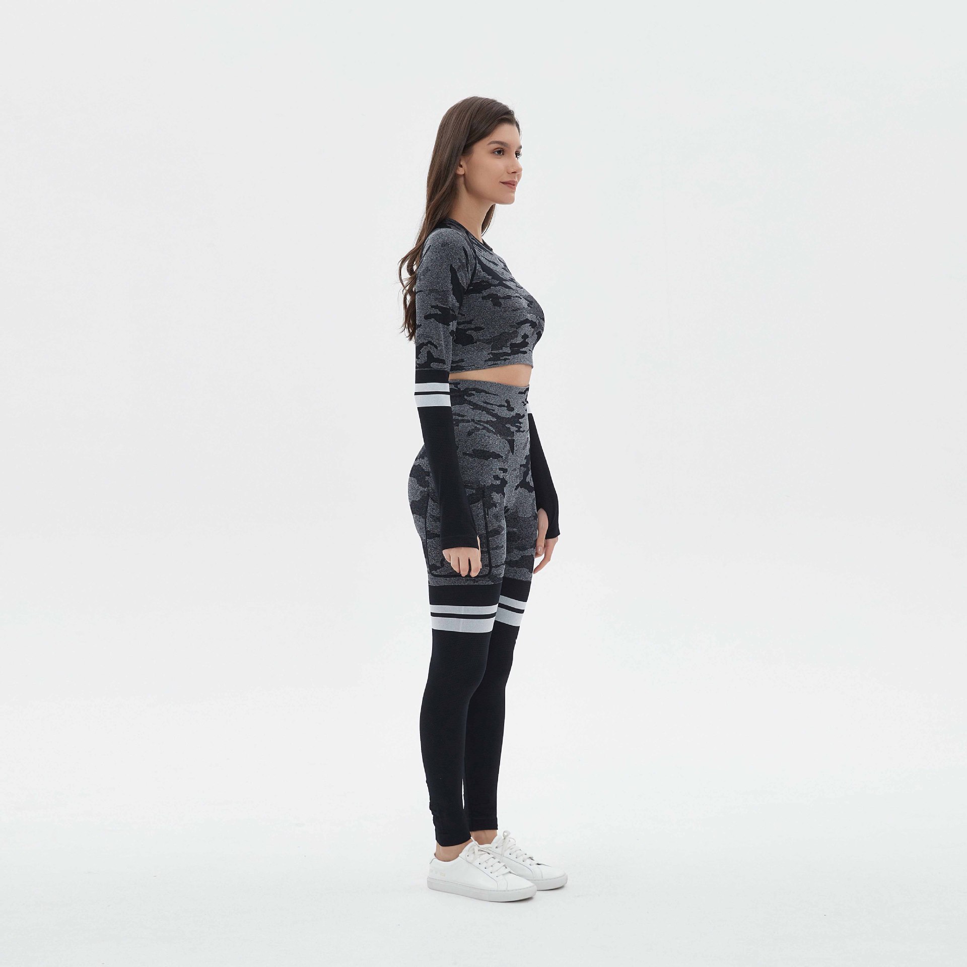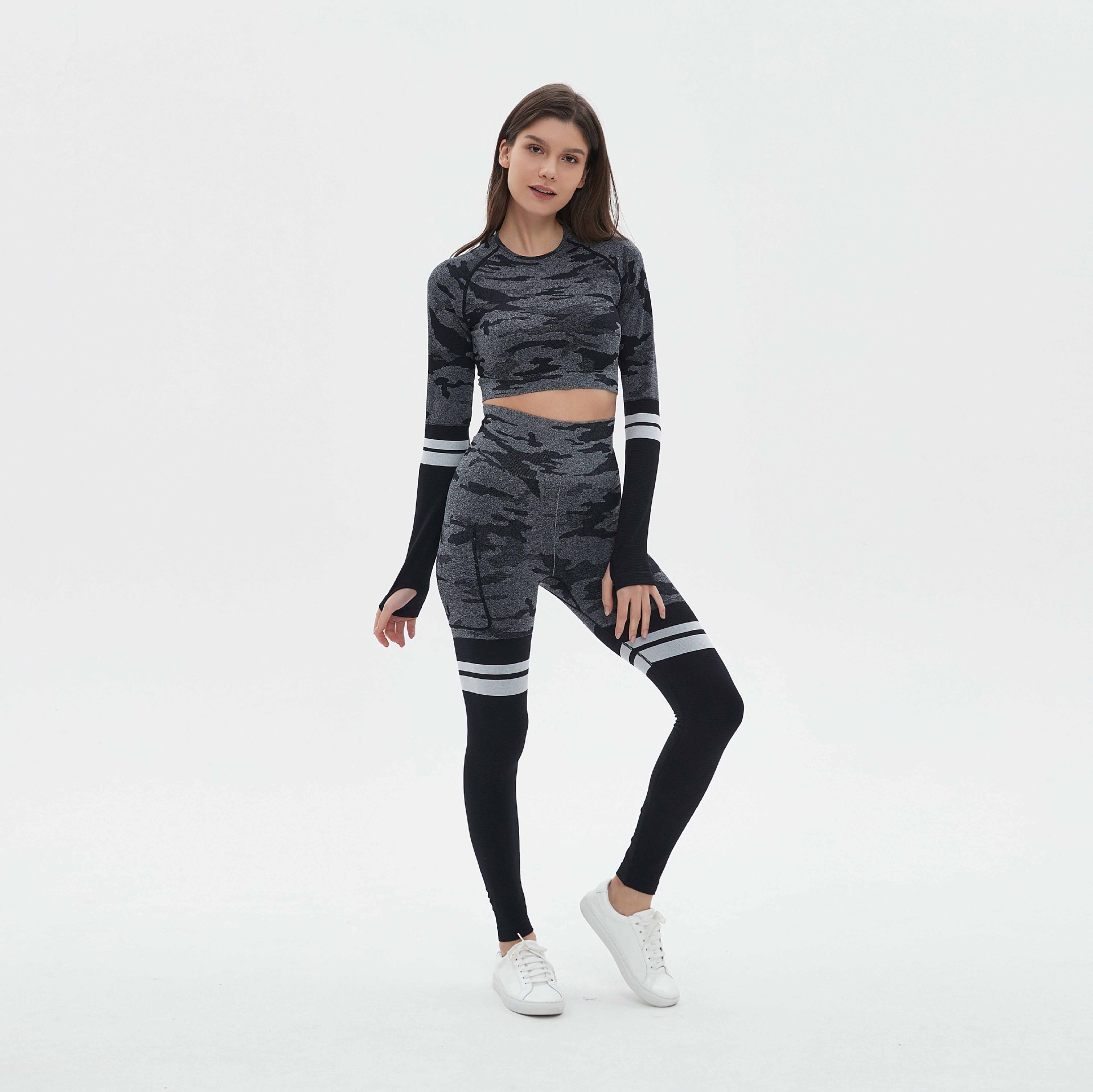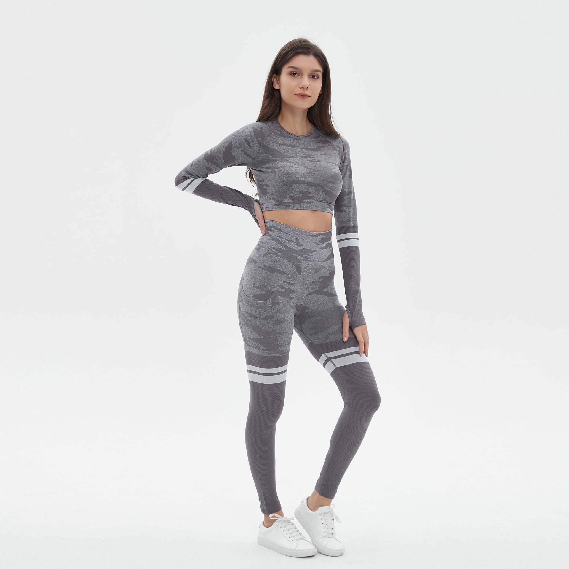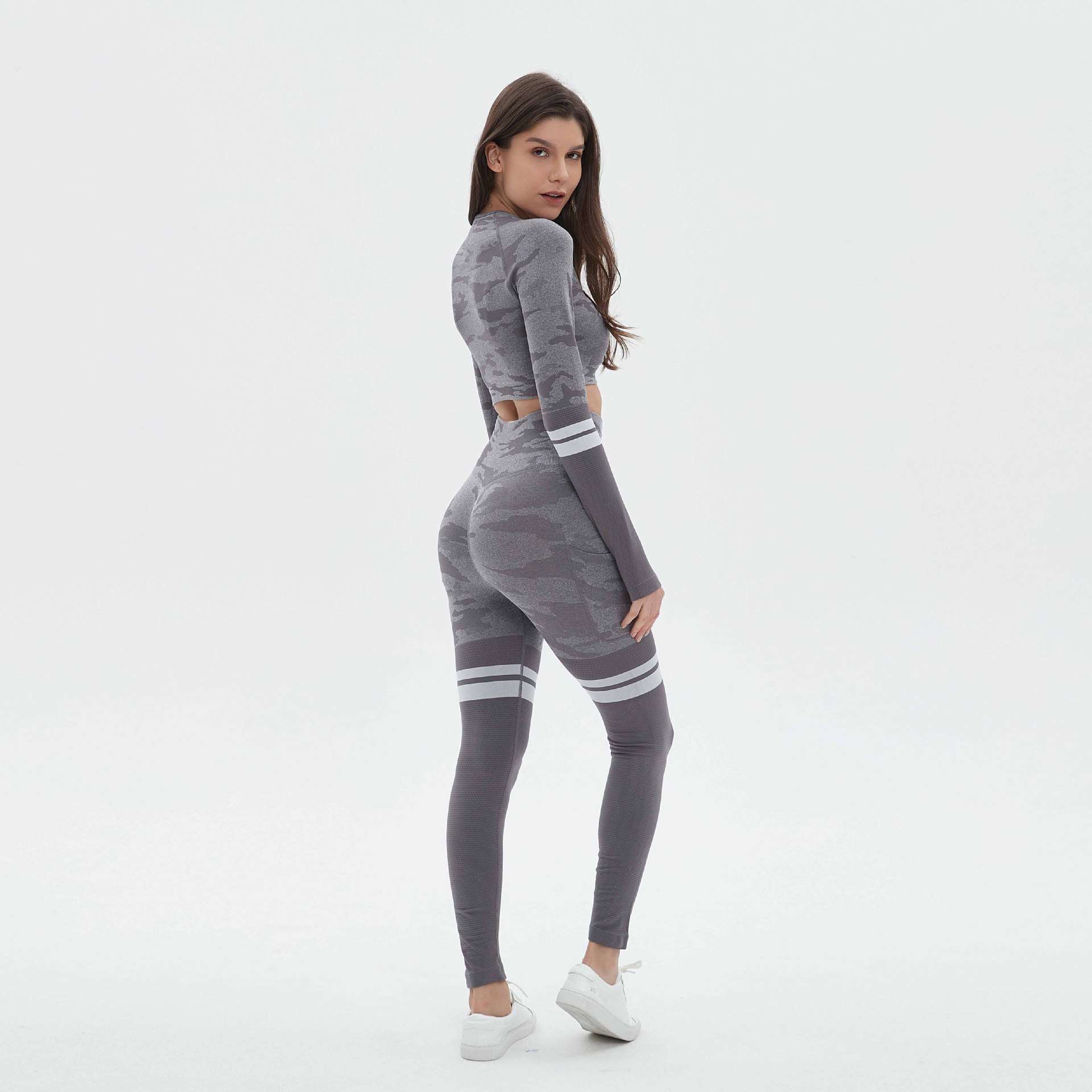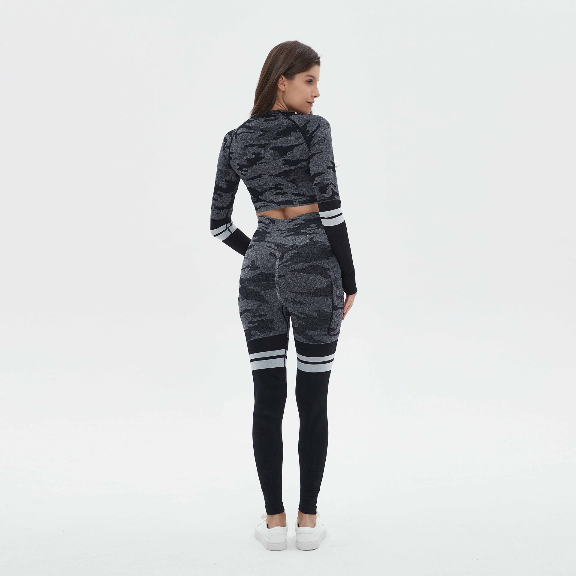 국경을 넘는 유럽과 미국의 위장 원활한 요가 의류 세트 스포츠 세트 여성의 땀 흡수성 빠른 건조 피트니스 의류 높은 허리 요가 바지스토어 가기