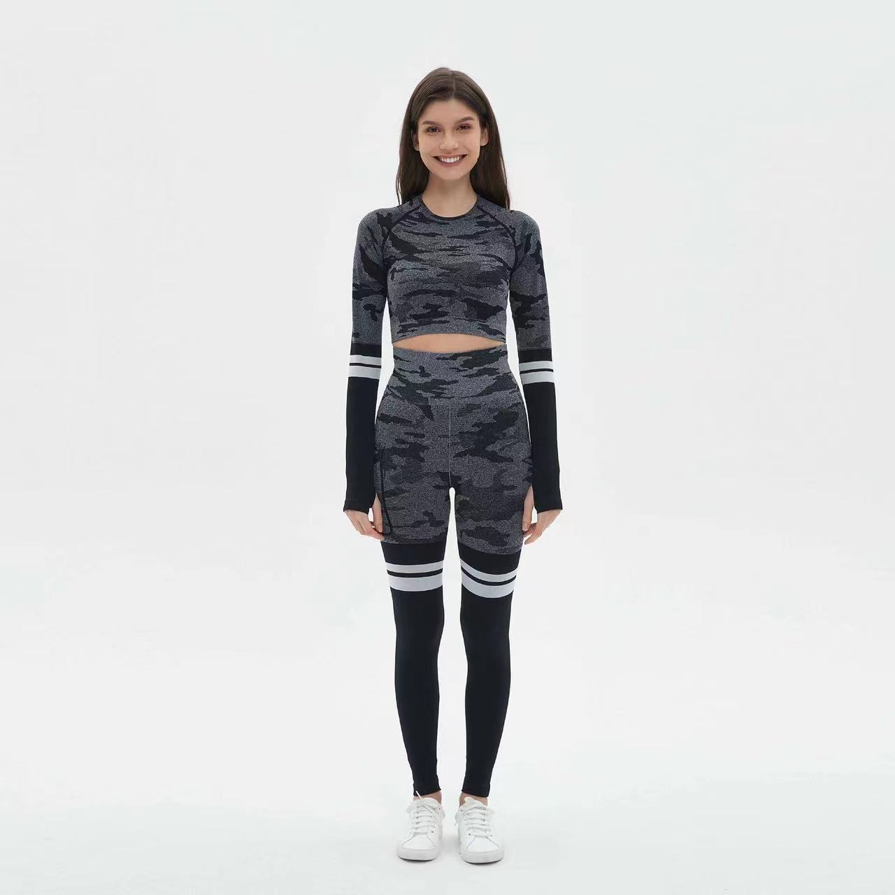 국경을 넘는 유럽과 미국의 위장 원활한 요가 의류 세트 스포츠 세트 여성의 땀 흡수성 빠른 건조 피트니스 의류 높은 허리 요가 바지