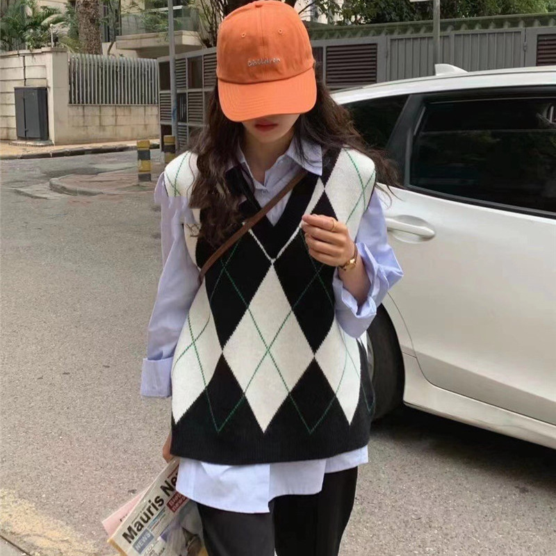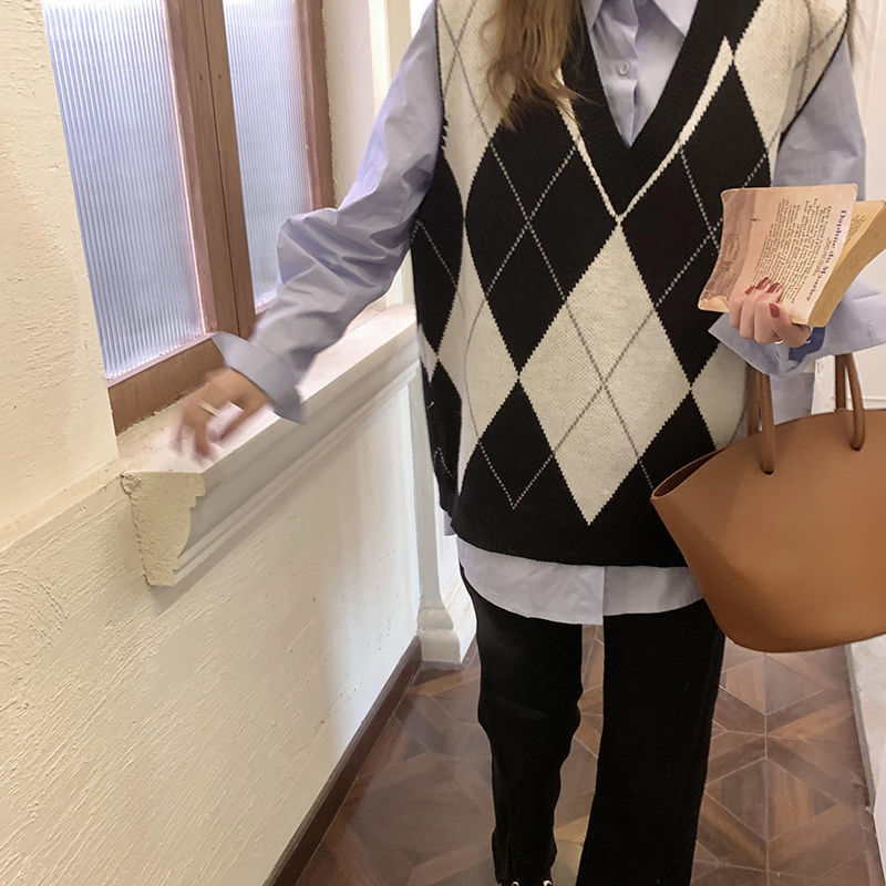 니트 조끼 여성용 2025 신상 가을 겨울 아우터 마름모 무늬 스웨터 조끼 코트 인스 스타일 레이어드 브이넥 조끼스토어 가기