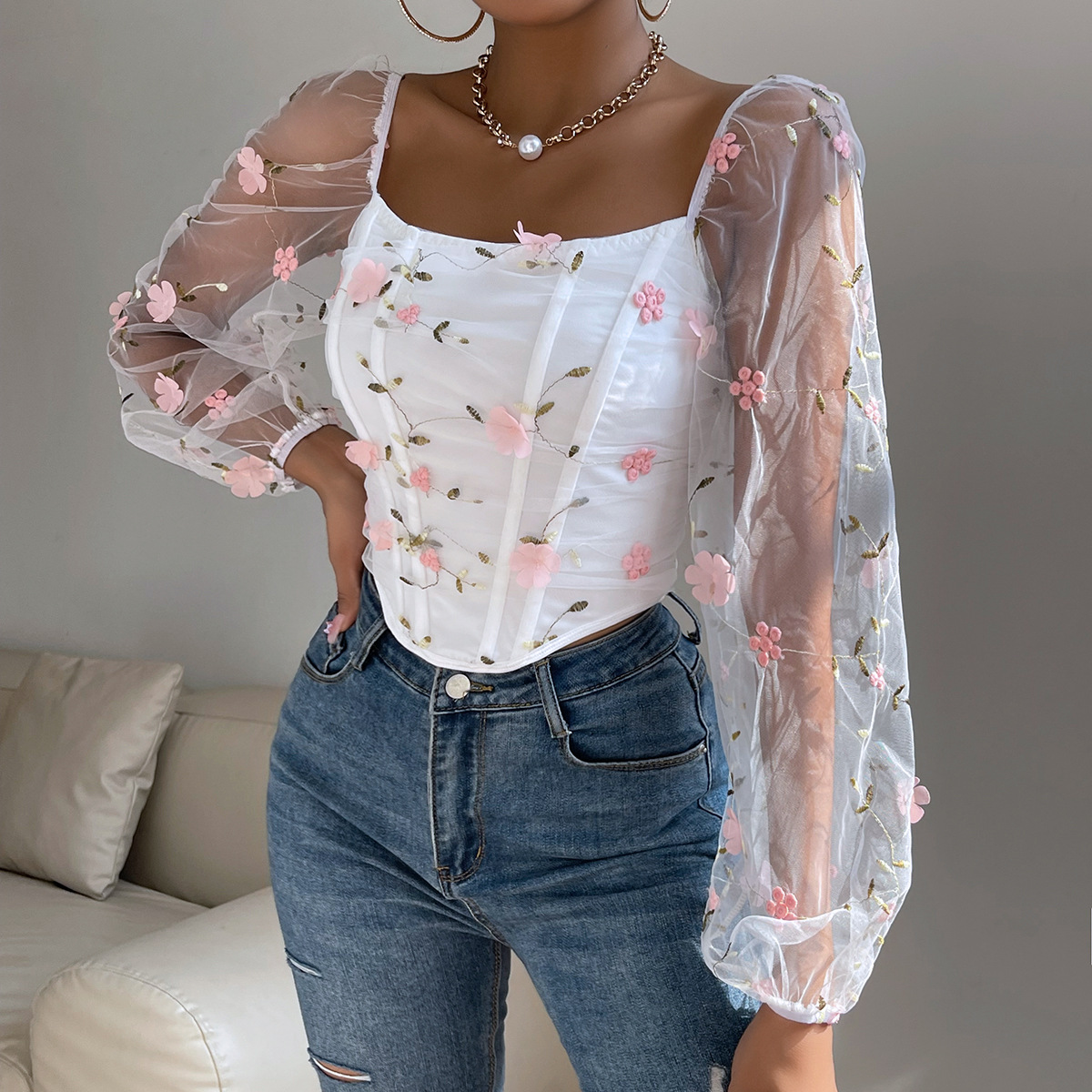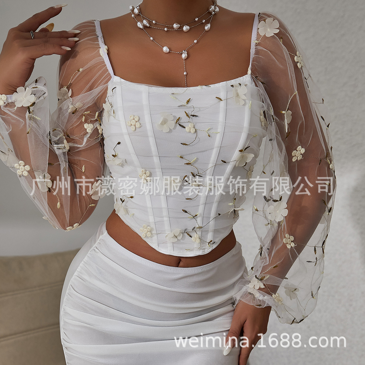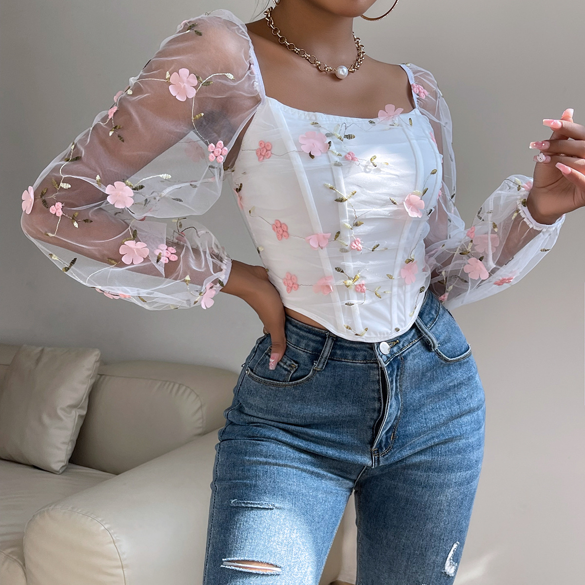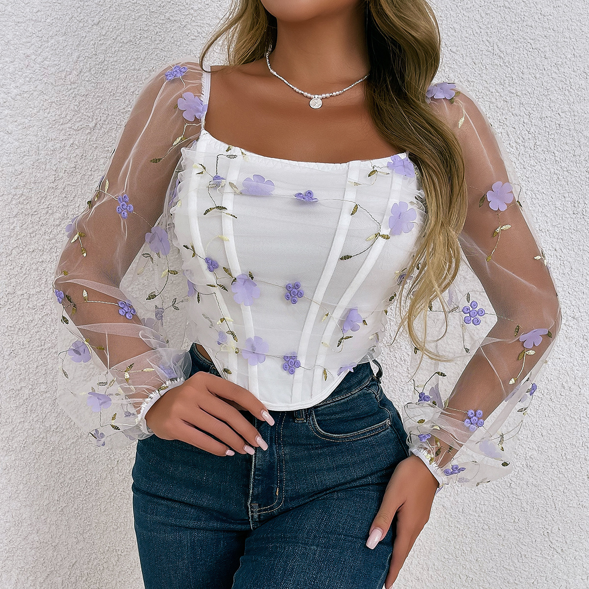 국경을 넘나 드는 유럽과 미국의 여성 인스타그램 스타일 섹시 메쉬 관점 자수 꽃 이중층 어본 긴팔 코르셋 60706