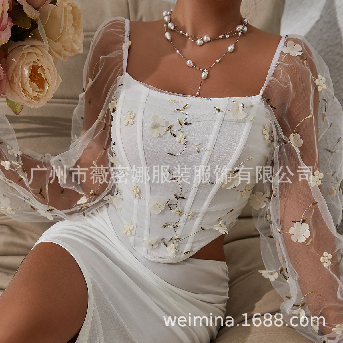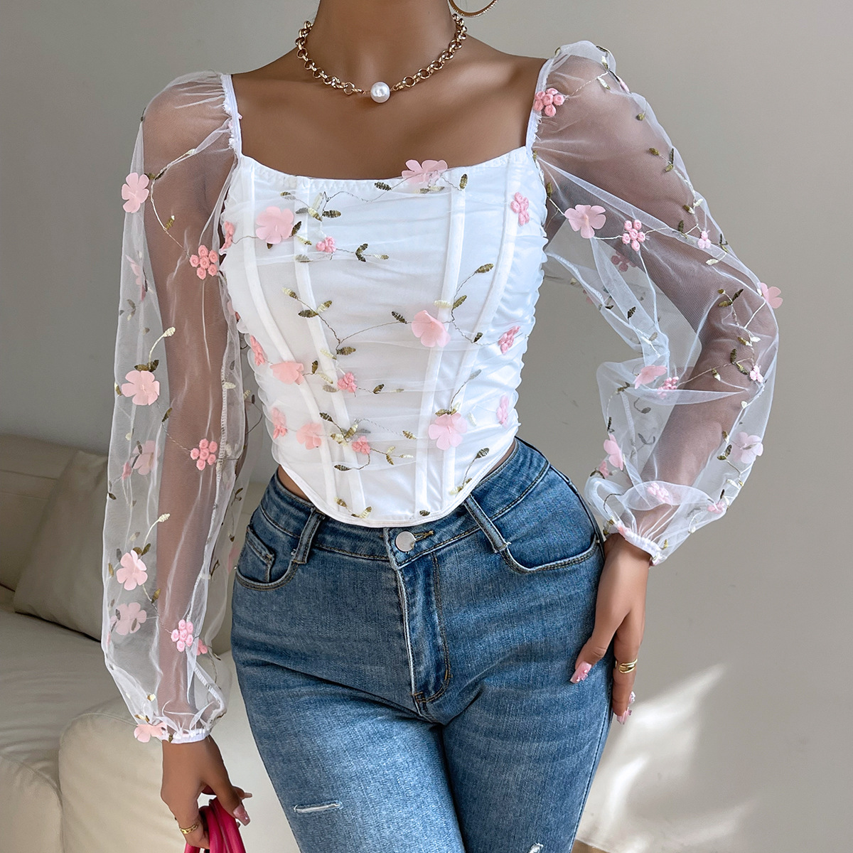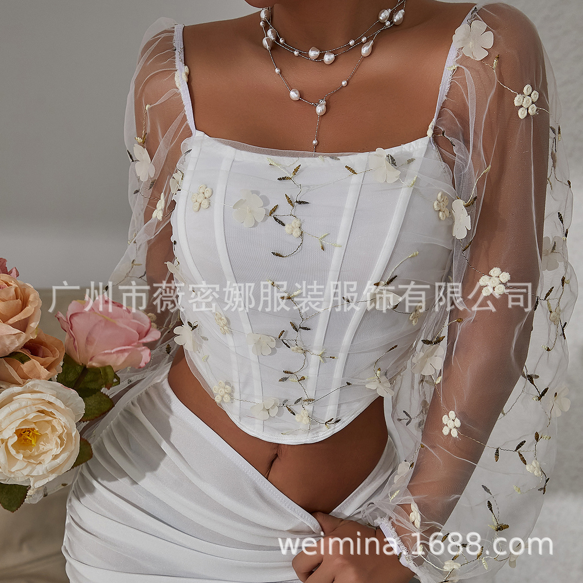 국경을 넘나 드는 유럽과 미국의 여성 인스타그램 스타일 섹시 메쉬 관점 자수 꽃 이중층 어본 긴팔 코르셋 60706