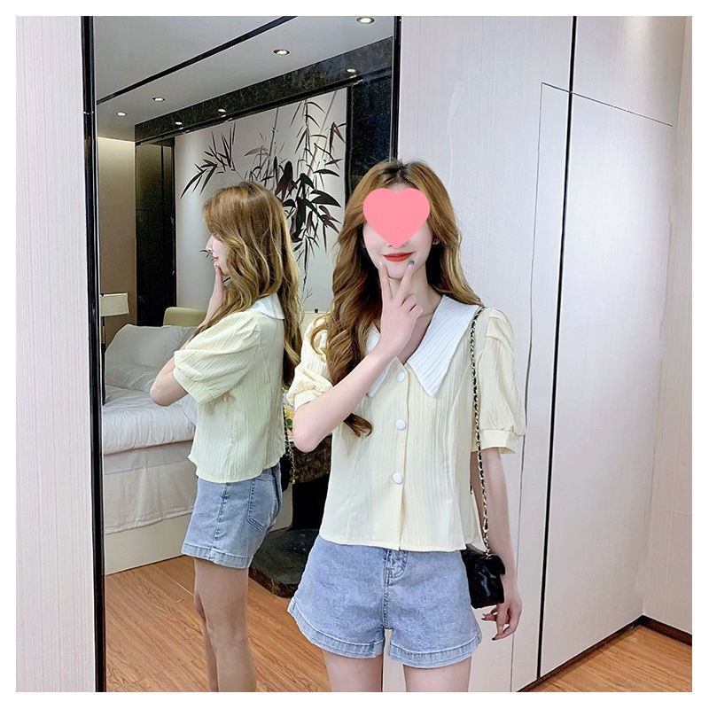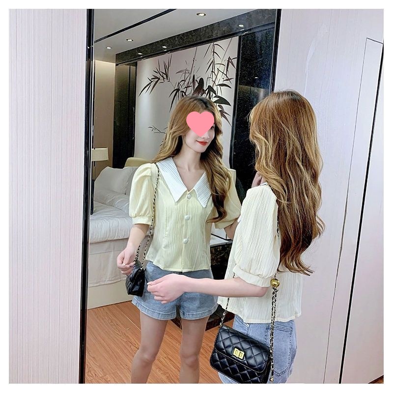 인형 칼라 쉬폰 셔츠 여성용 새 여름 우아한 퍼프 슬리브 waistline 젠틀 스위트 셔츠 쇼트 탑스토어 가기