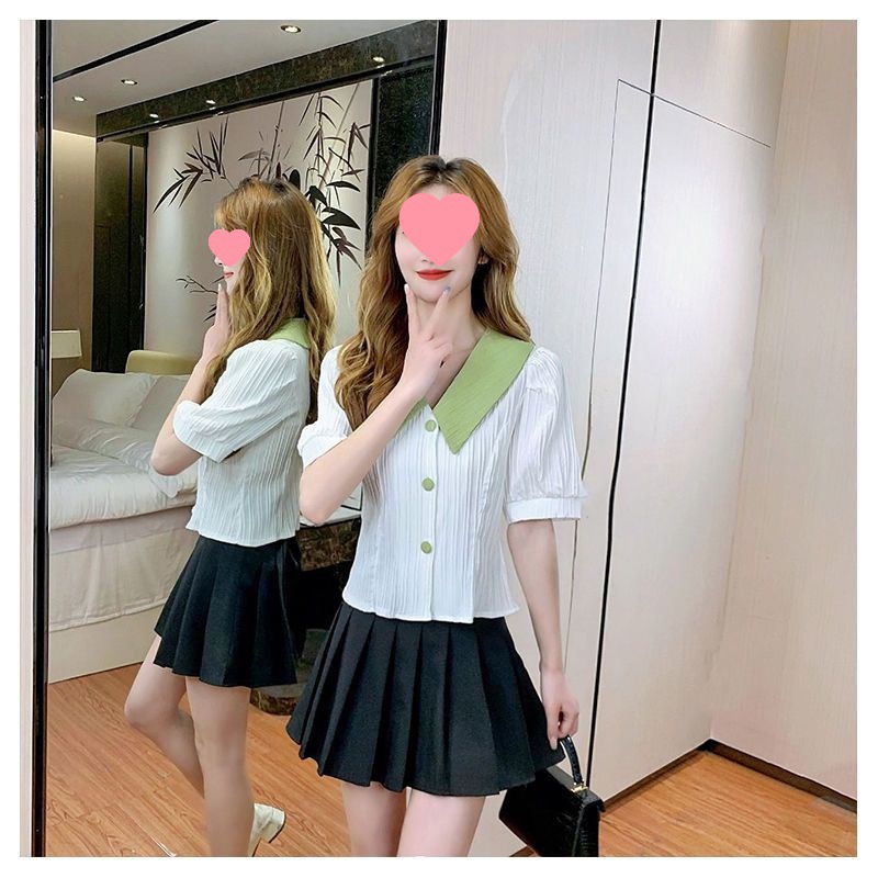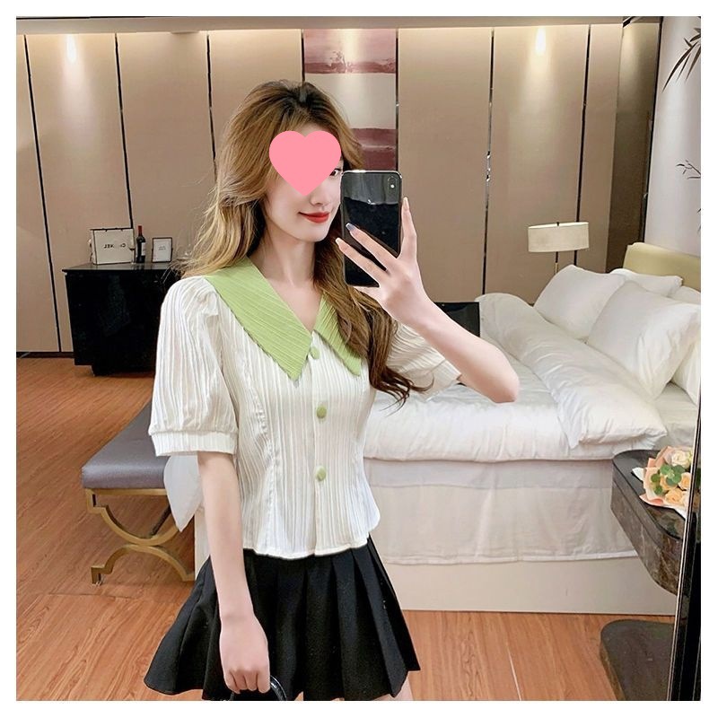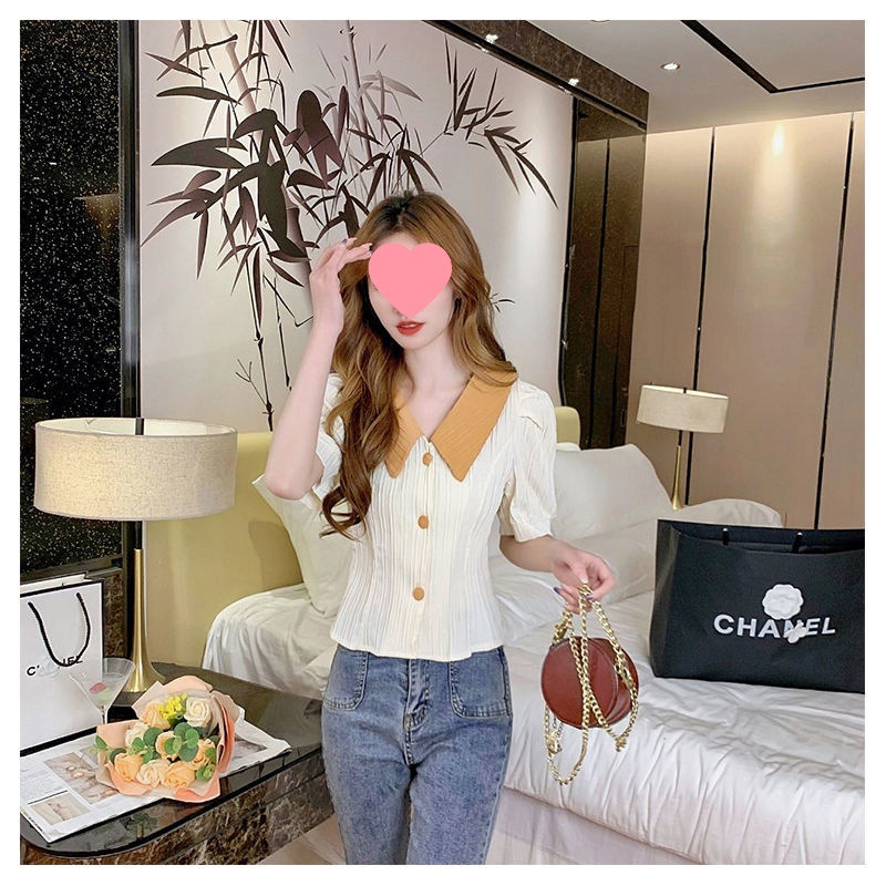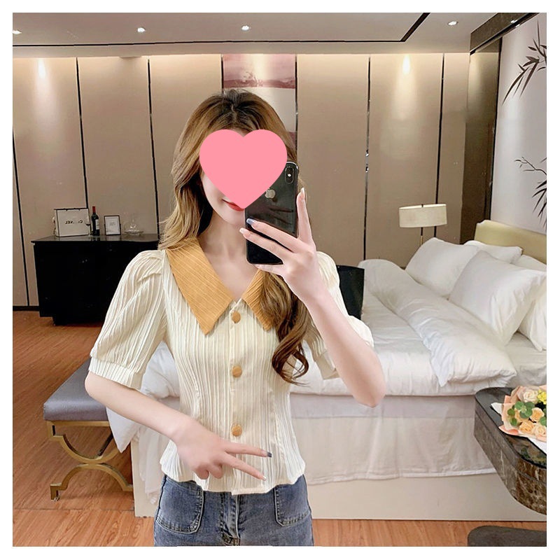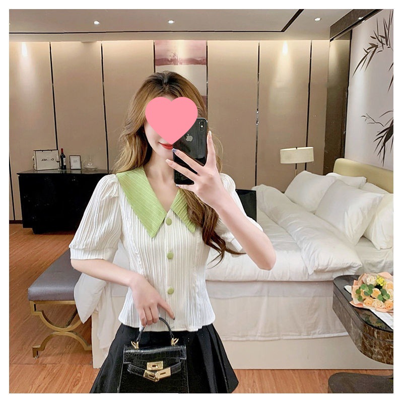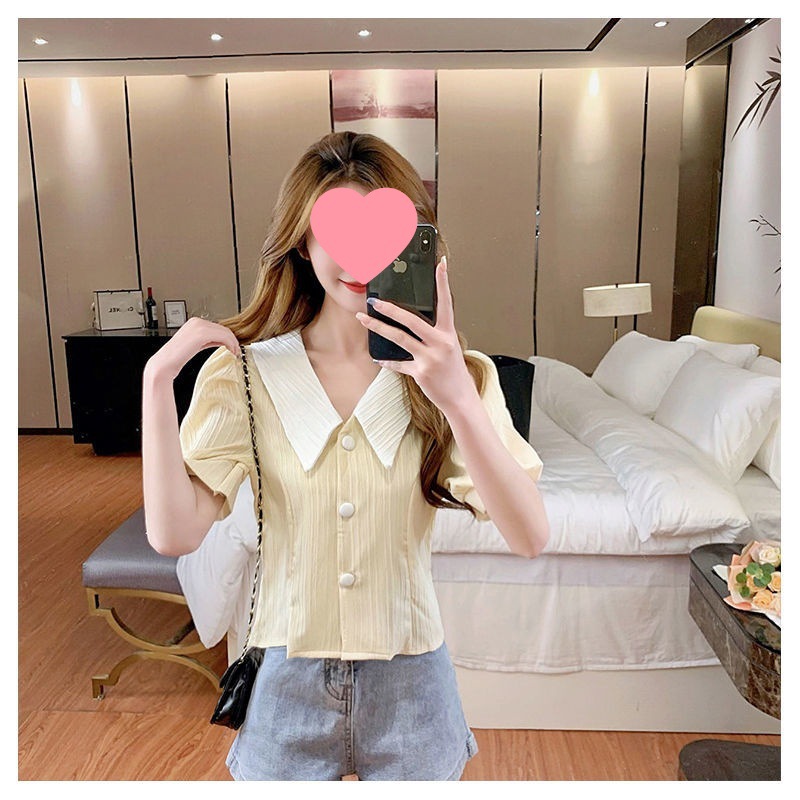 인형 칼라 쉬폰 셔츠 여성용 새 여름 우아한 퍼프 슬리브 waistline 젠틀 스위트 셔츠 쇼트 탑