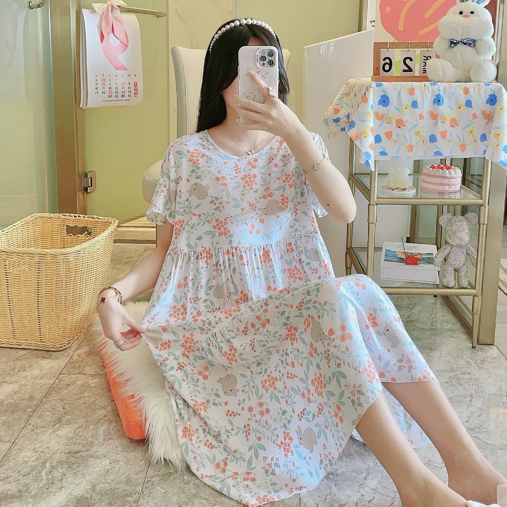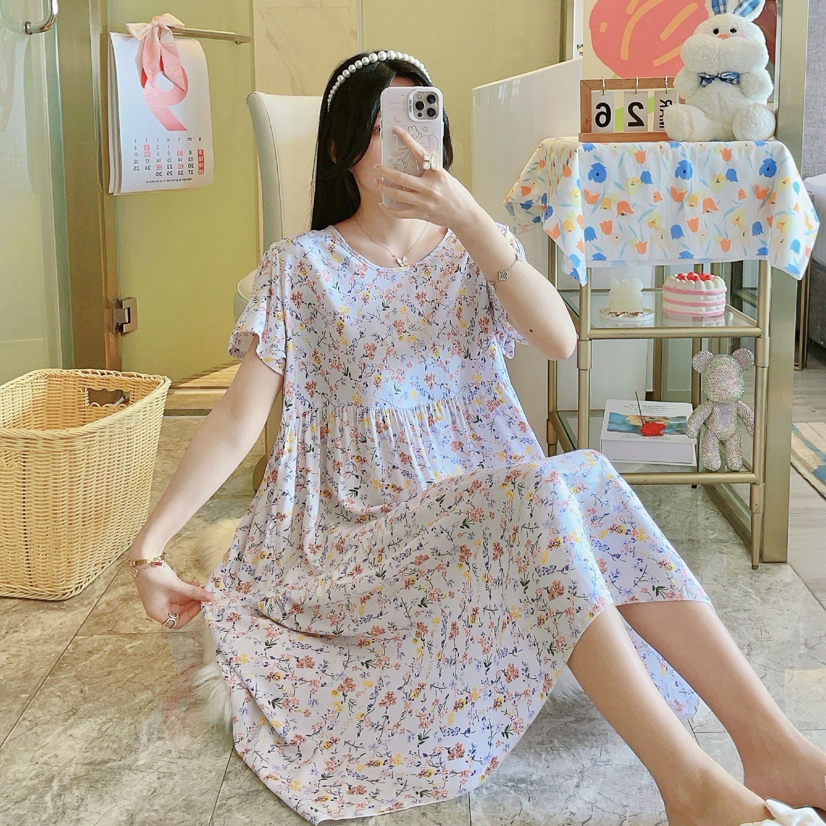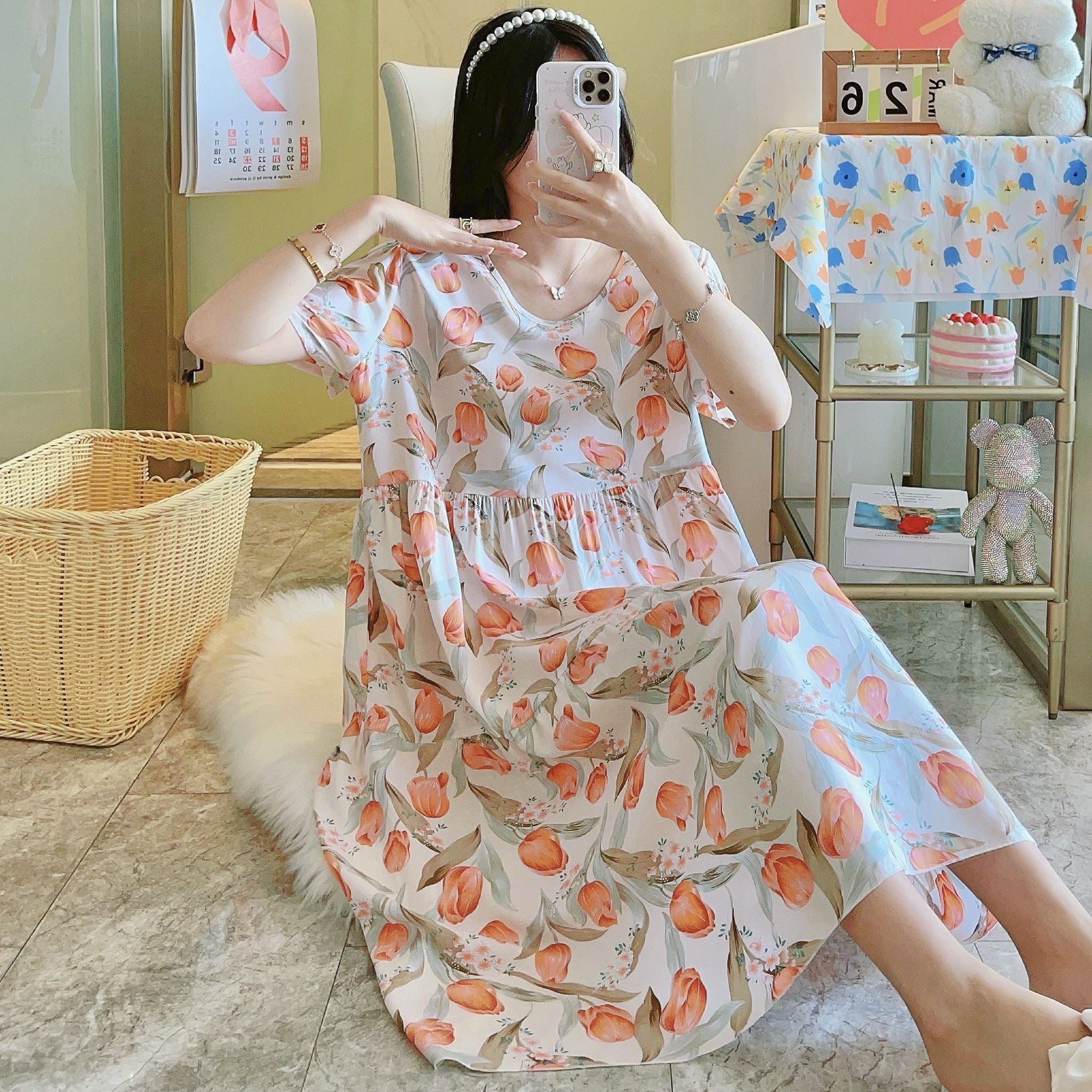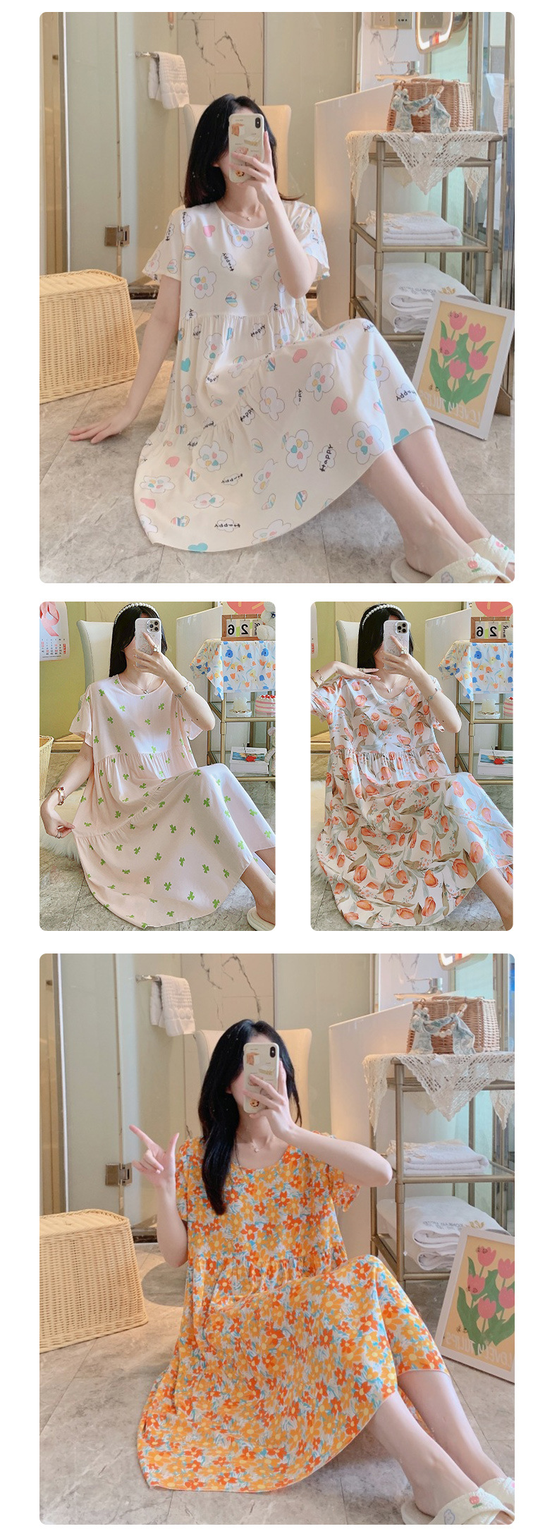면 실크 잠옷 여성용 여름 반팔 대형 사이즈 수출용 프린트 잠옷 봄 가을 얇은 고급 레이온 홈웨어스토어 가기