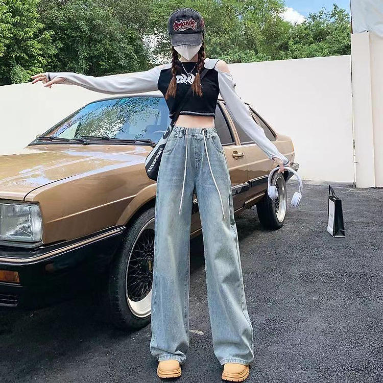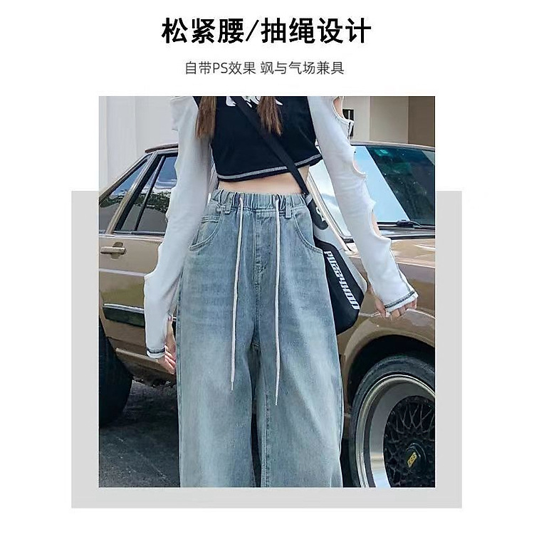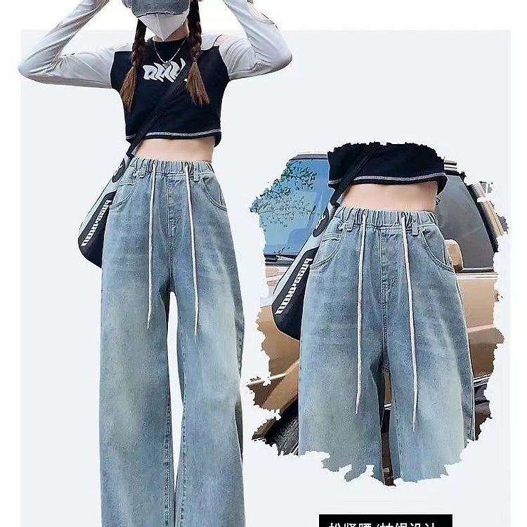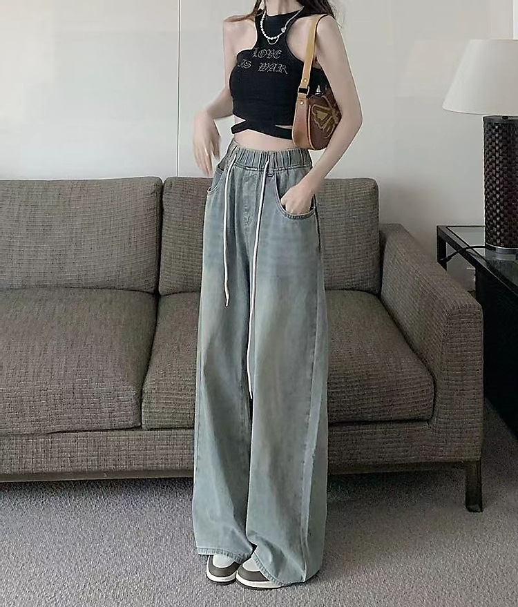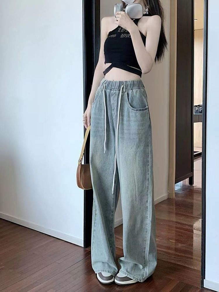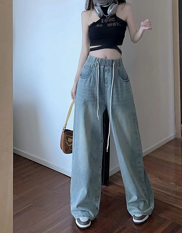 여성을위한 레트로 탄성 허리 드로스트링 청바지 봄과 여름 한국 스타일의 높은 허리 슬리밍 스트레이트 와이드 다리 걸레 바지스토어 가기