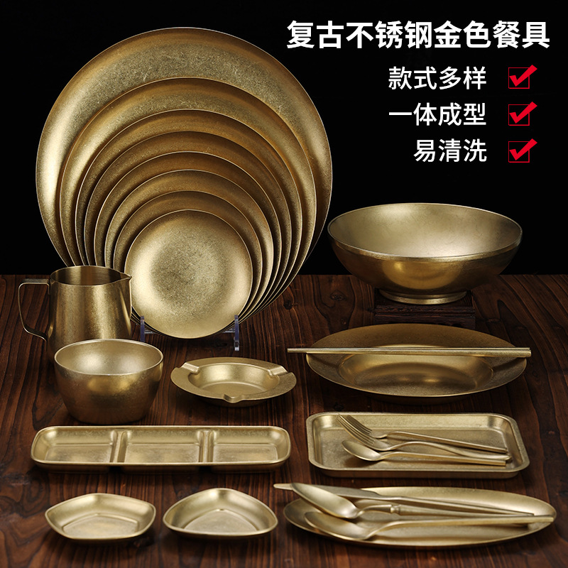 밝은 럭셔리 복고풍 스노우 골드 플레이트 304 스테인레스 스틸 플레이트 골든 디스크 얕은 플레이트 산업 스타일 트레이 높은 컬러 값 플레이트스토어 가기
