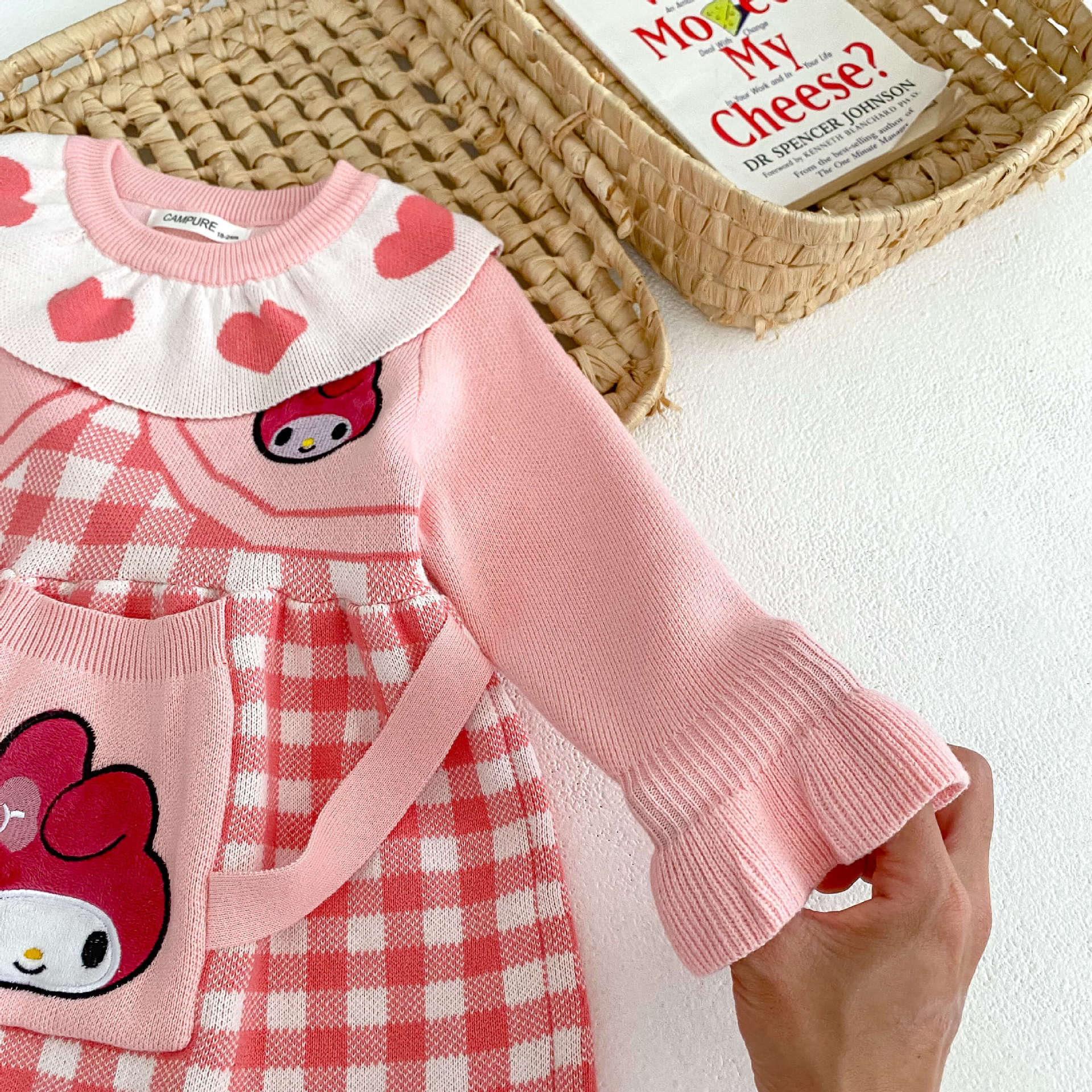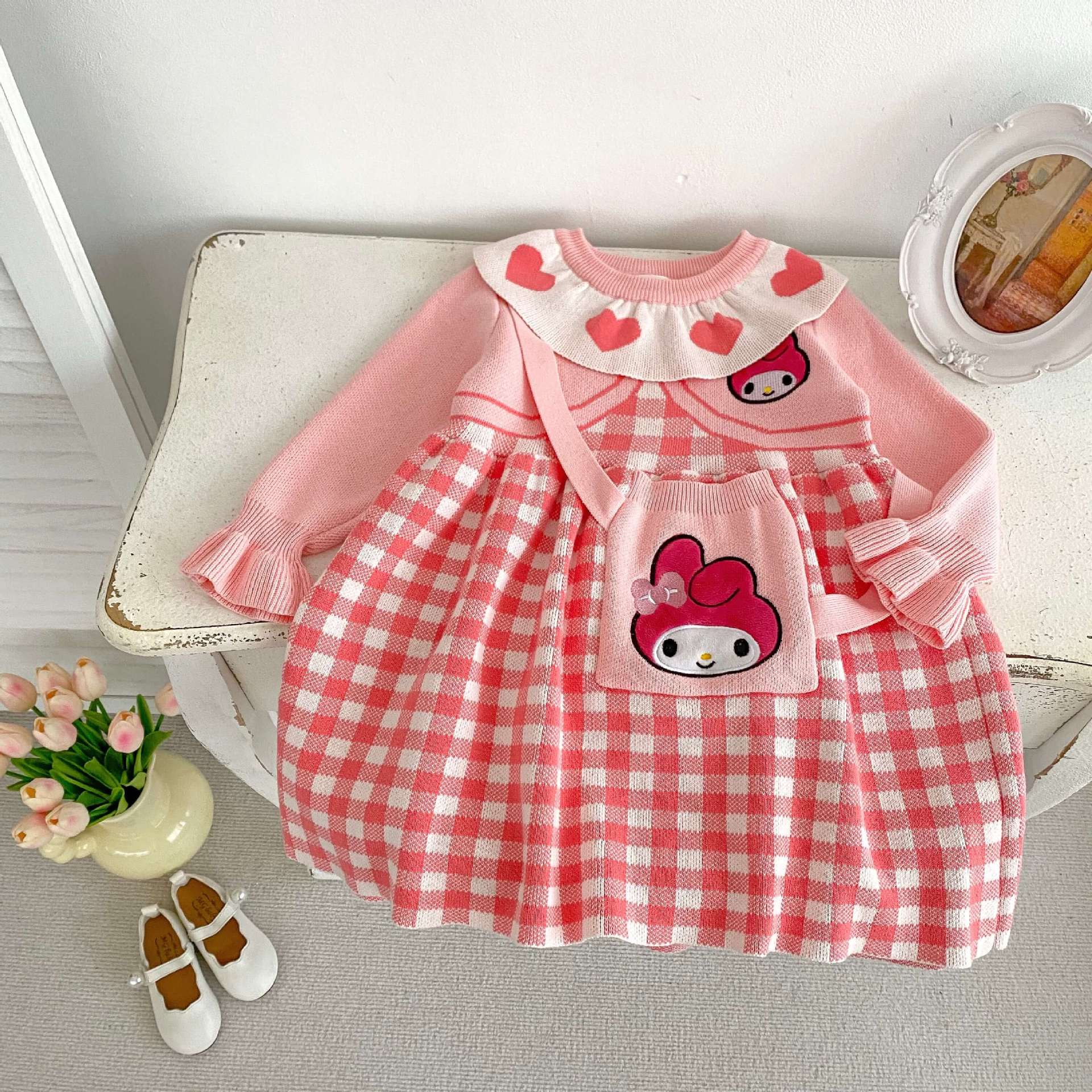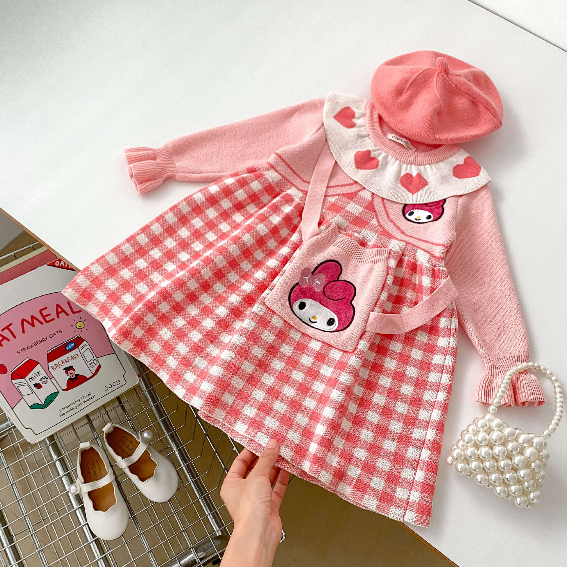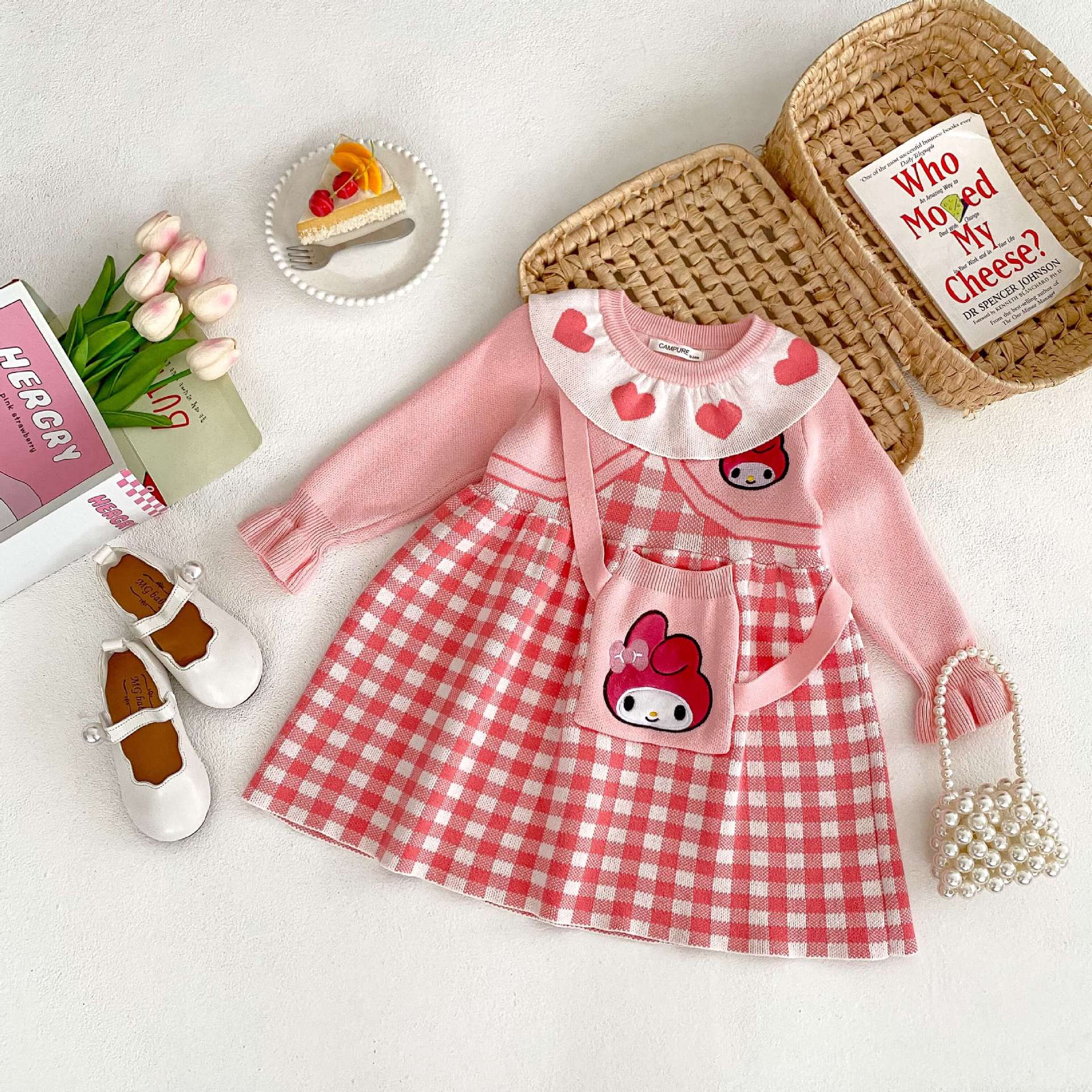 달콤한 멜로디 핑크 스웨터 원피스 소녀 가을과 겨울 원피스 어린 소녀 만화 긴 소매 체크 무늬 니트 스커트스토어 가기