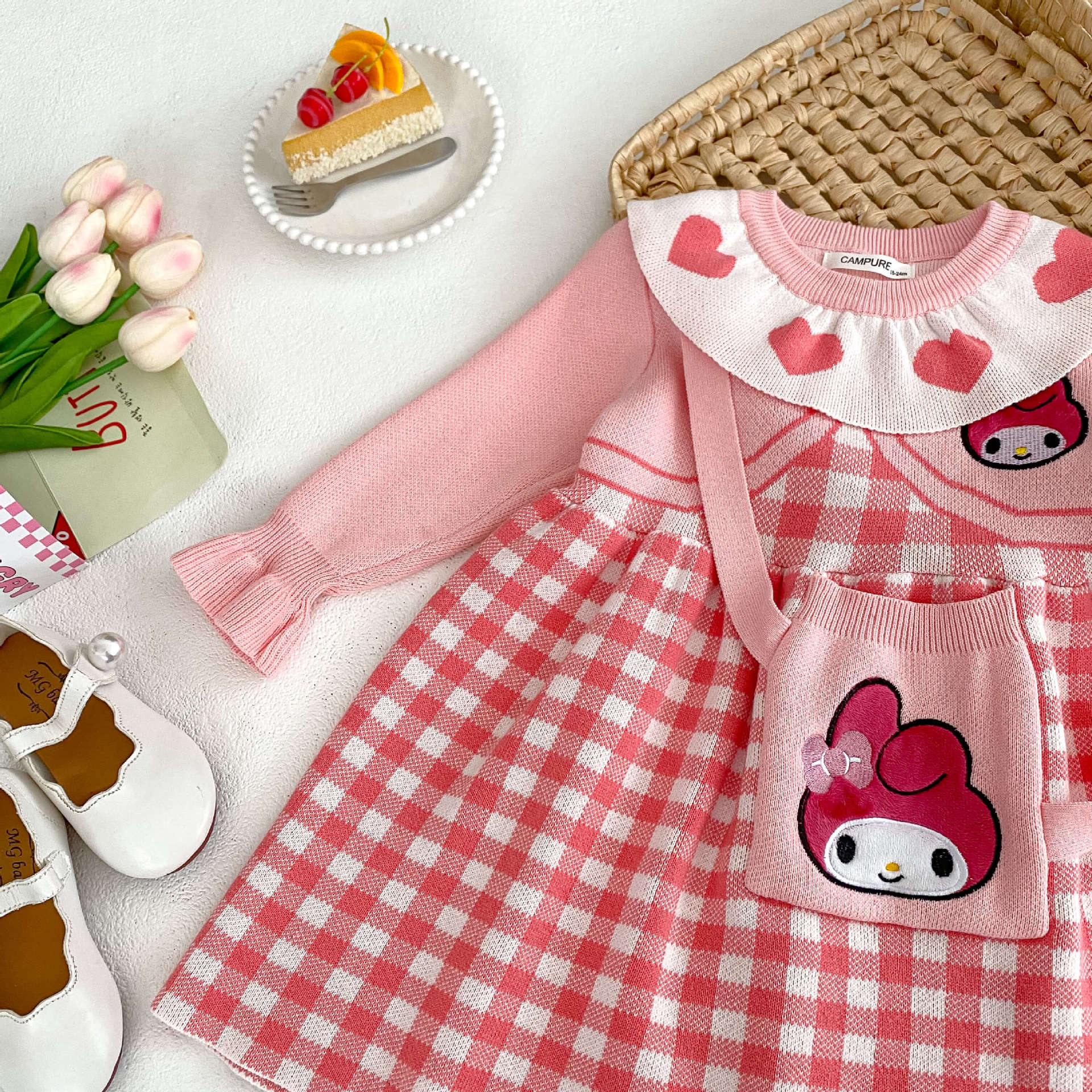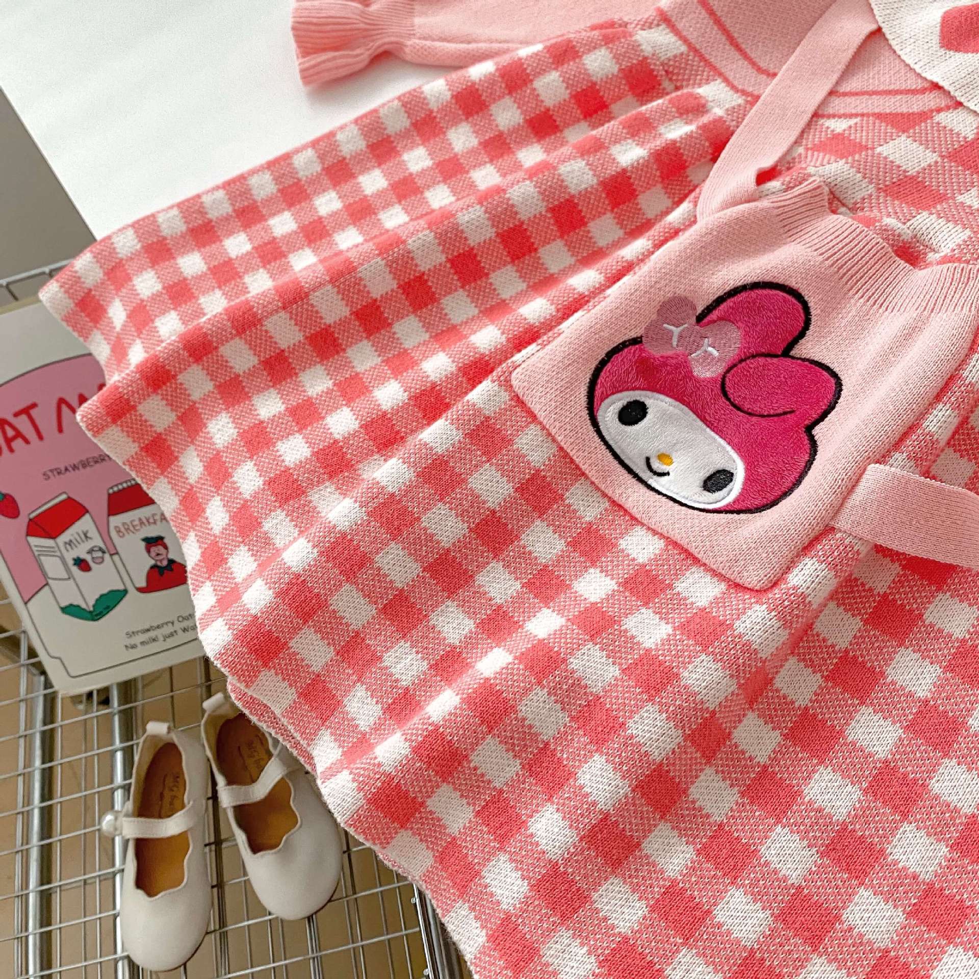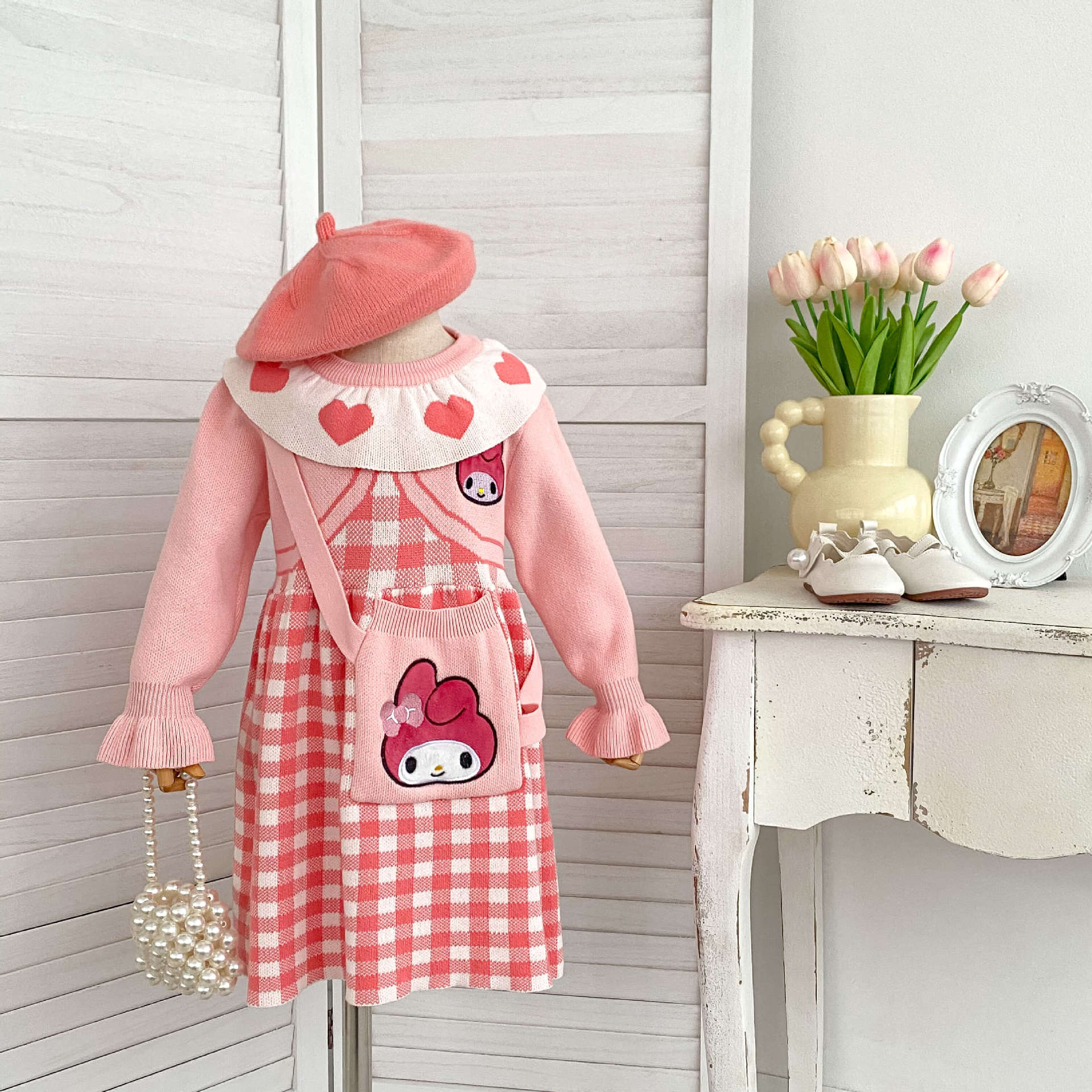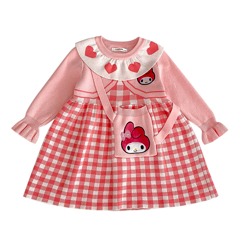 달콤한 멜로디 핑크 스웨터 원피스 소녀 가을과 겨울 원피스 어린 소녀 만화 긴 소매 체크 무늬 니트 스커트스토어 가기