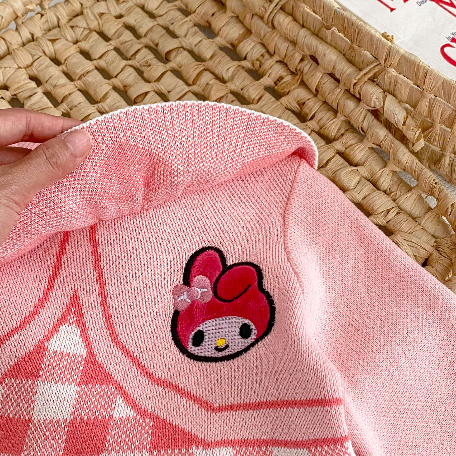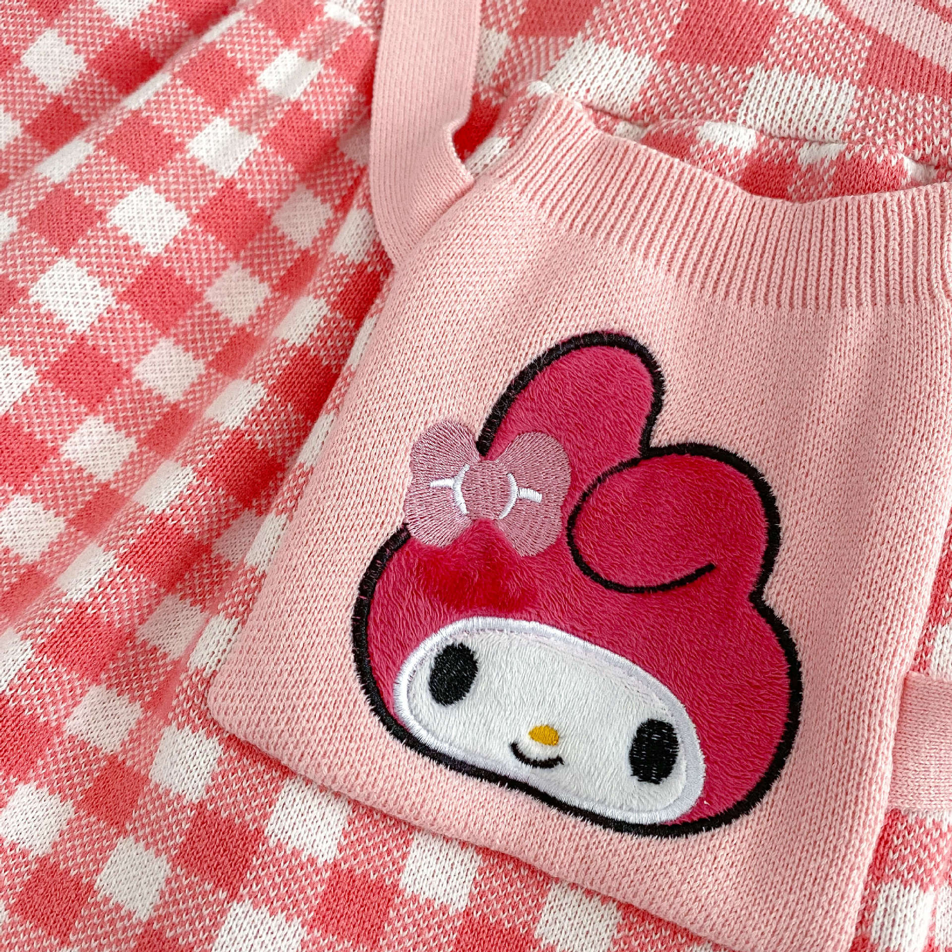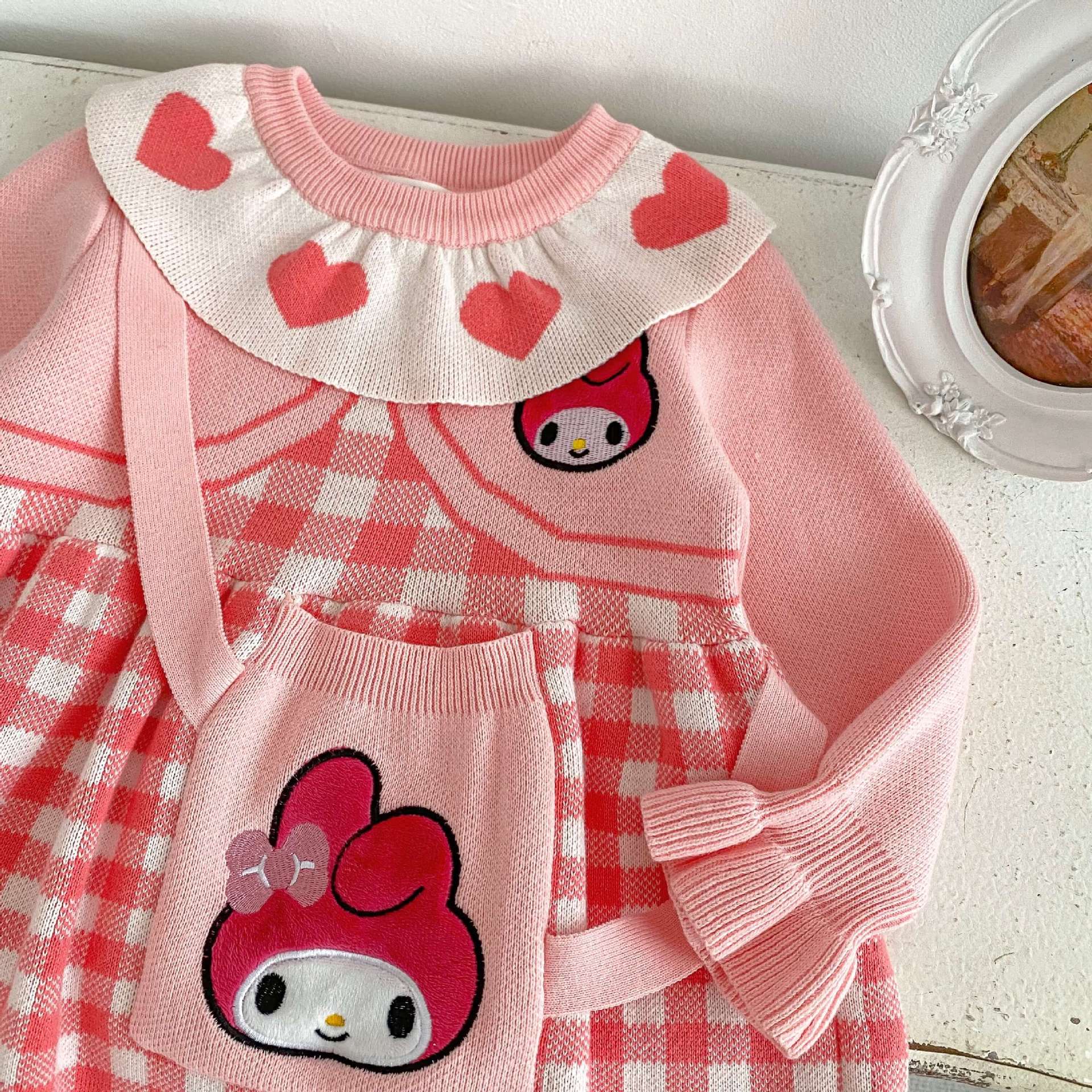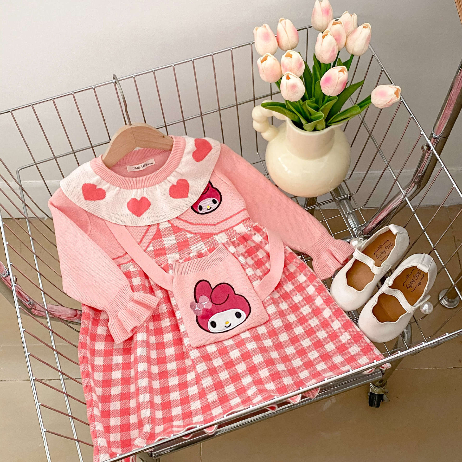 달콤한 멜로디 핑크 스웨터 원피스 소녀 가을과 겨울 원피스 어린 소녀 만화 긴 소매 체크 무늬 니트 스커트스토어 가기