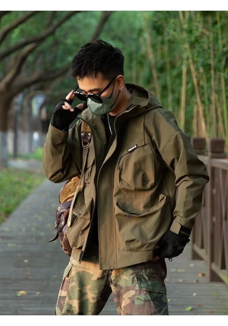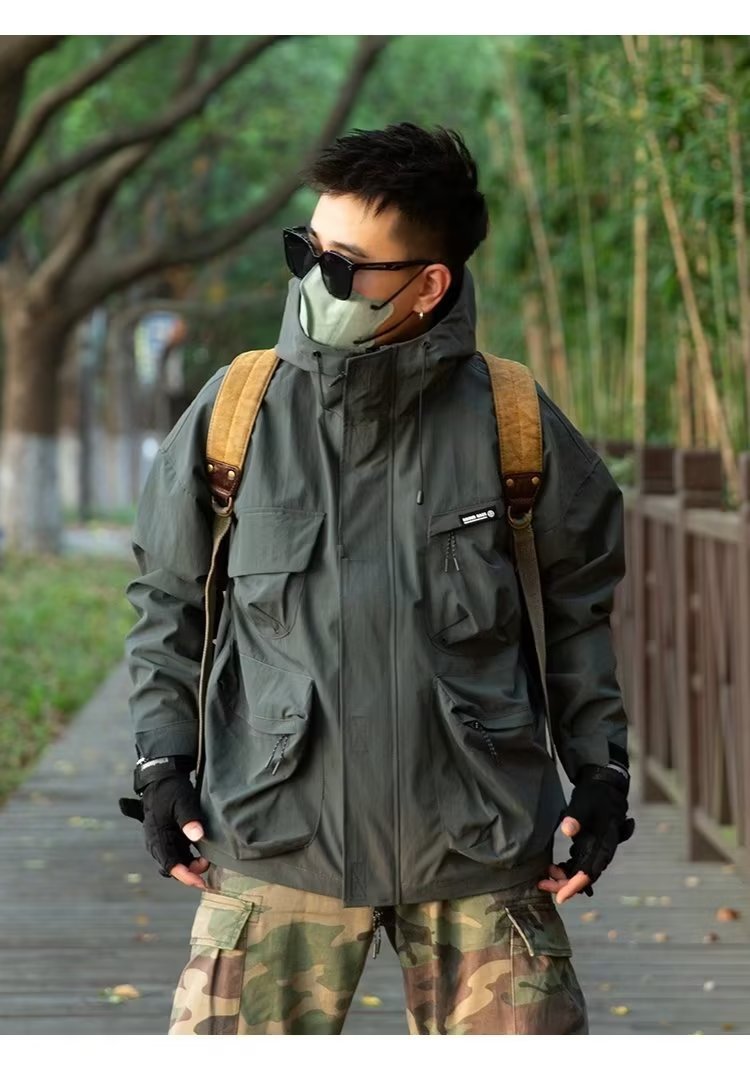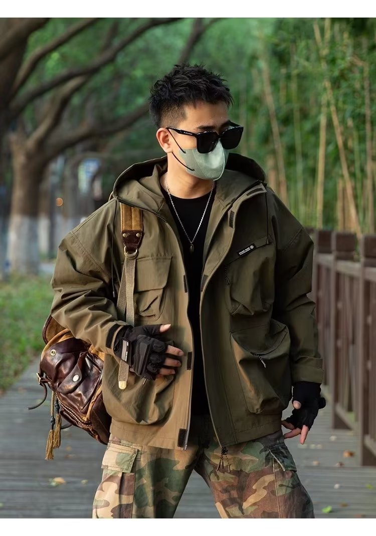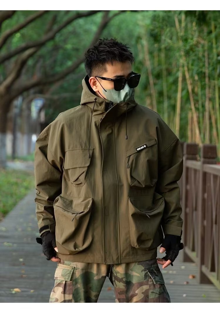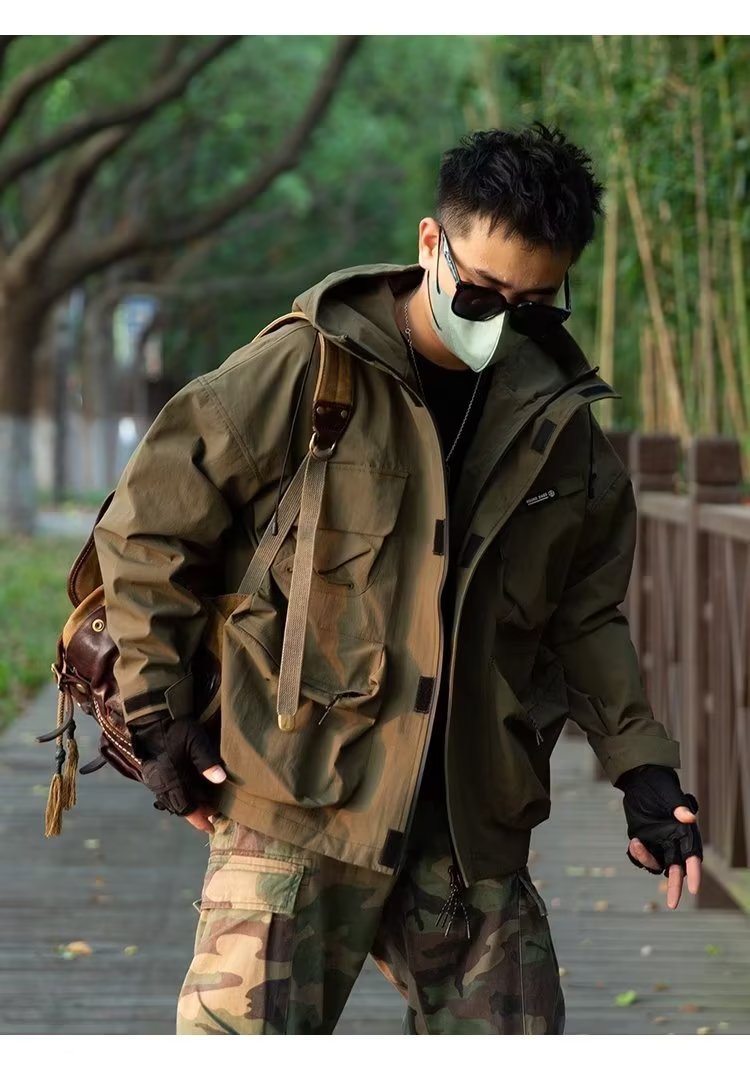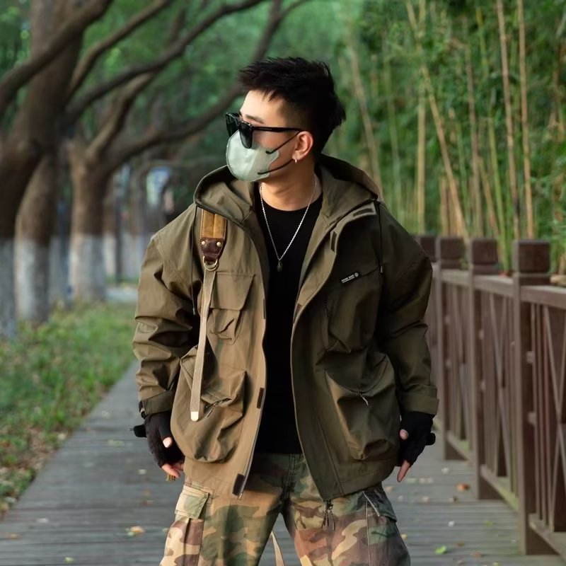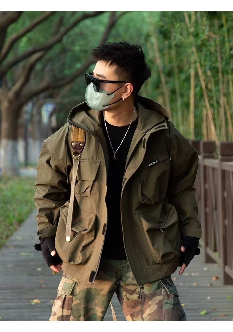 멀티 포켓 후드 재킷 재킷 빈티지 파일럿 작업복 Ruan Handsome 남성 야외 등산 방수 패션