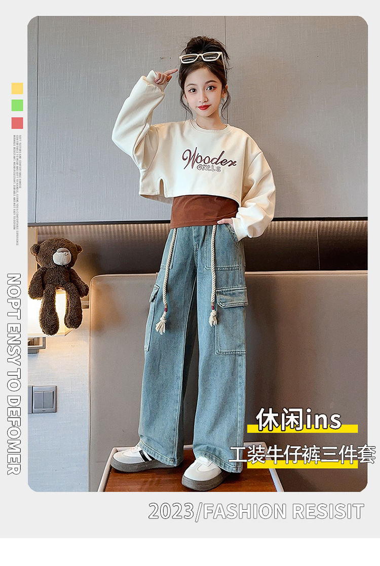 2024 여자 가을 3 피스 세트 새로운 한국어 스타일 여자 유행 조끼 운동복 작업복 청바지 인터넷 연예인 정장