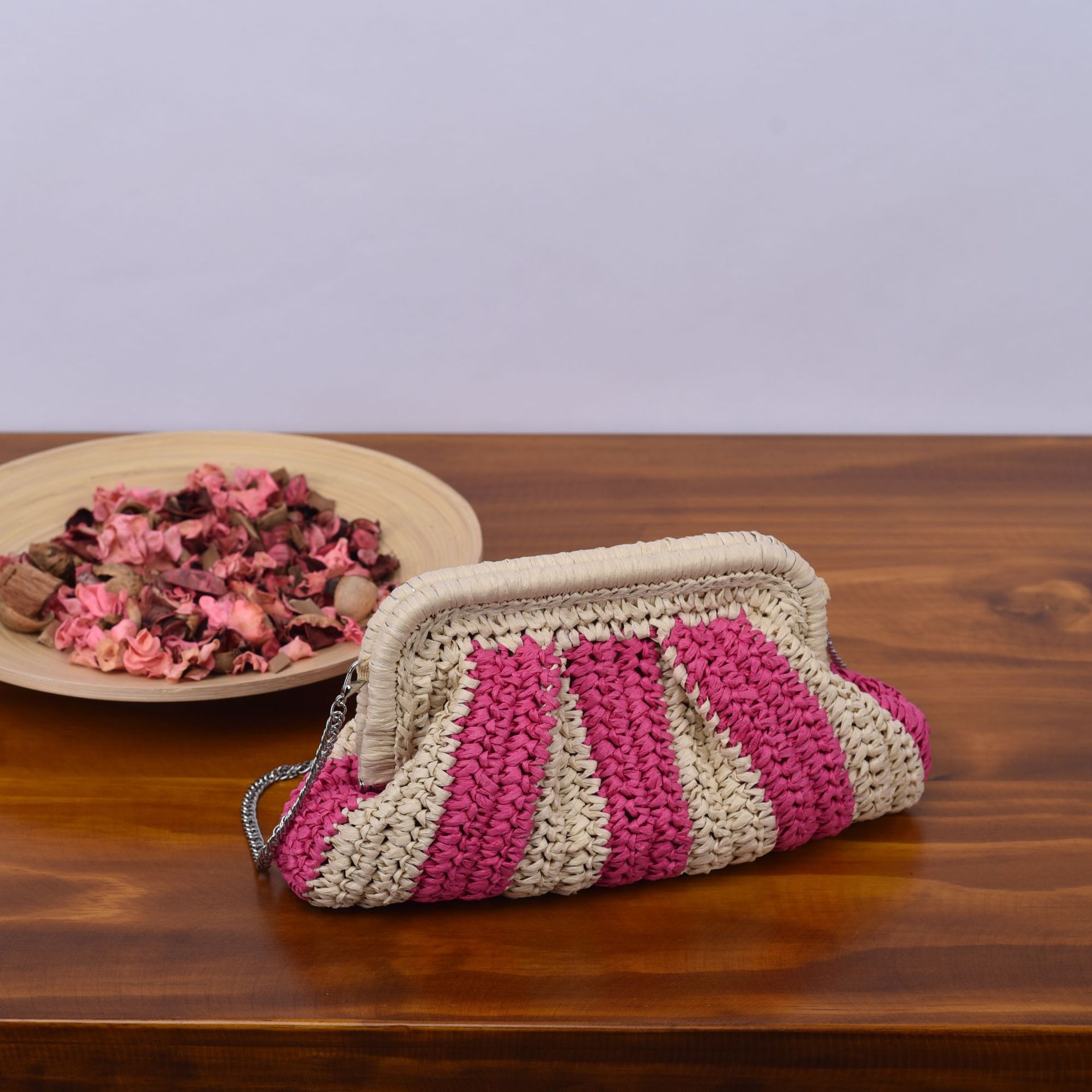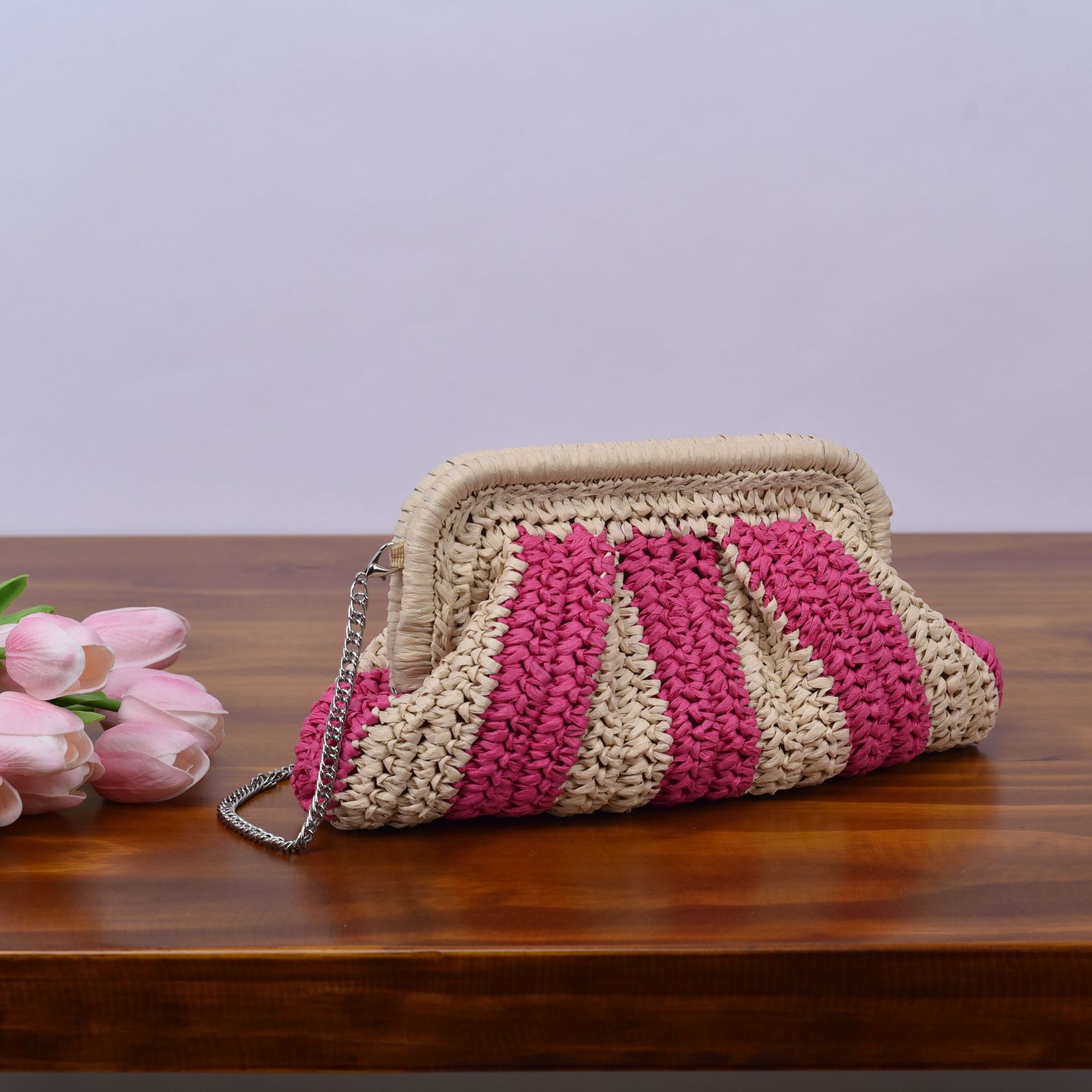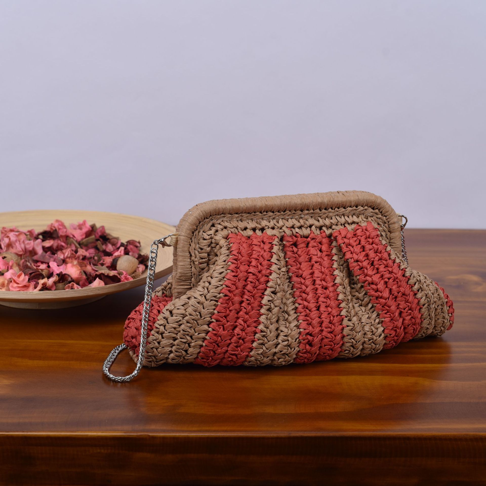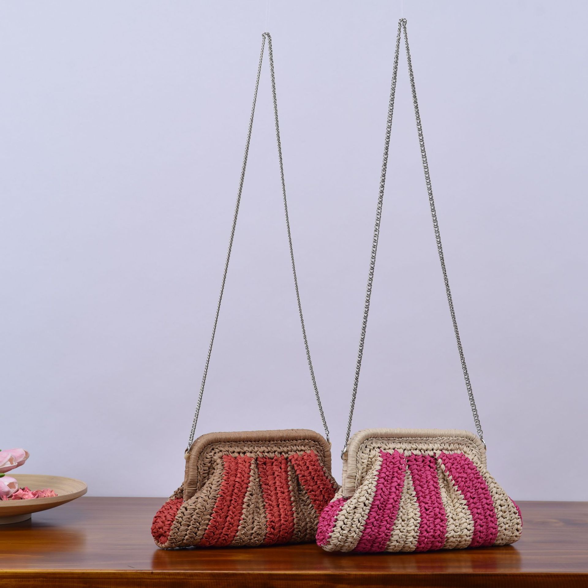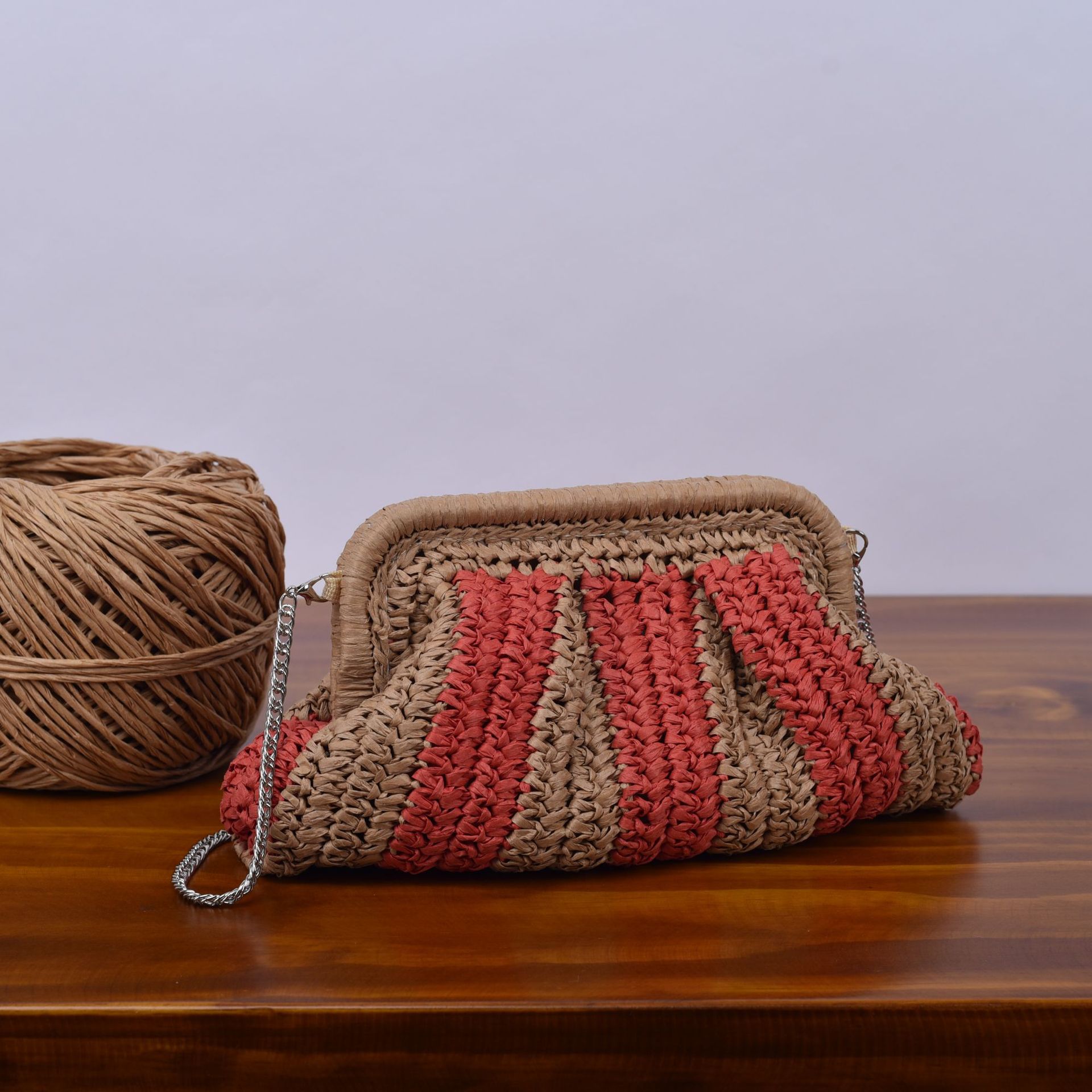 봄과 여름 새로운 수제 밀짚 줄무늬 대조 컬러 휴일 해변 파티 여성의 손으로 잡은 크로스 바디 어깨 짠 가방 공장